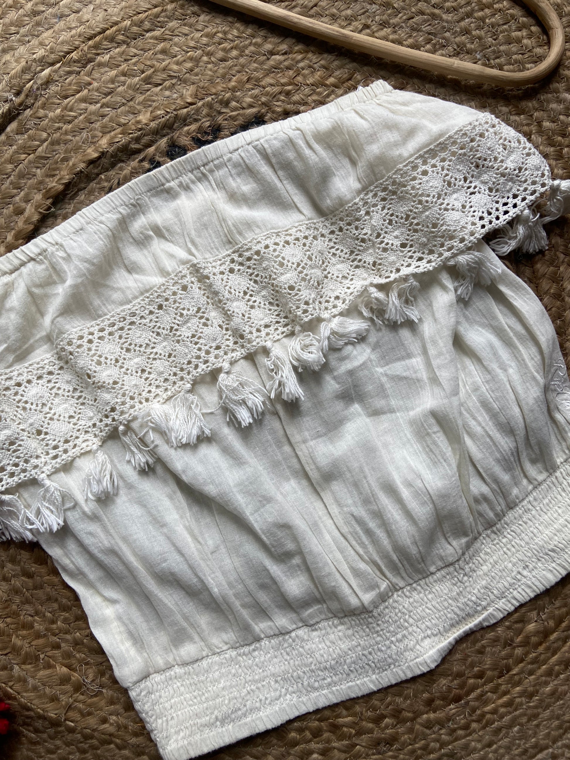 Women's Off-Shoulder White Boho Crop Top with Lace & Tassel Detailing