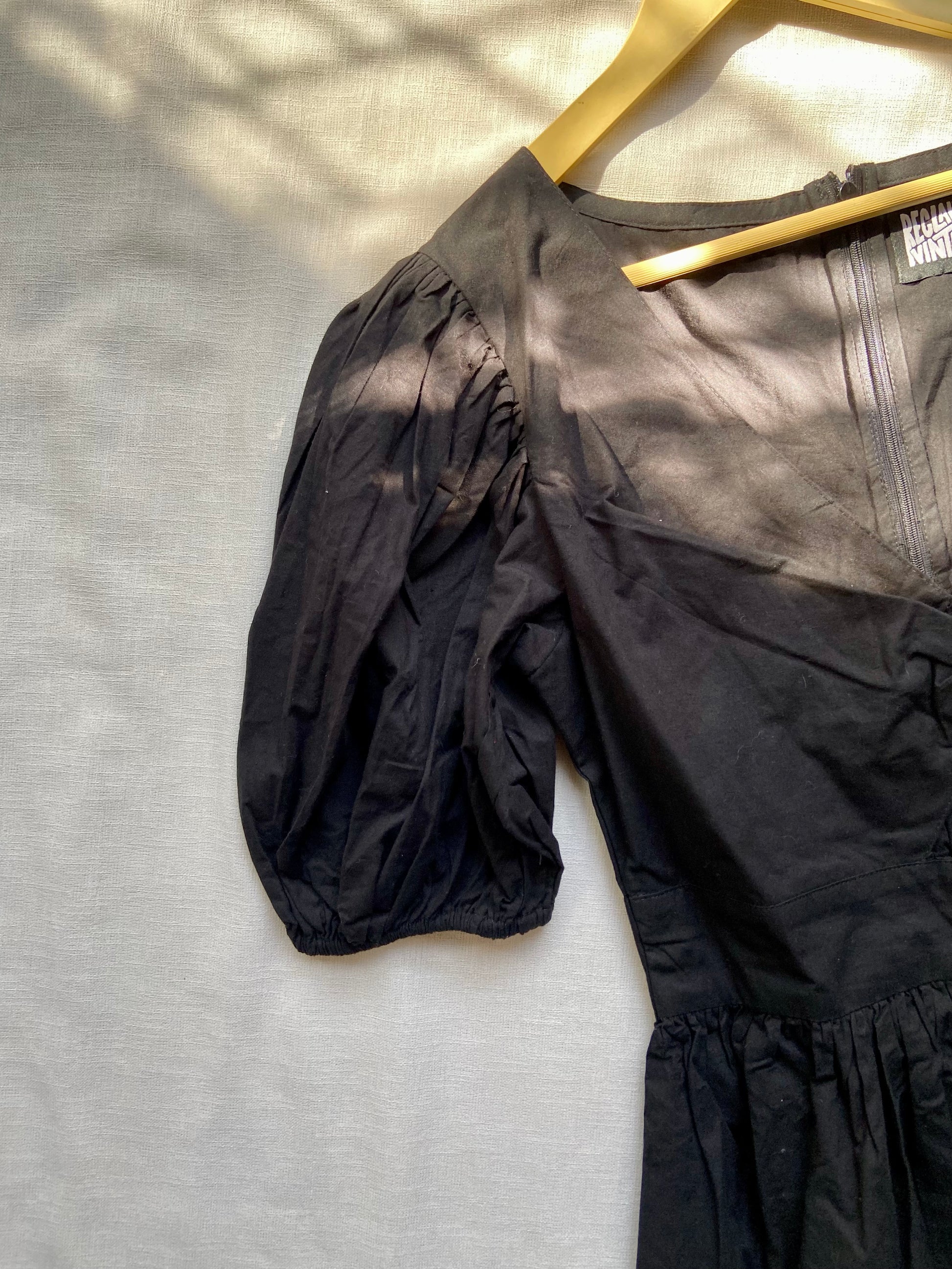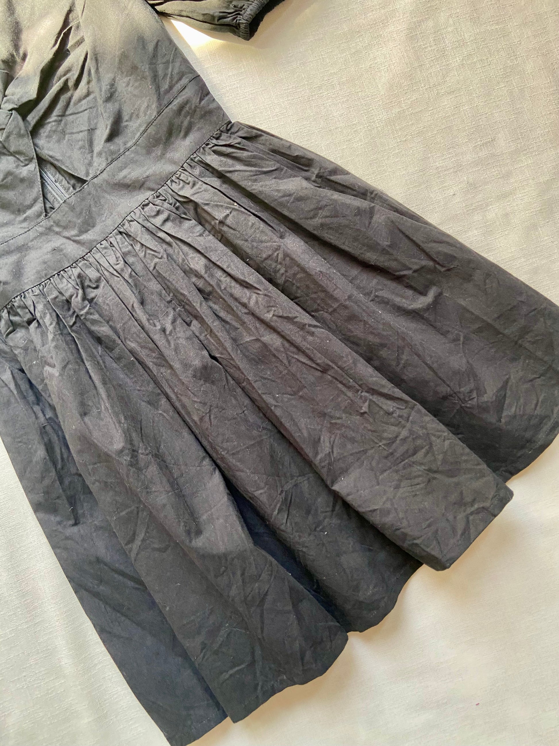 This elegant black dress features a flattering fit and flare silhouette, puff sleeves, and a deep neckline with subtle pleat detailing. Perfect for both casual and semi-formal occasions, it offers timeless style with a modern twist.