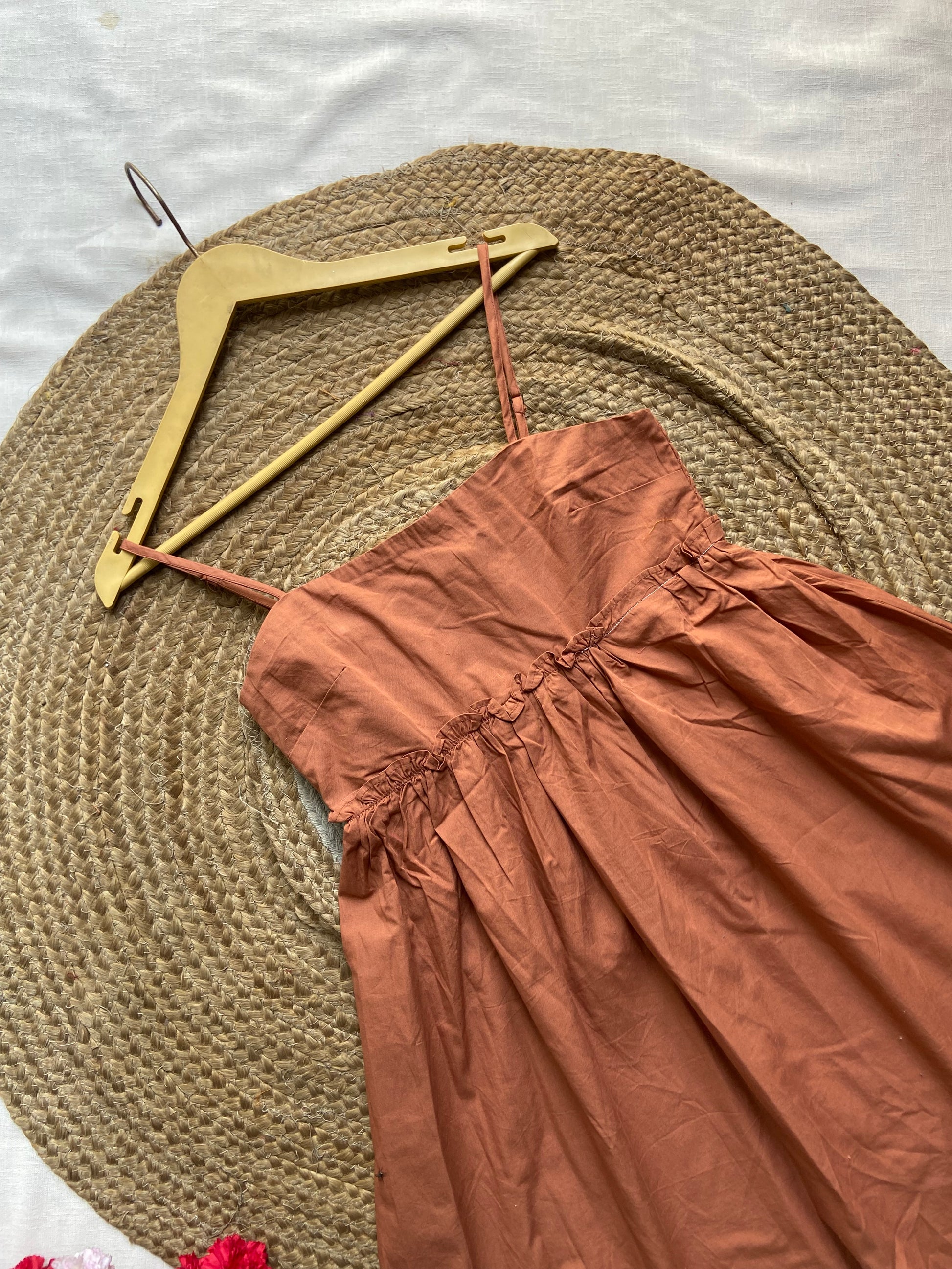 Elevate your summer style with this breezy and lightweight rust orange cotton dress. Featuring delicate spaghetti straps and a flattering gathered waistline, this A-line dress is perfect for sunny days and casual outings. Its simple yet elegant design offers both comfort and effortless charm, making it a must-have for your warm-weather wardrobe.
