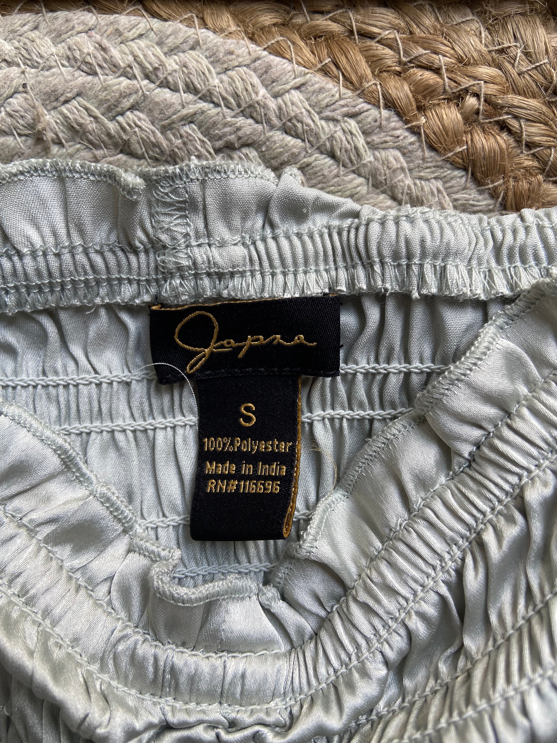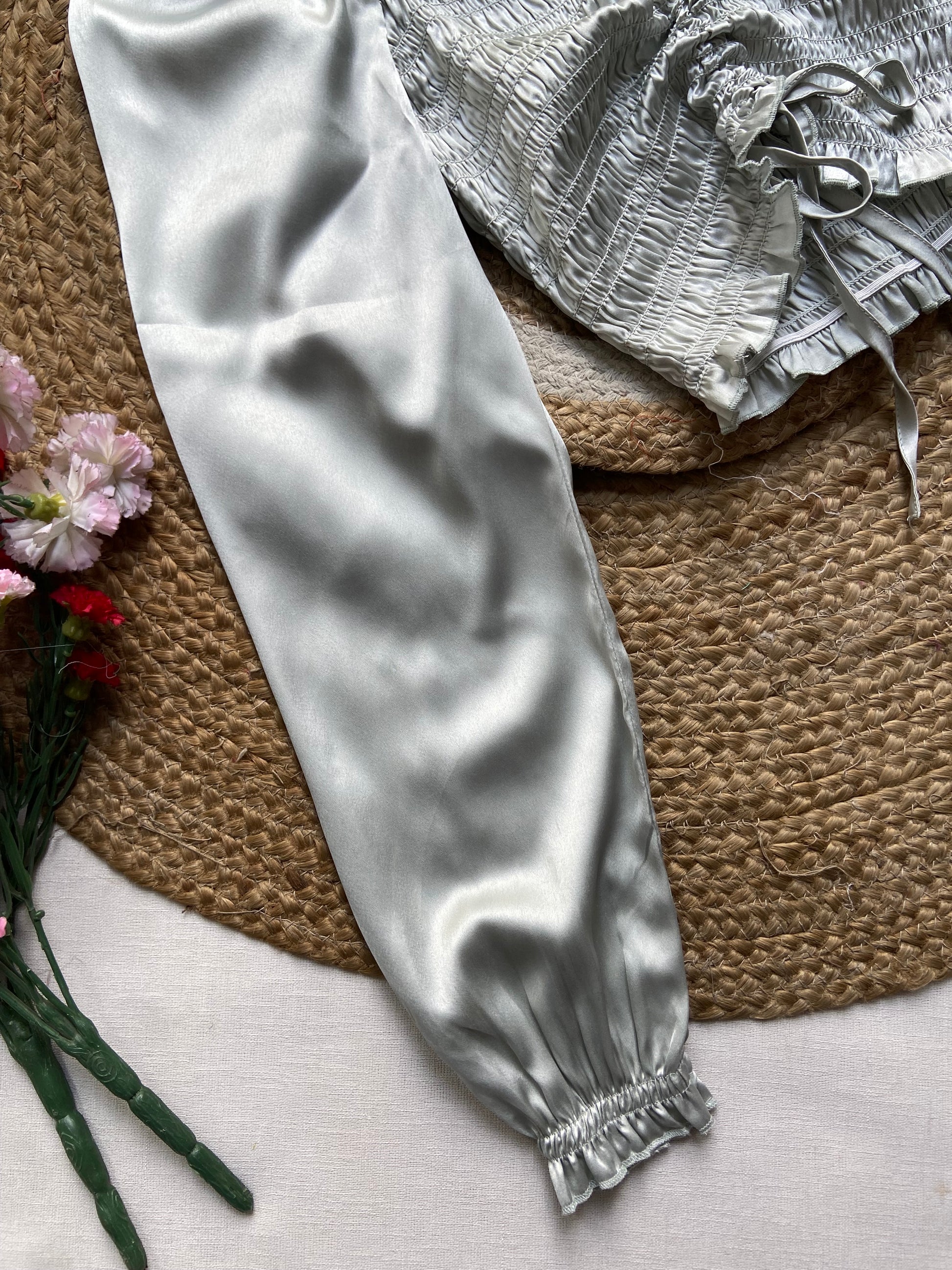 Elegant silver satin crop top featuring long puff sleeves, smocked bodice, and ruched front tie detail. Perfect for party or casual chic looks.
