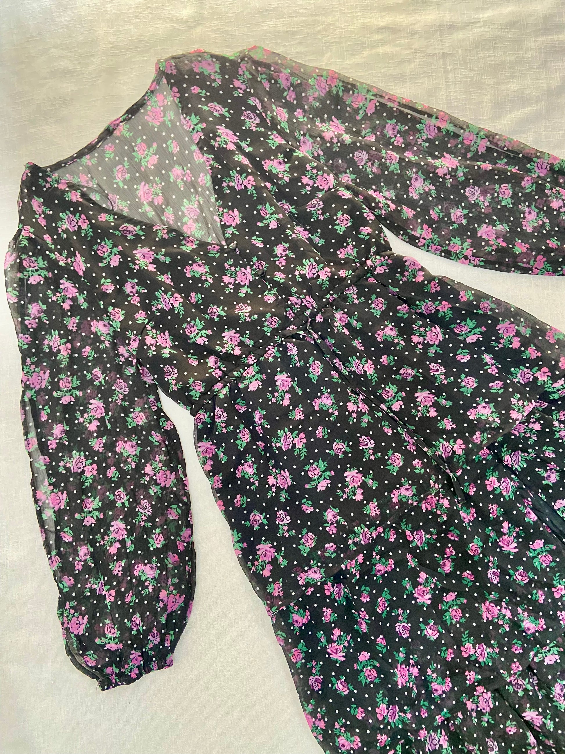 Black Floral Chiffon Midi Dress with Long Sleeves