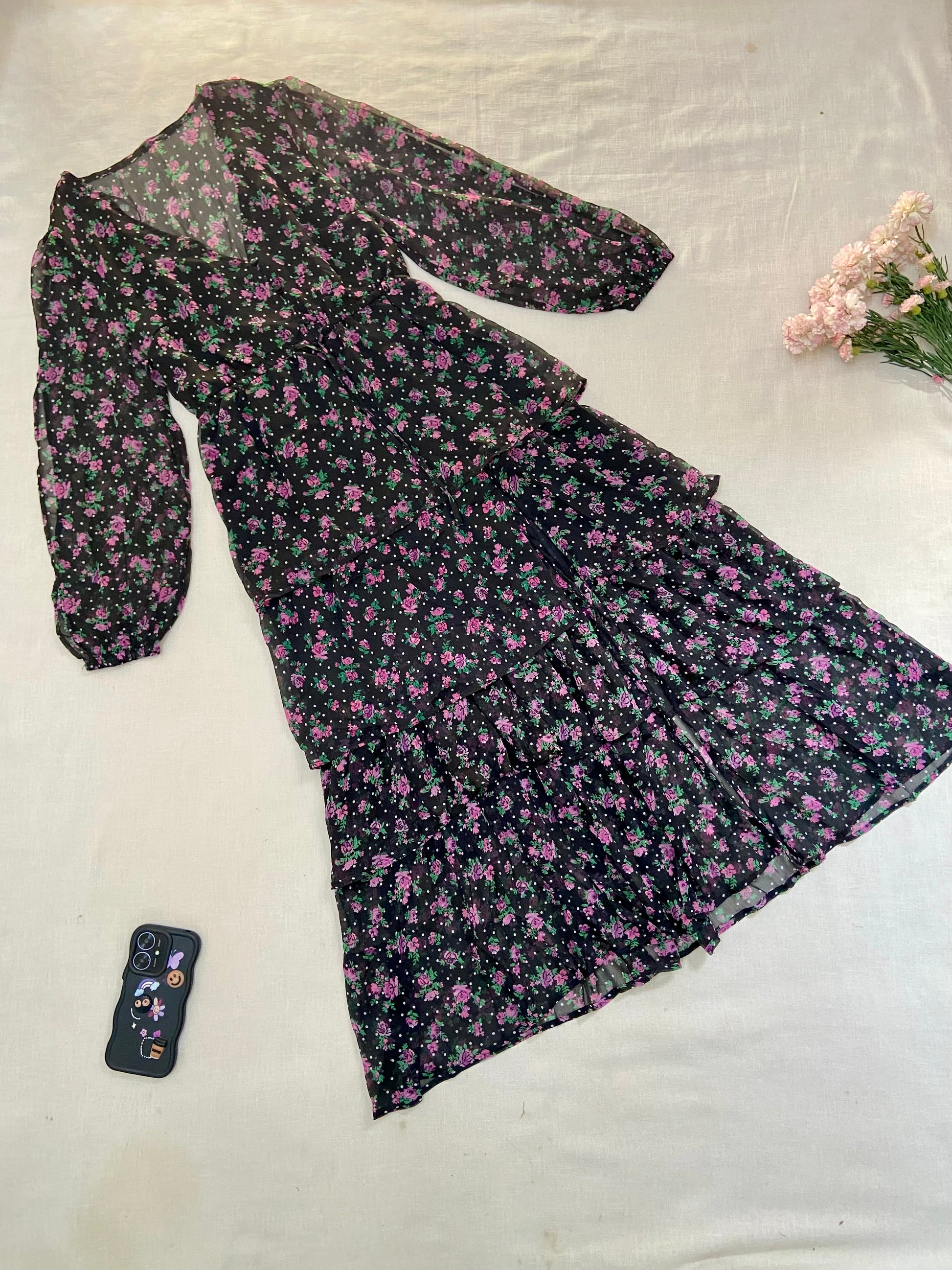 Embrace effortless elegance with this black chiffon midi dress adorned with a delicate all-over pink and purple floral print. Featuring long sheer sleeves, a flattering V-neckline, and a tiered ruffle hem, this dress flows beautifully for a feminine silhouette. The lightweight fabric and tie-waist detail add comfort and shape, making it ideal for brunches, garden parties, or casual evening outings. Pair it with heels or ankle boots for a complete look.