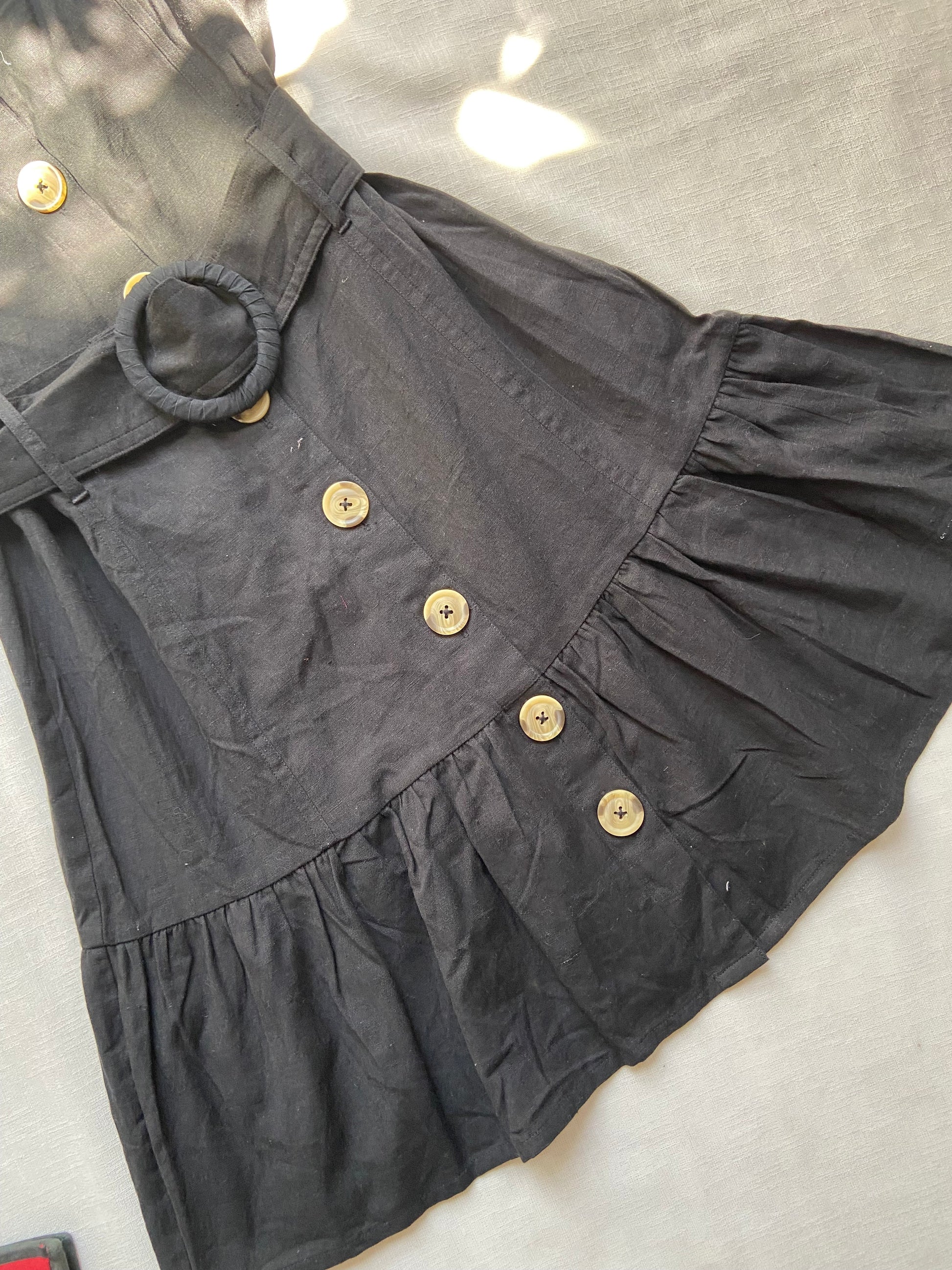 Step out in style with the City Night Belted Skater Dress. This ultra-chic mini features dramatic wide straps, a structured bodice with front flap detail, and a ruffled hem for flirty movement. The standout round buckle belt cinches the waist beautifully, while the column of buttons adds an extra dose of vintage charm. In classic black, this dress transitions seamlessly from a daytime statement to evening elegance.