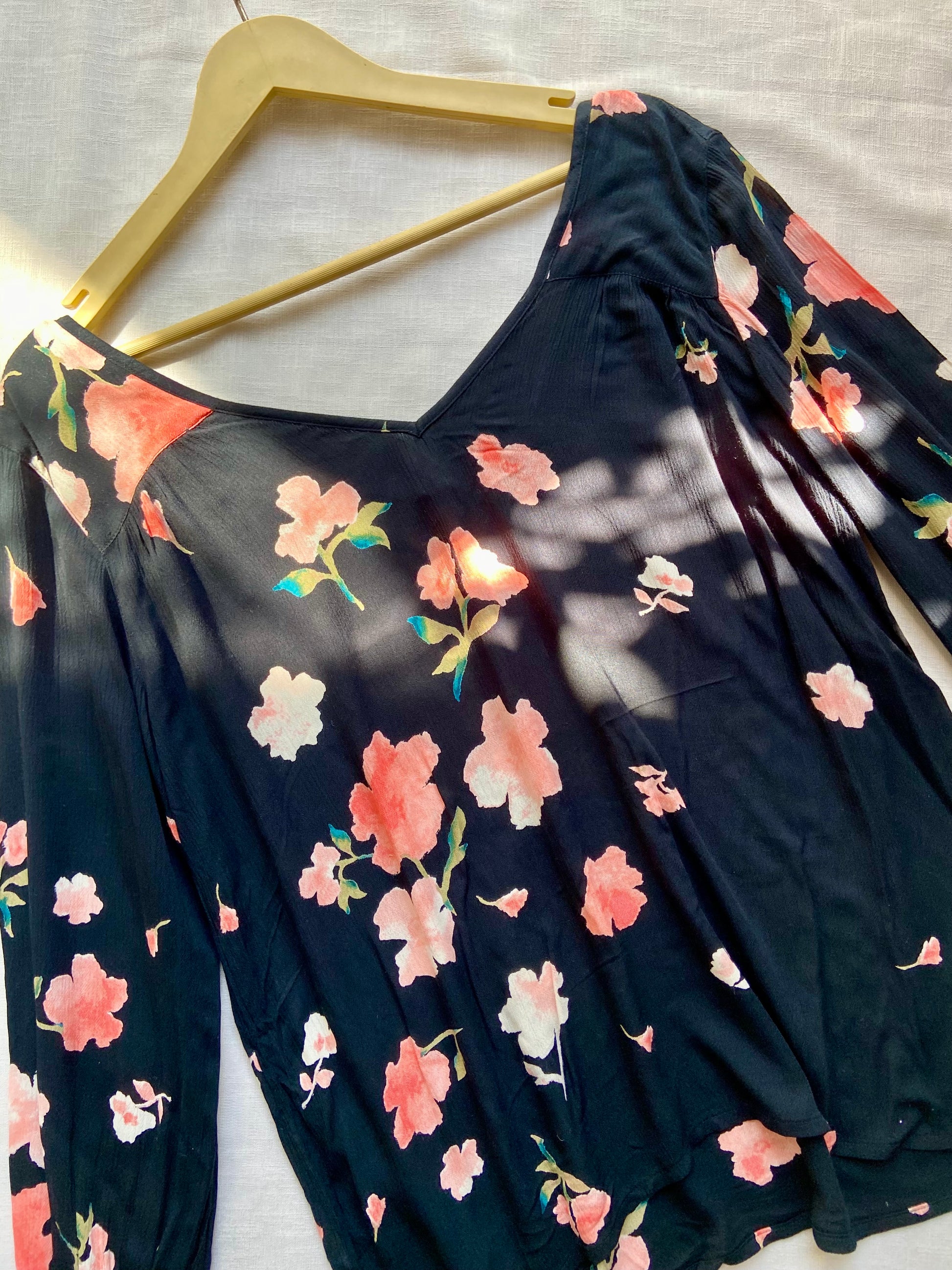 Step into effortless elegance with this navy blue floral long sleeve women’s top. Adorned with soft pink and white floral prints, it features a relaxed fit with gathered sleeve cuffs for a touch of feminine charm. The lightweight, breathable fabric makes it perfect for both casual outings and semi-formal occasions. Pair it with jeans, skirts, or trousers for a versatile look that blends comfort with chic style. A must-have floral top for every season.