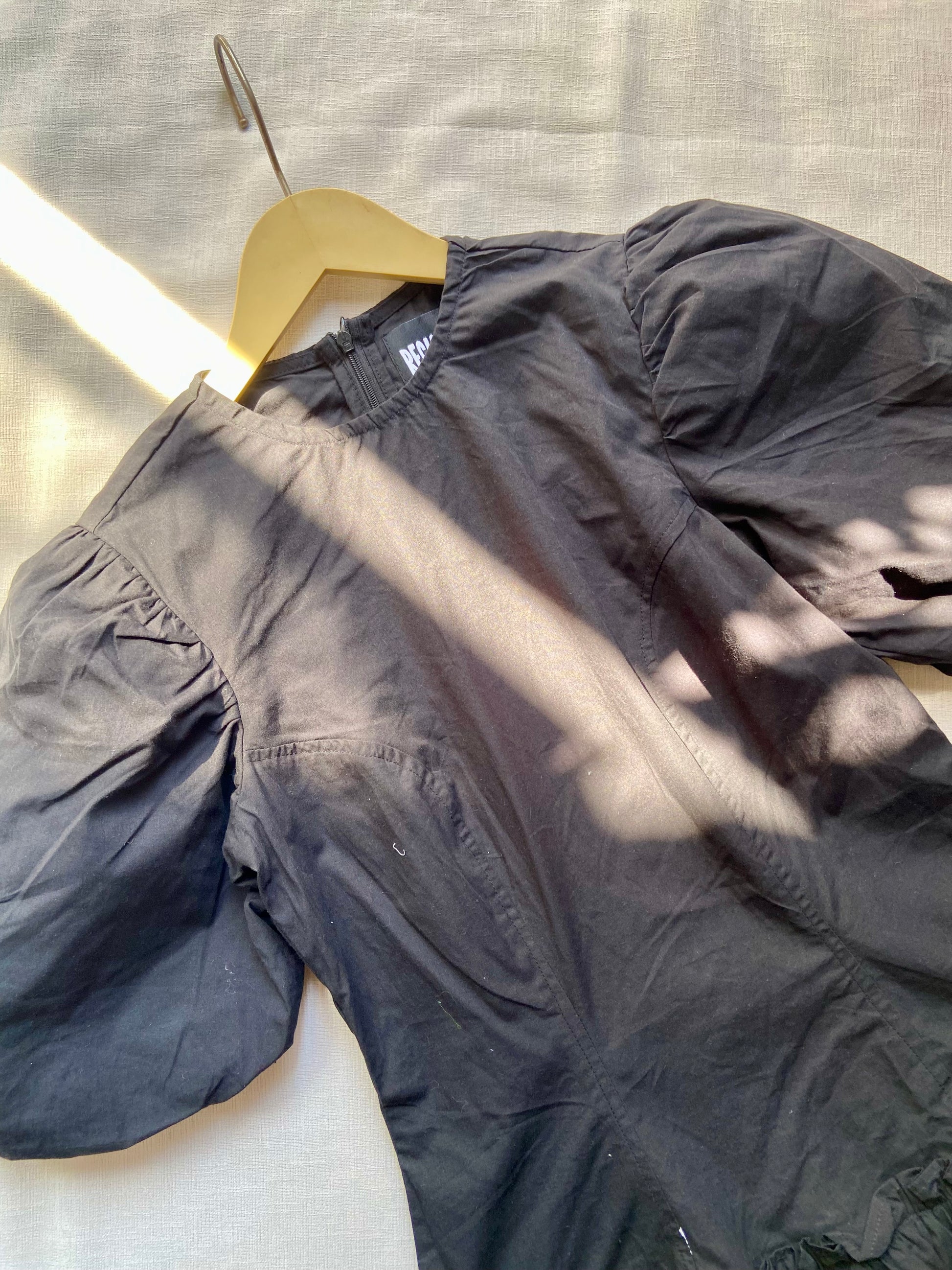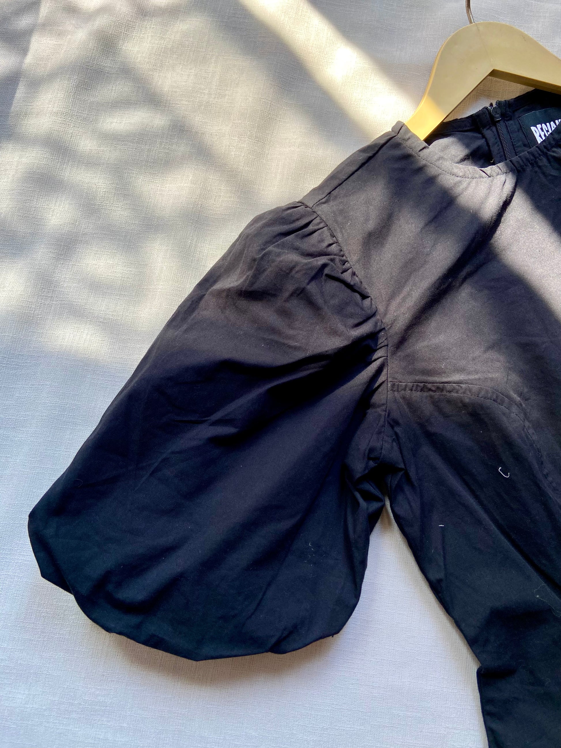 Elegant and playful, this black dress features dramatic puff sleeves and a tiered ruffle hem for a flattering silhouette. Perfect for parties or casual chic looks, it blends style and comfort effortlessly.