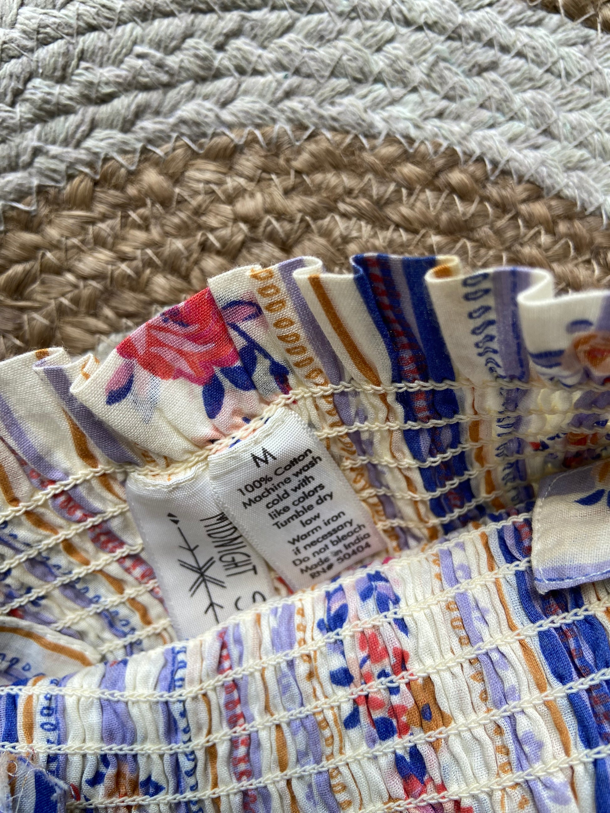 Brighten up your summer style with this playful and vibrant floral cami top. Featuring a smocked bodice for a flattering and flexible fit, this sleeveless top is adorned with multicolored floral and stripe patterns. The peplum hem adds a feminine flair, making it perfect for both casual days out and festive summer gatherings. Soft shoulder straps and breathable fabric ensure all-day comfort.