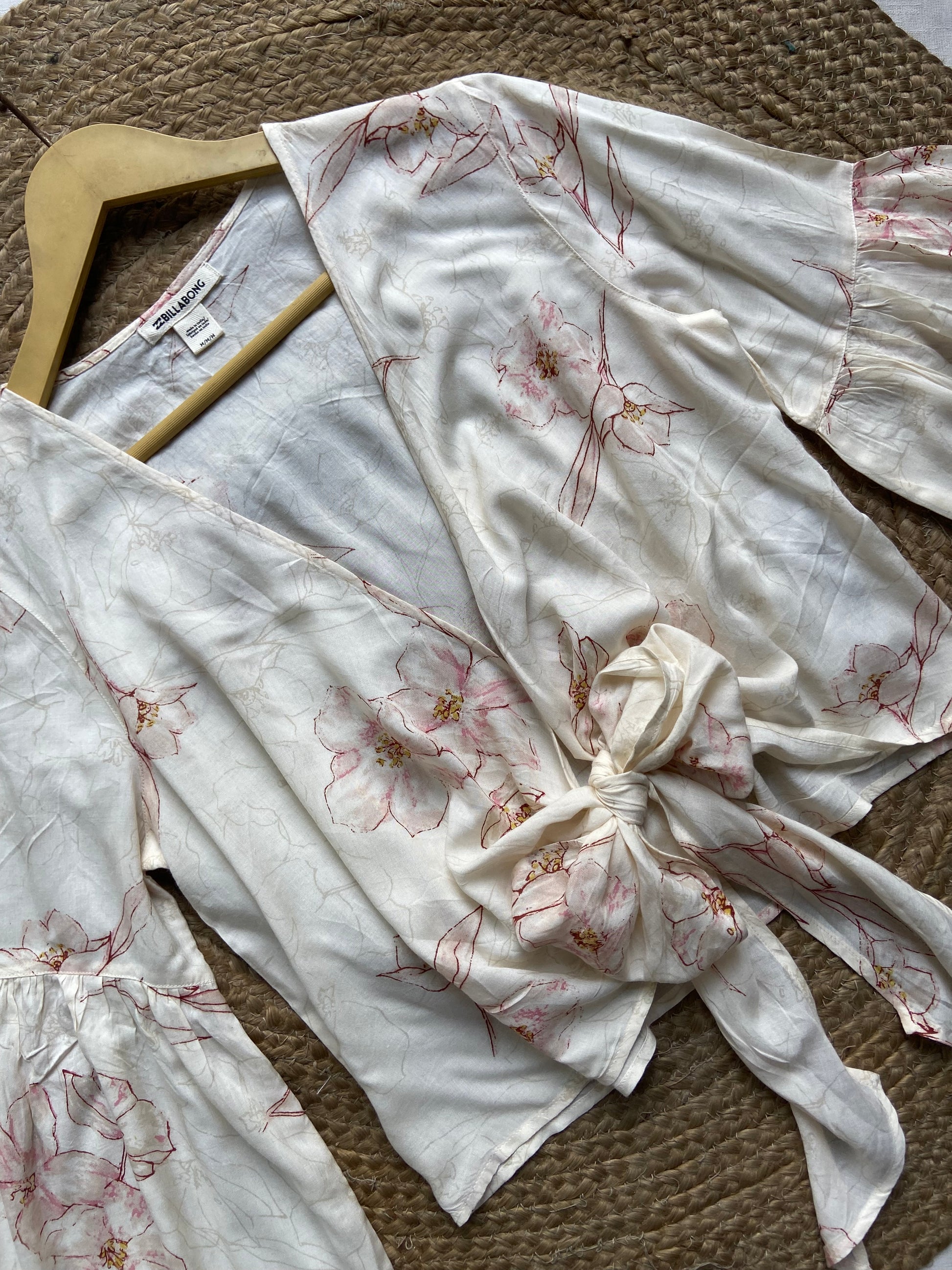 Bring elegance to your wardrobe with this floral satin wrap top, featuring soft pink blossoms on a creamy base. The design includes full balloon sleeves with gathered cuffs and a flattering tie-front closure that cinches at the waist for a graceful silhouette. Made from smooth, lightweight satin fabric, this top is perfect for brunches, date nights, or festive gatherings. Pair it with high-waisted trousers, skirts, or denim for a romantic and chic ensemble.