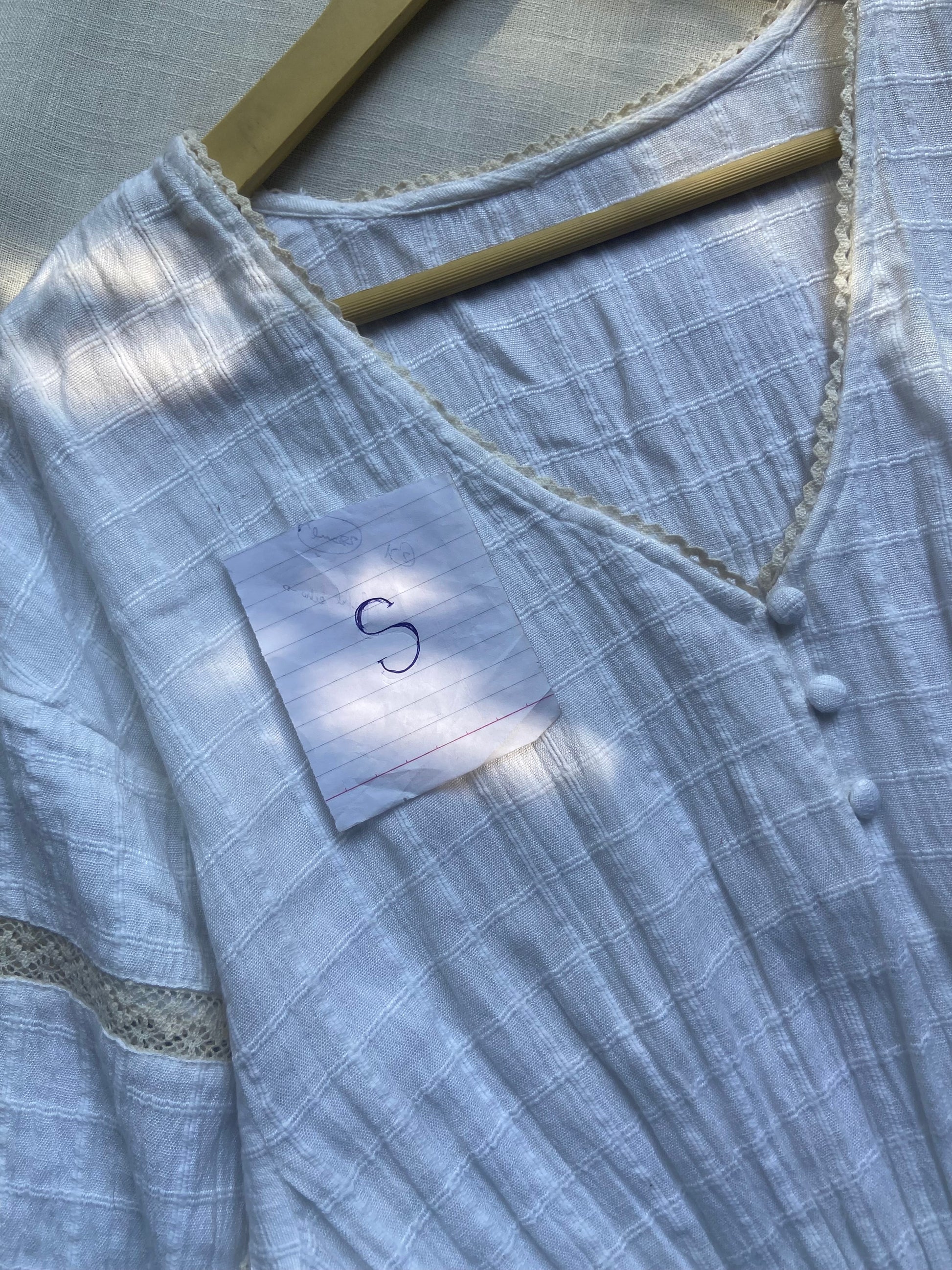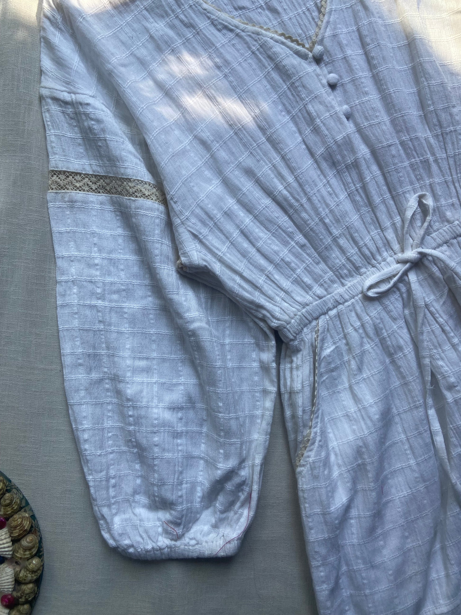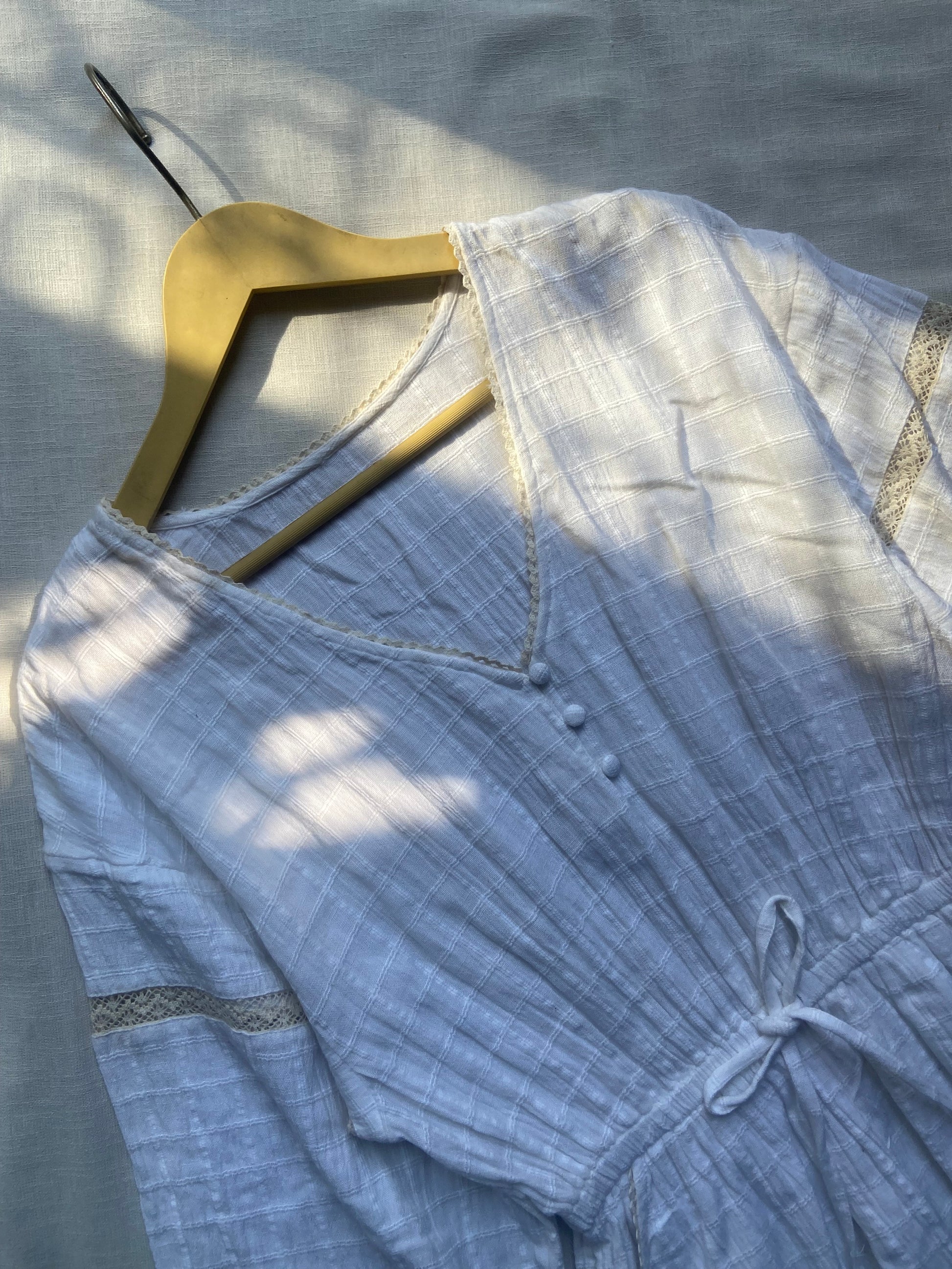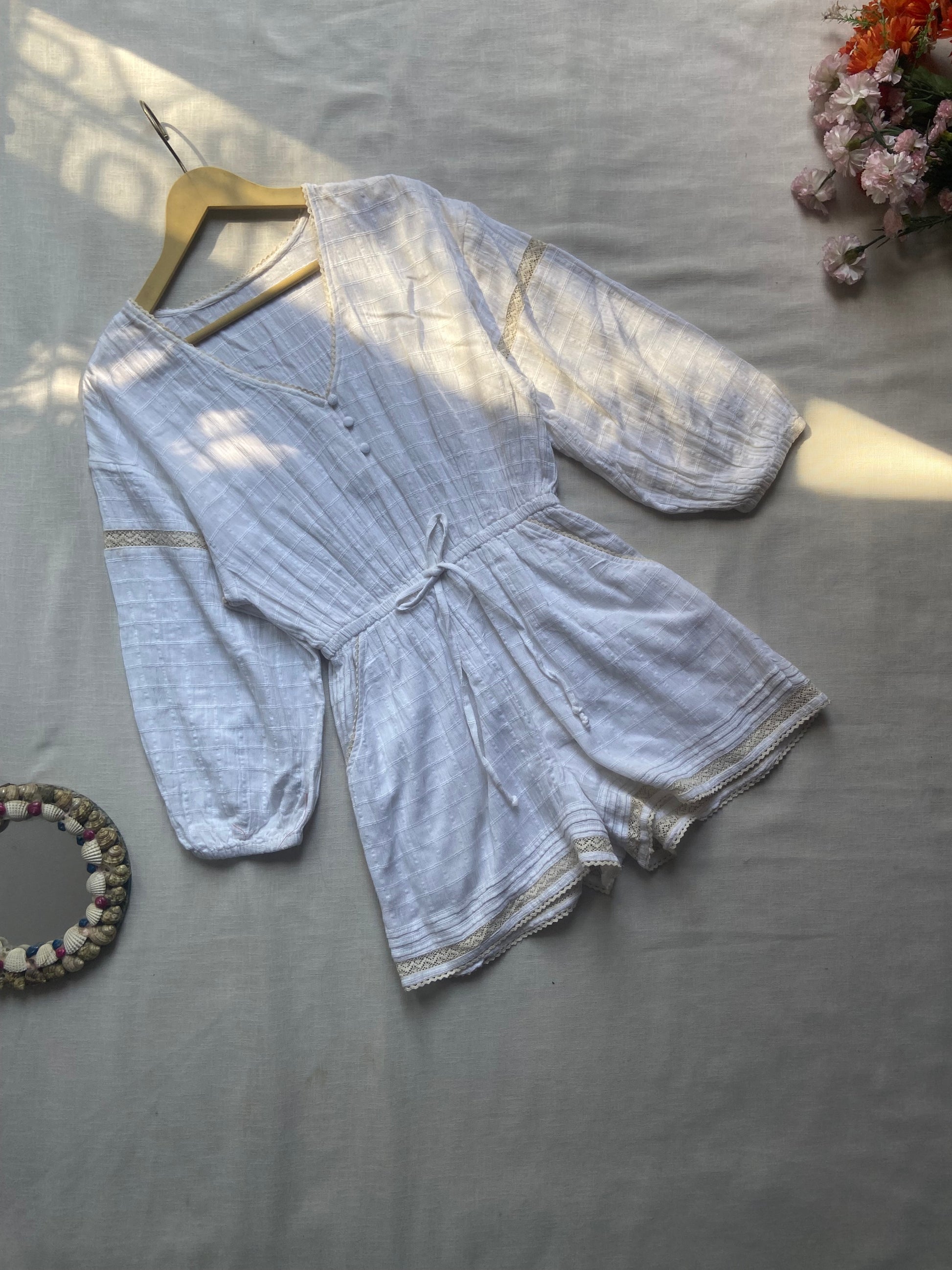 Stay cool and stylish in this breezy white romper featuring subtle textured fabric, delicate lace trim, and a flattering drawstring waist. With 3/4 sleeves and a V-neckline adorned with button details, it's perfect for beach days, casual brunches, or summer getaways. Light, airy, and effortlessly chic!