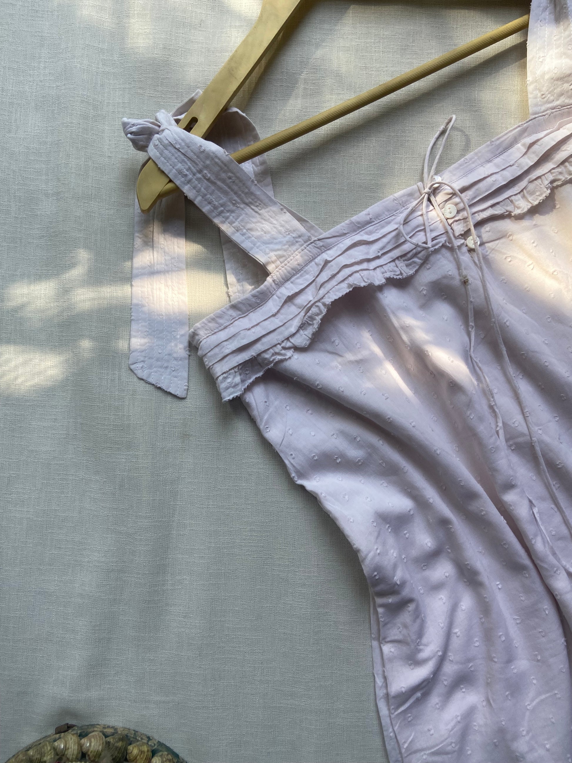 Step into vintage-inspired charm with this white sleeveless dress featuring tie-up shoulder straps, a delicate textured fabric, and tiered ruffle hem detailing. The soft gathers and pintuck accents add a playful yet elegant vibe, perfect for picnics, day events, or a summer stroll. A breezy must-have for warm-weather days.