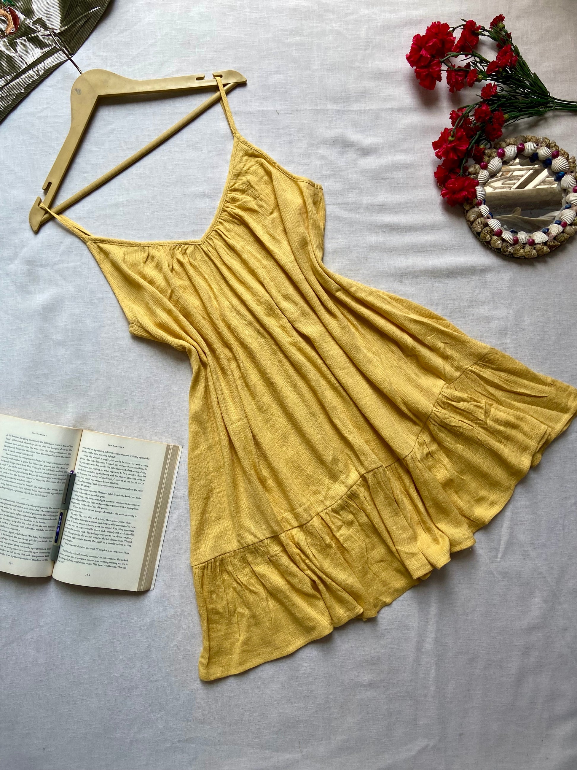 Keep it cool and breezy with this lightweight yellow summer dress. Designed with thin spaghetti straps and a flowy, tiered hem, this dress offers a relaxed and airy fit perfect for warm days. The soft fabric and gathered detailing add a touch of effortless charm, making it ideal for beach outings, casual hangouts, or vacation getaways. Style it with flip-flops or a straw hat for the ultimate sunny-day look.