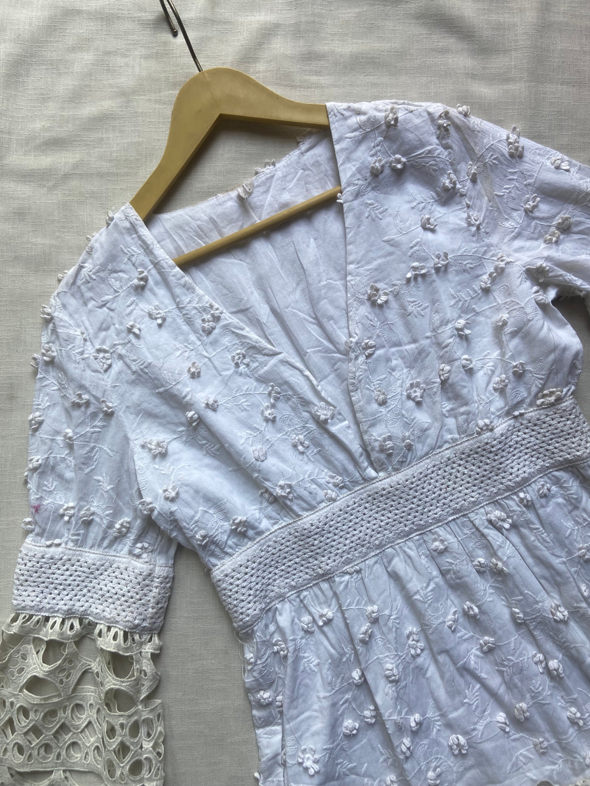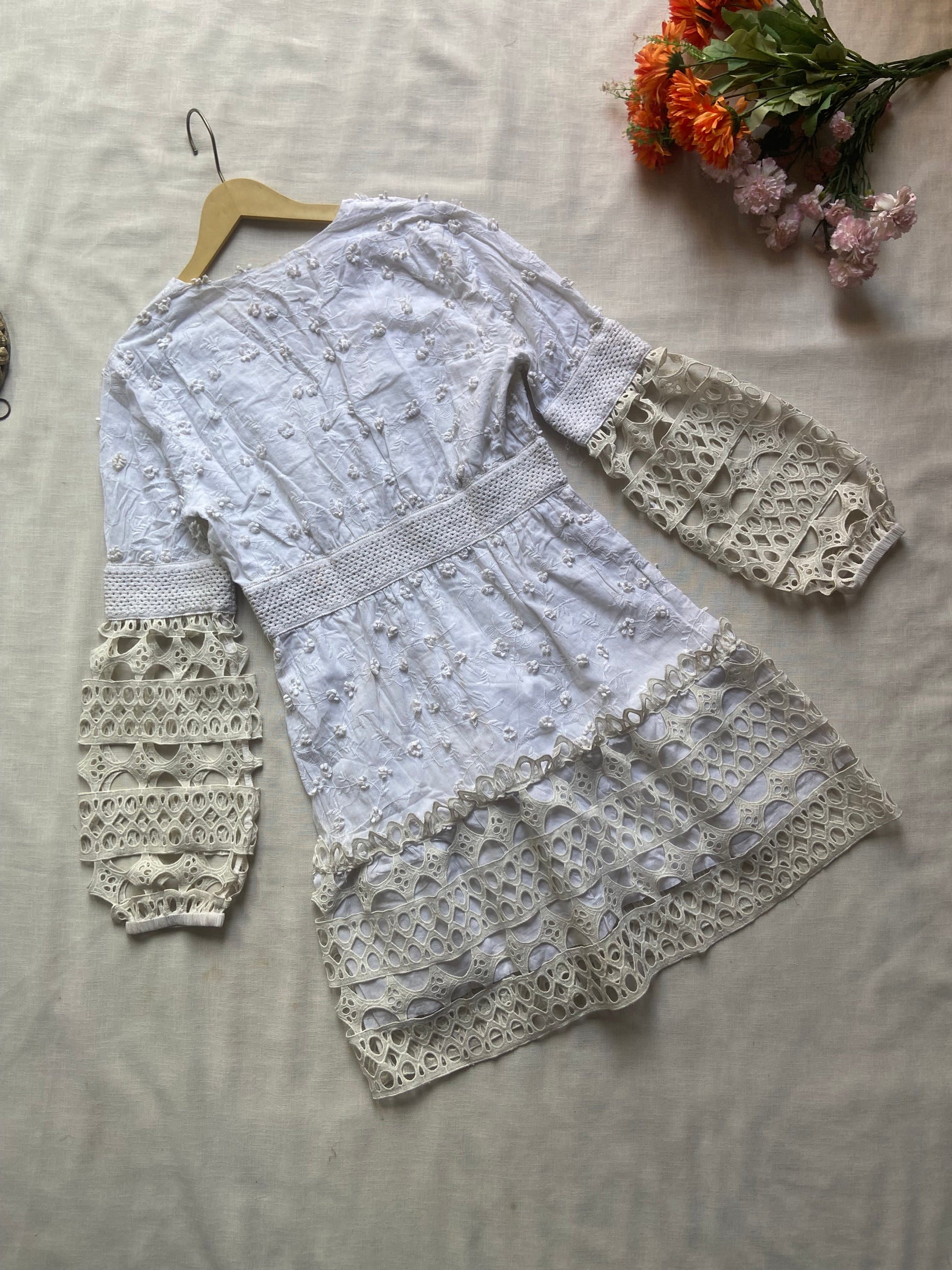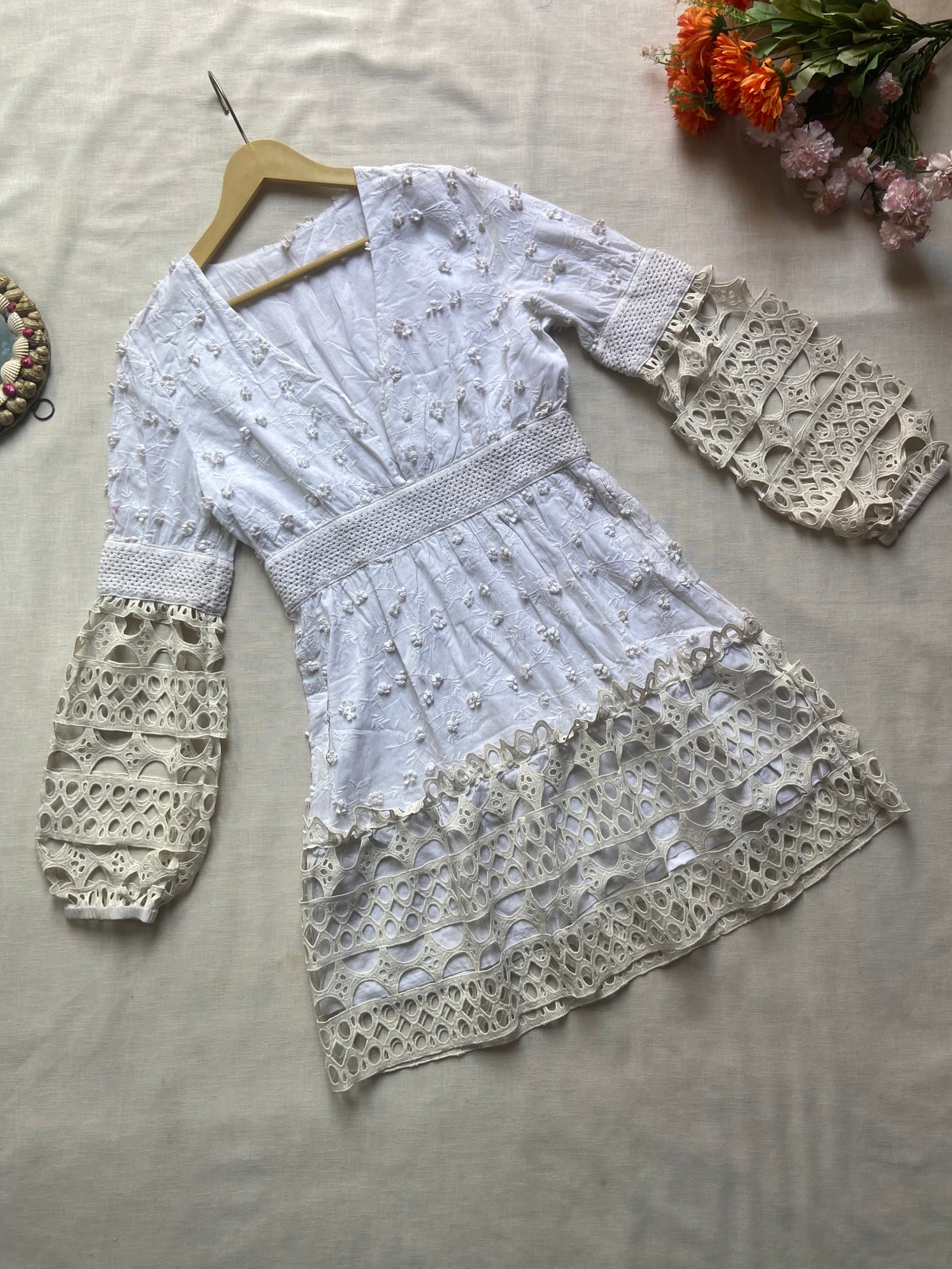 White Embroidered Boho Mini Dress with Crochet Lace Sleeves