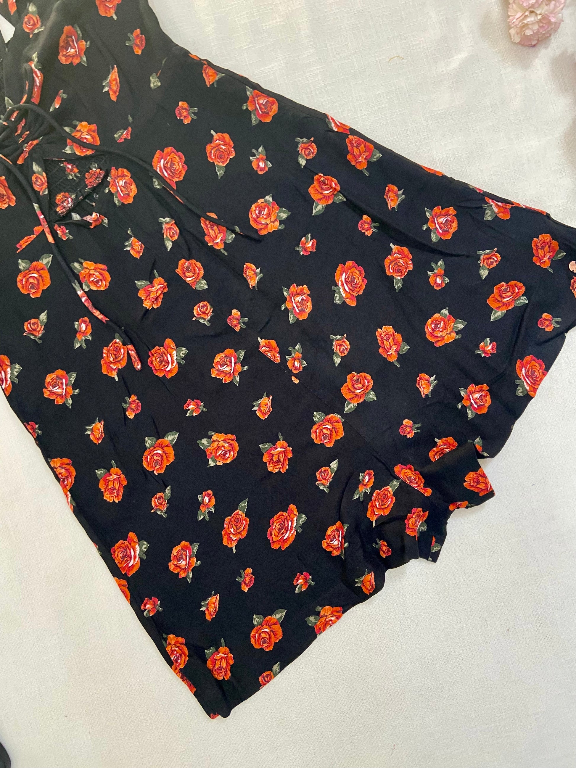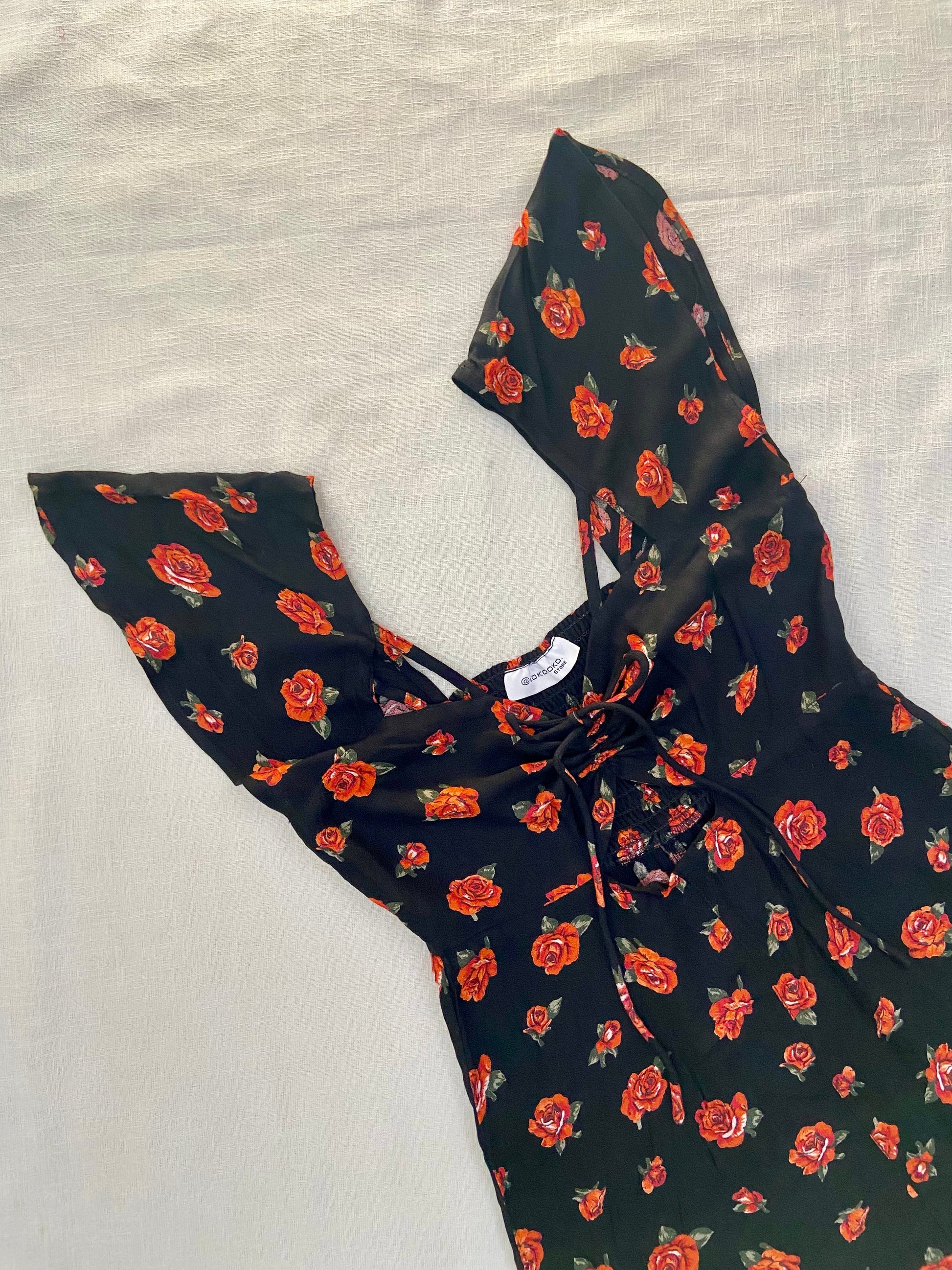 Stay stylish and comfortable in this chic black romper adorned with vibrant red rose prints. Featuring a flattering lace-up front detail and flutter sleeves, this piece adds a flirty, feminine touch to your casual wardrobe. The flowy shorts offer ease of movement, making it perfect for brunches, day outings, or summer dates. Pair it with sneakers or sandals for an effortlessly cute look.