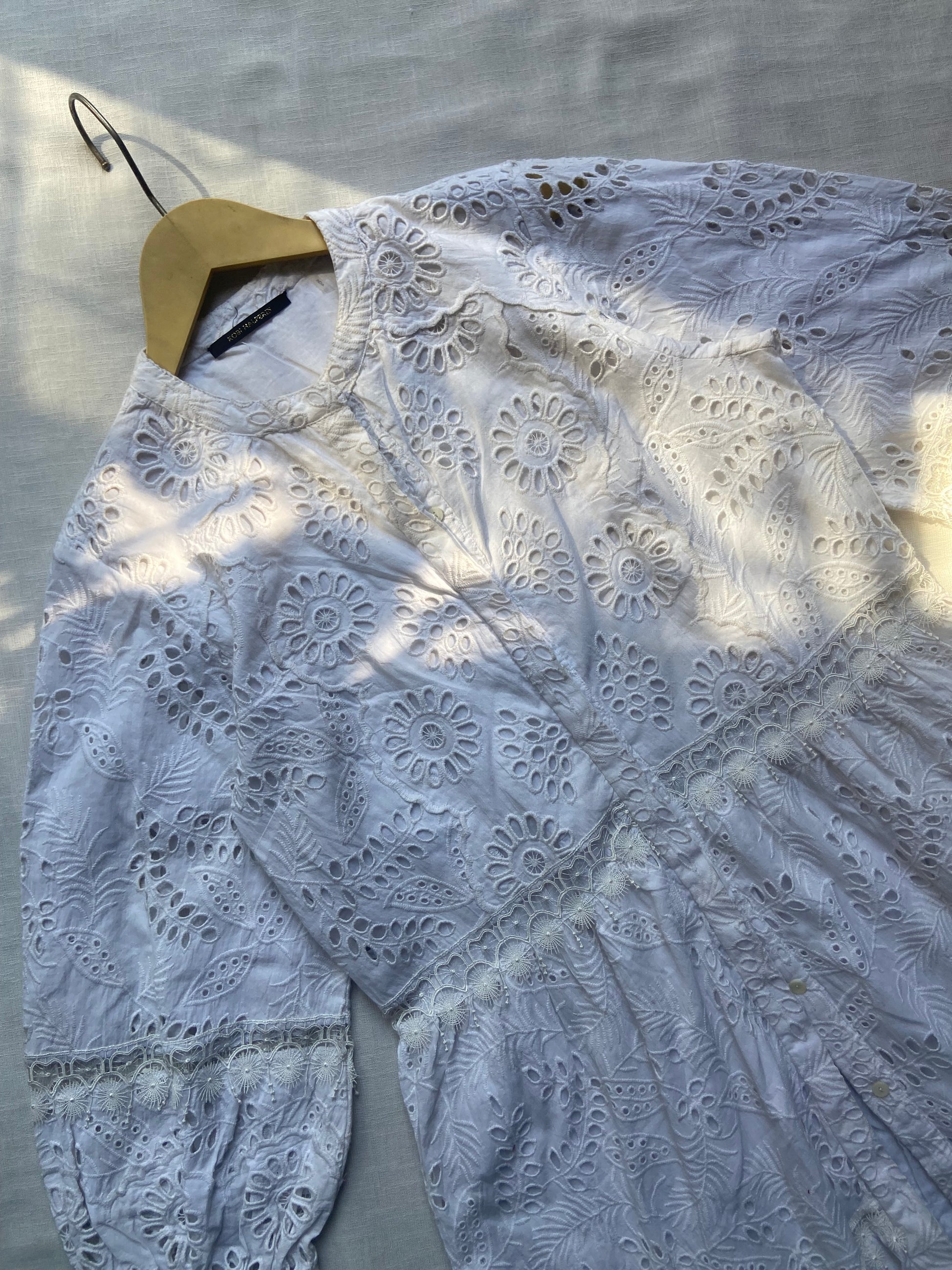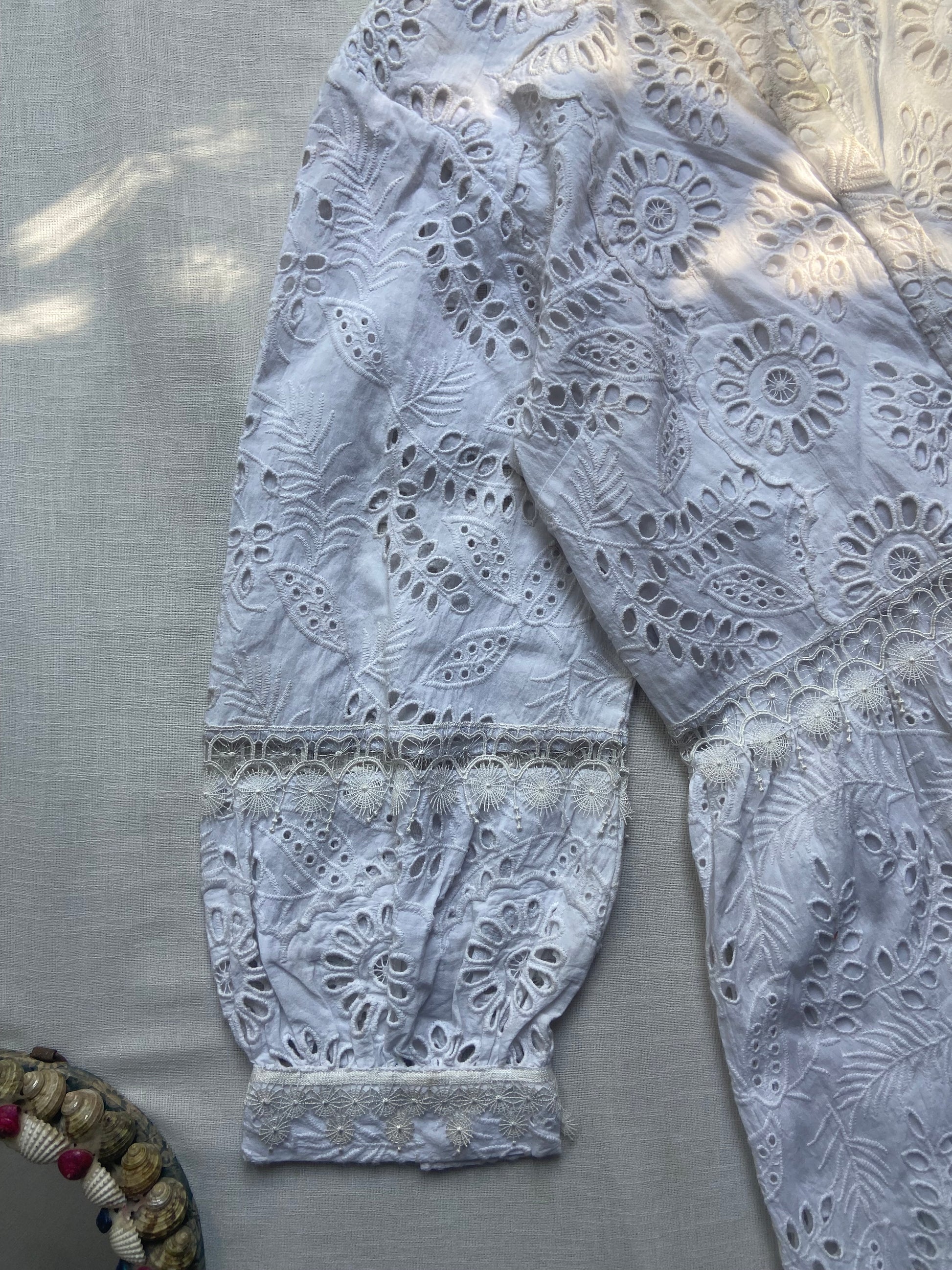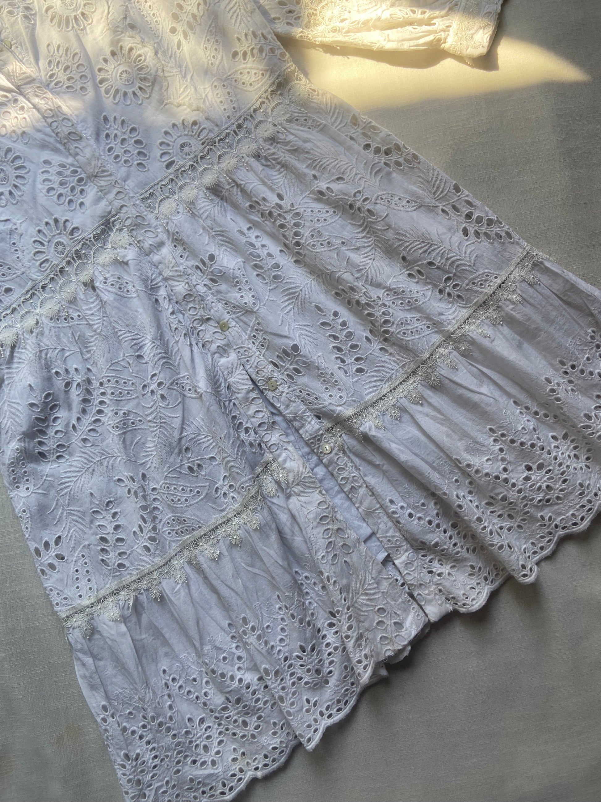 Stay effortlessly elegant in this white cotton dress featuring intricate eyelet embroidery throughout. Designed with a button-down front, tiered skirt, and 3/4 sleeves with lace detailing, it offers a breezy, feminine look. Perfect for summer brunches, beach getaways, or casual outings. Breathable, lightweight, and timeless.