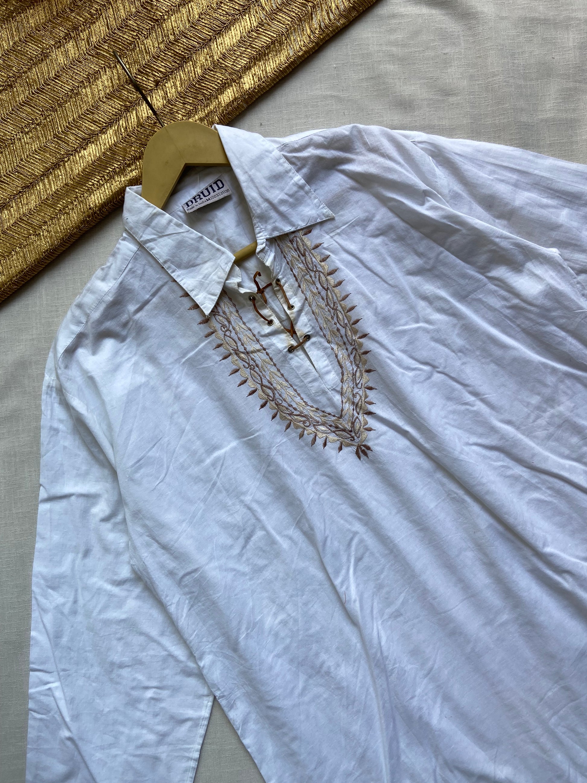 A stylish white kurta featuring delicate beige embroidery around the neckline and a classic collar. Made from lightweight fabric, perfect for casual and traditional occasions. Comfortable full sleeves and a relaxed fit for everyday wear.