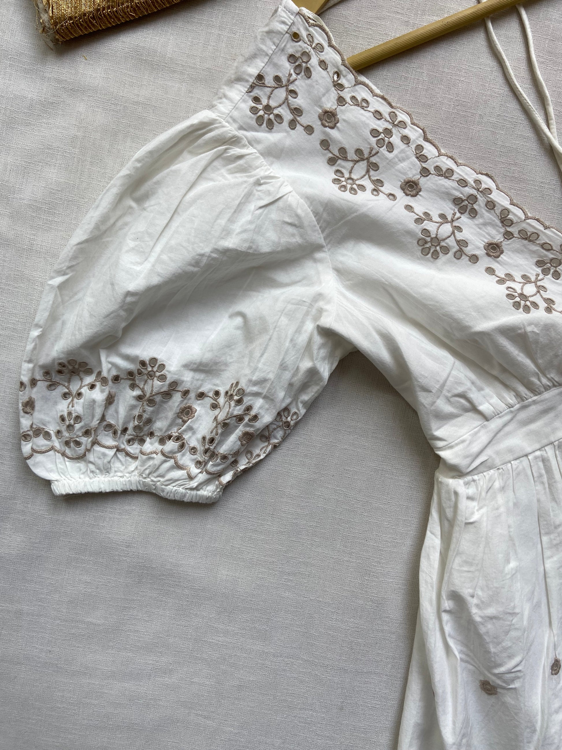 A charming white dress featuring delicate floral embroidery along the neckline, sleeves, and hem. Designed with puff sleeves and a flattering V-neckline, this dress offers a feminine and elegant look perfect for casual outings or special occasions. Made from lightweight fabric for comfort and style.