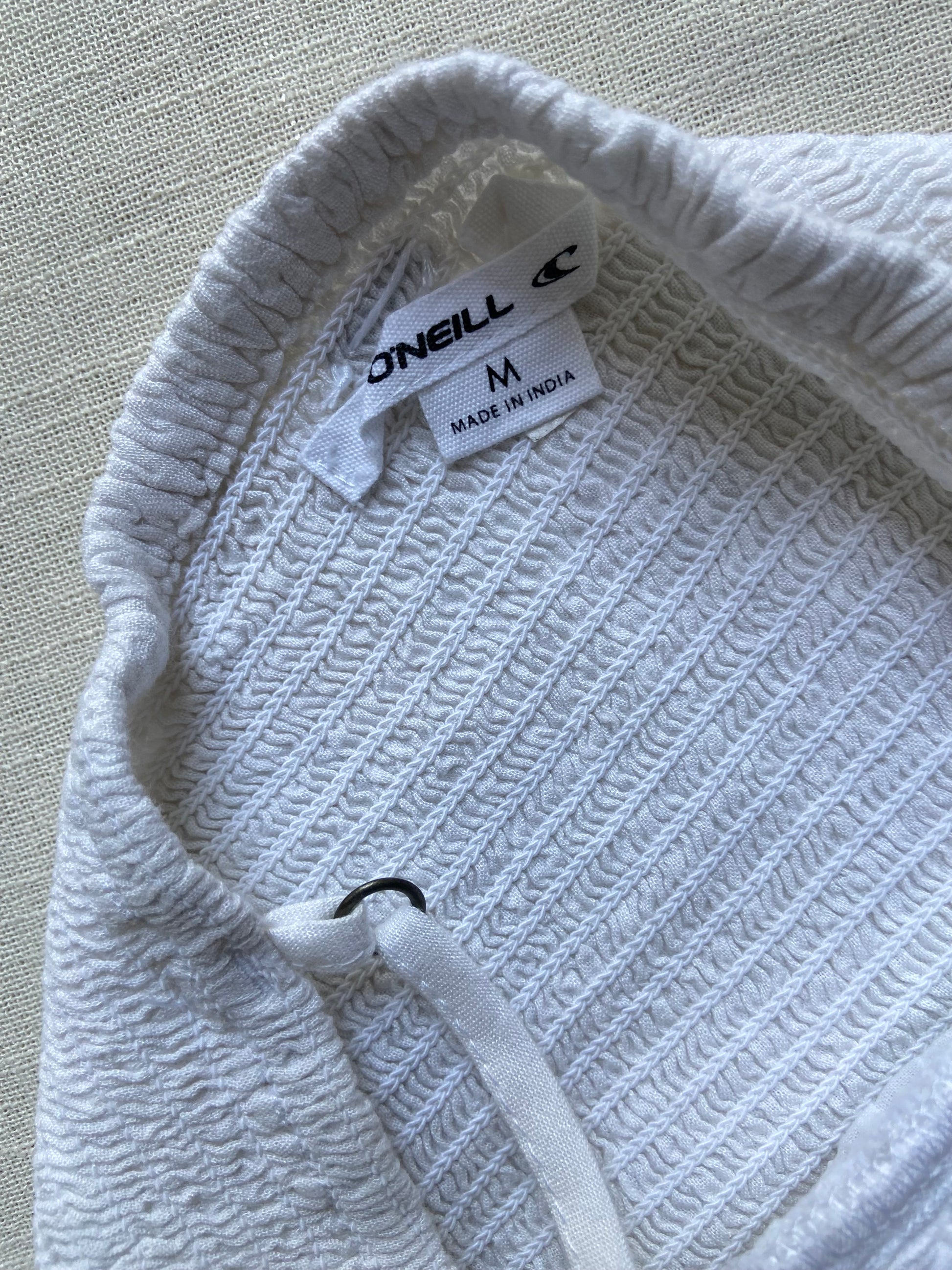 A beautiful white midi dress featuring delicate lace detailing on the bodice, adjustable spaghetti straps, and a flowy ruffled hem. Perfect for summer outings or casual events.