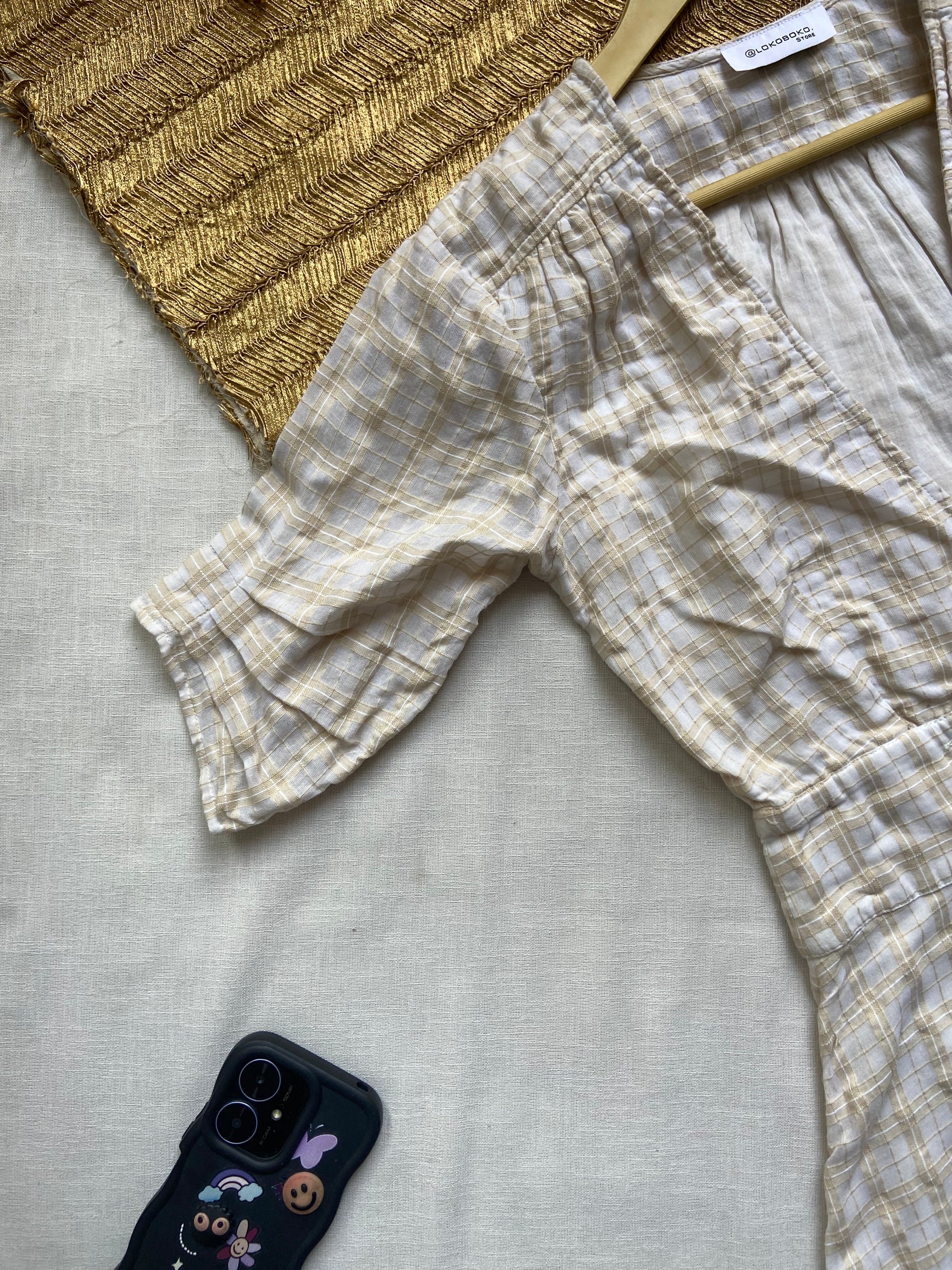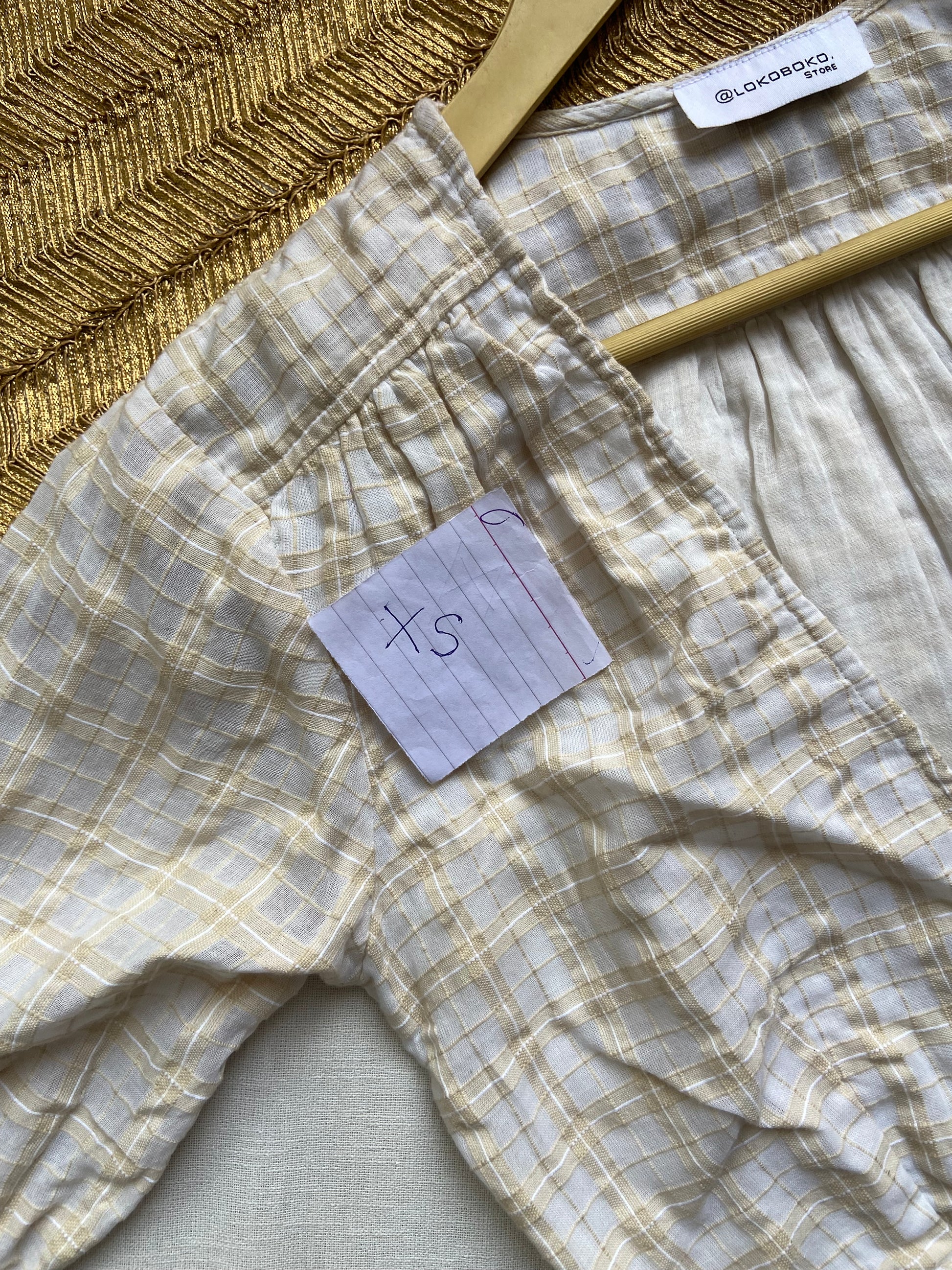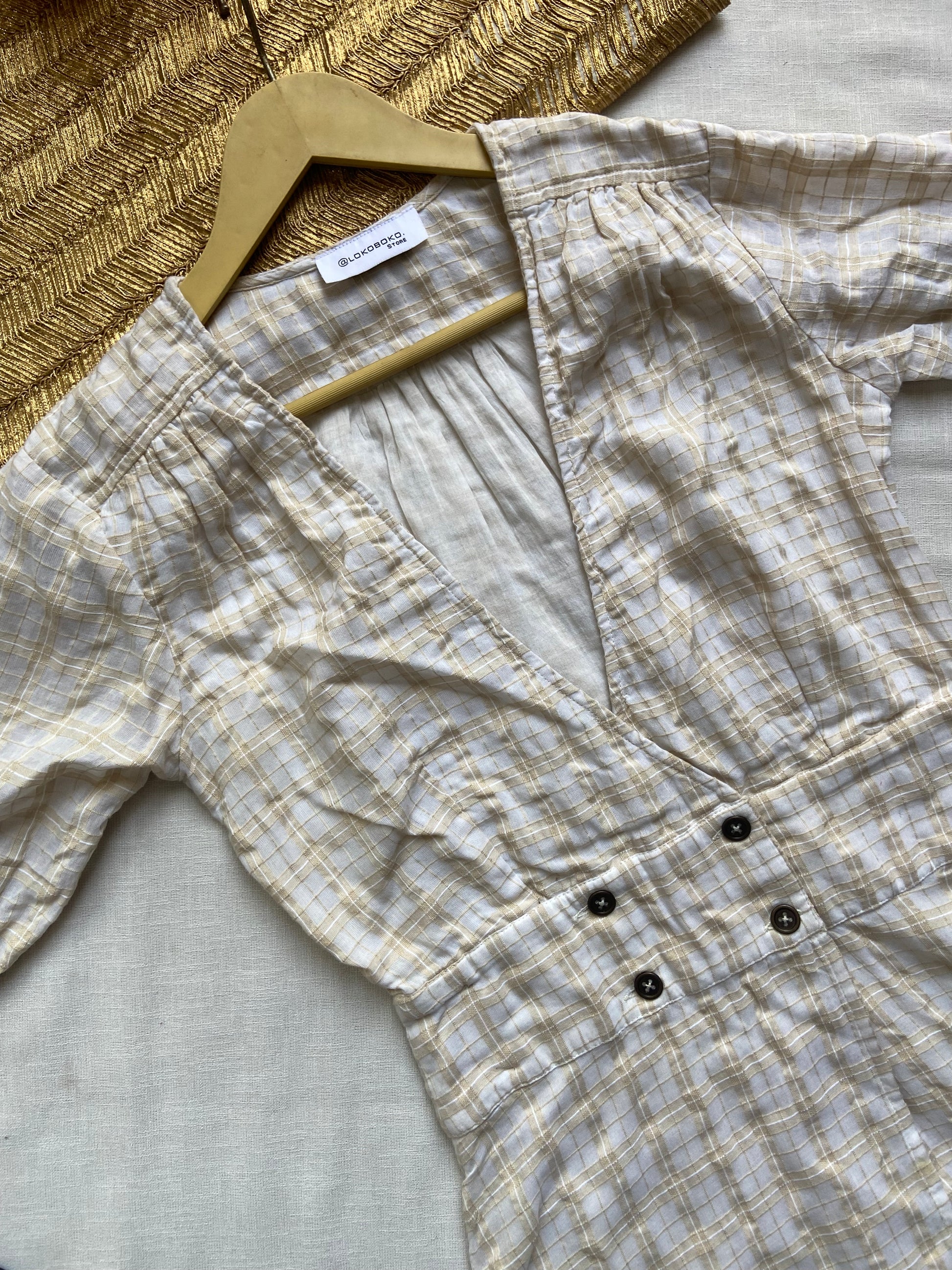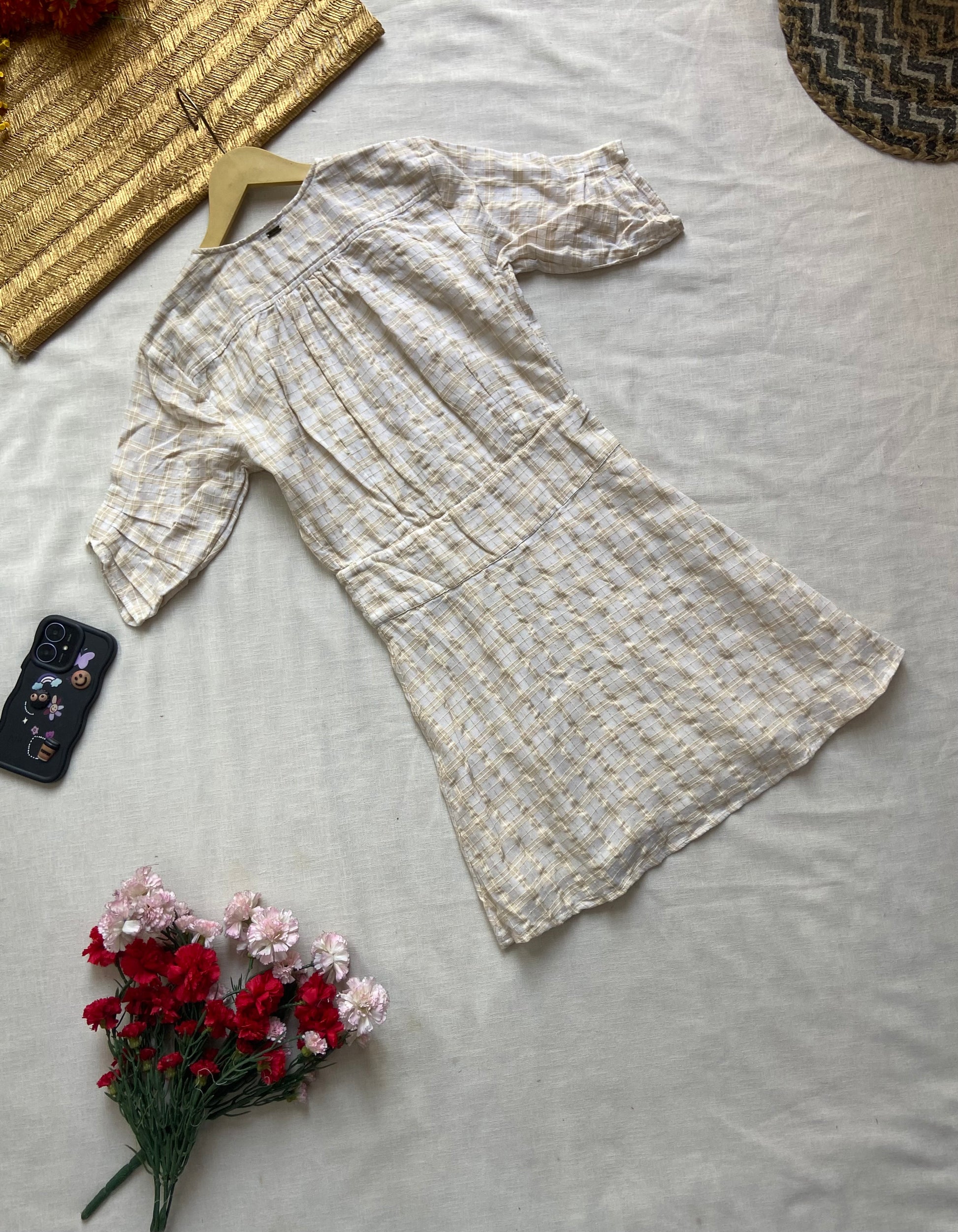 A stylish and comfortable mini dress featuring a soft plaid pattern, deep V-neckline, and button accents at the waist. Perfect for casual outings or daytime events. Made from lightweight fabric with half sleeves for a relaxed fit