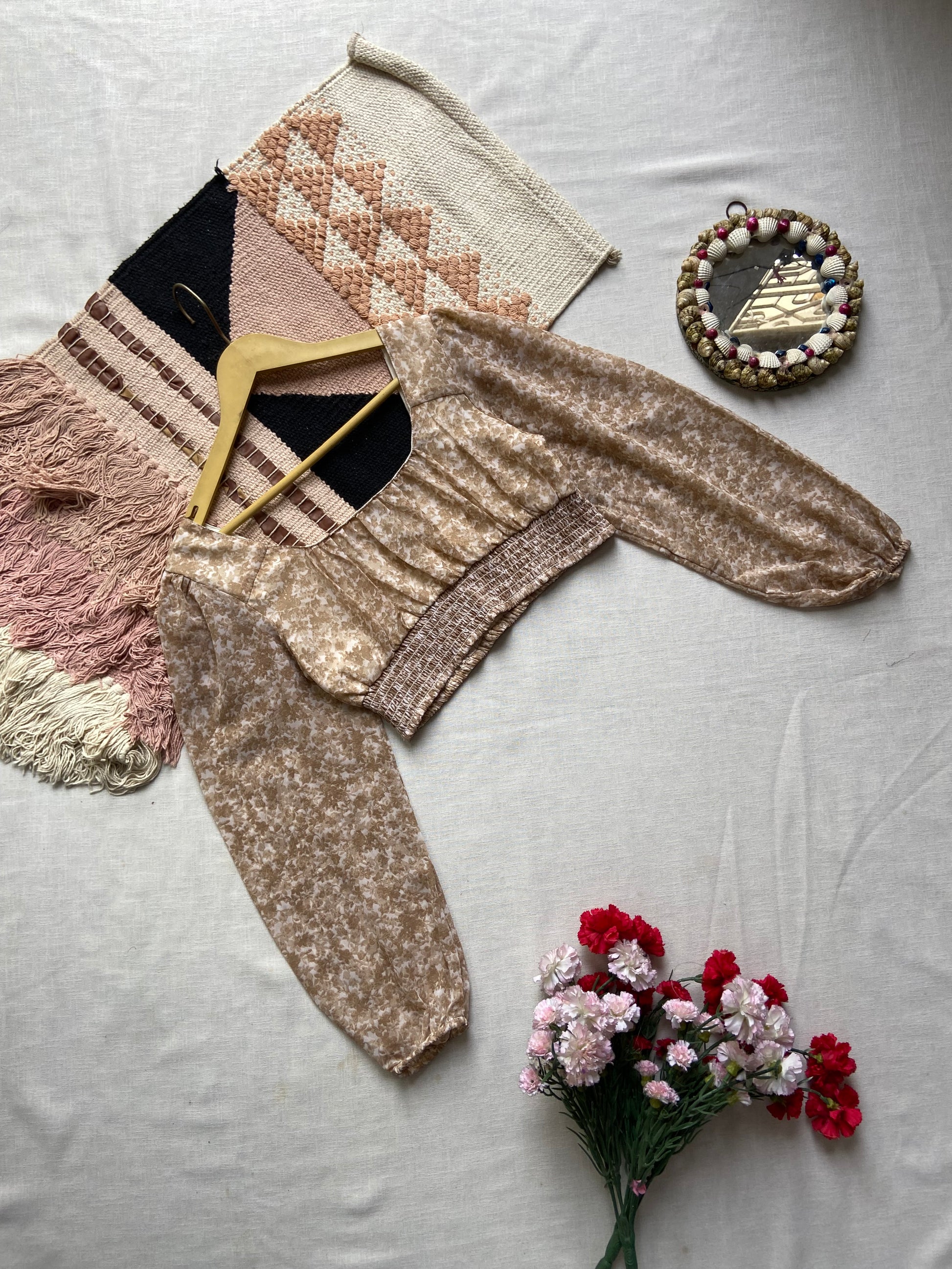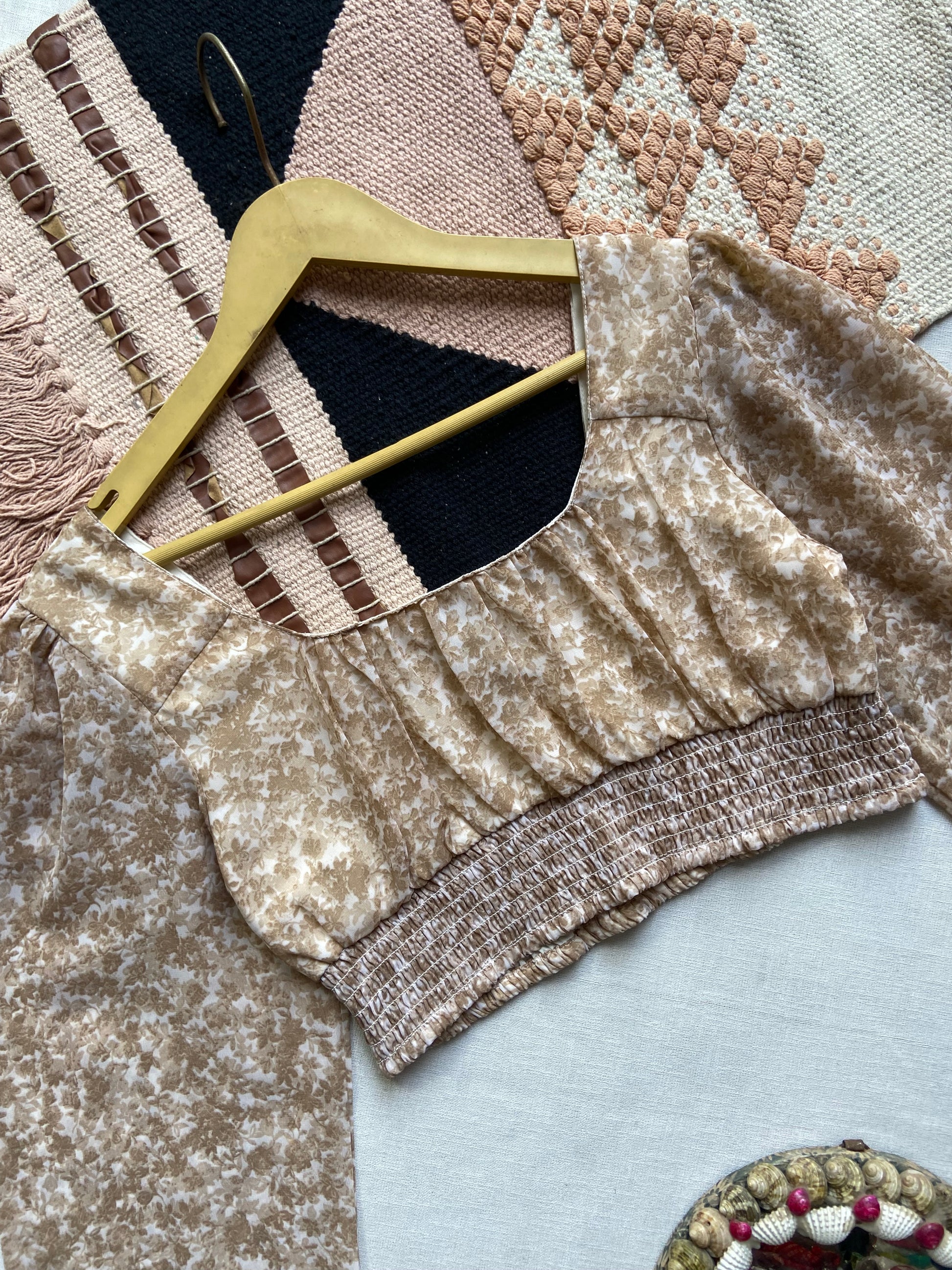 Beige Floral Print Crop Top with Puff Sleeves & Smocked Waist – Boho Chic Style
