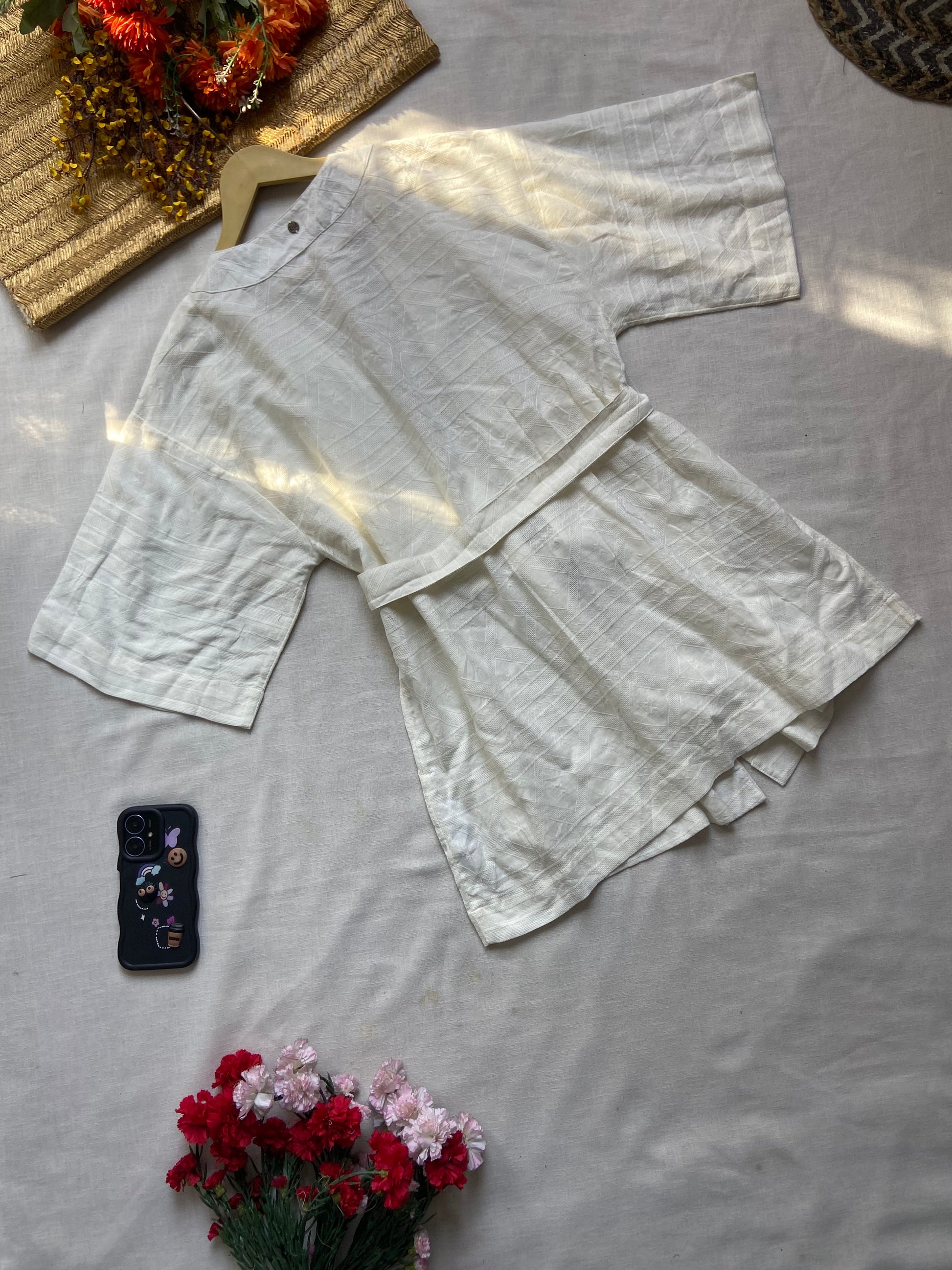 Elevate your layering game with this stylish white kimono-style shrug. Made from soft and breathable cotton, it features wide sleeves, an open front, and a matching waist tie for a flattering fit. The lightweight fabric and relaxed silhouette make it perfect for casual wear, lounging at home, or throwing over your favorite outfit for an effortless look.