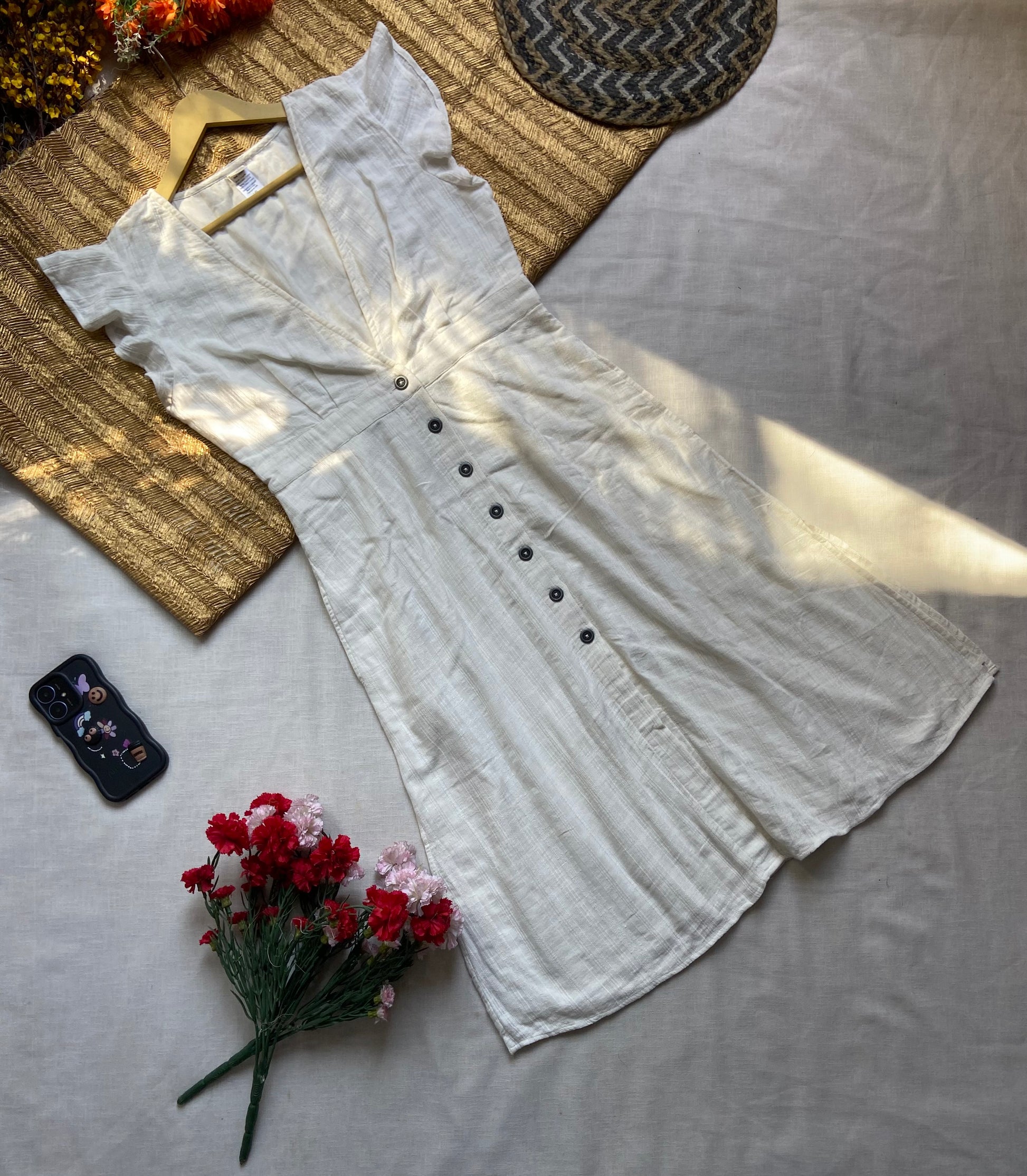 Elegant and breezy, this white linen midi dress features a deep V-neckline, flutter sleeves, and a front button-down design. Made from lightweight, breathable fabric, it's ideal for sunny days, casual outings, or relaxed summer gatherings. A timeless piece with a flattering fit for effortless everyday style.