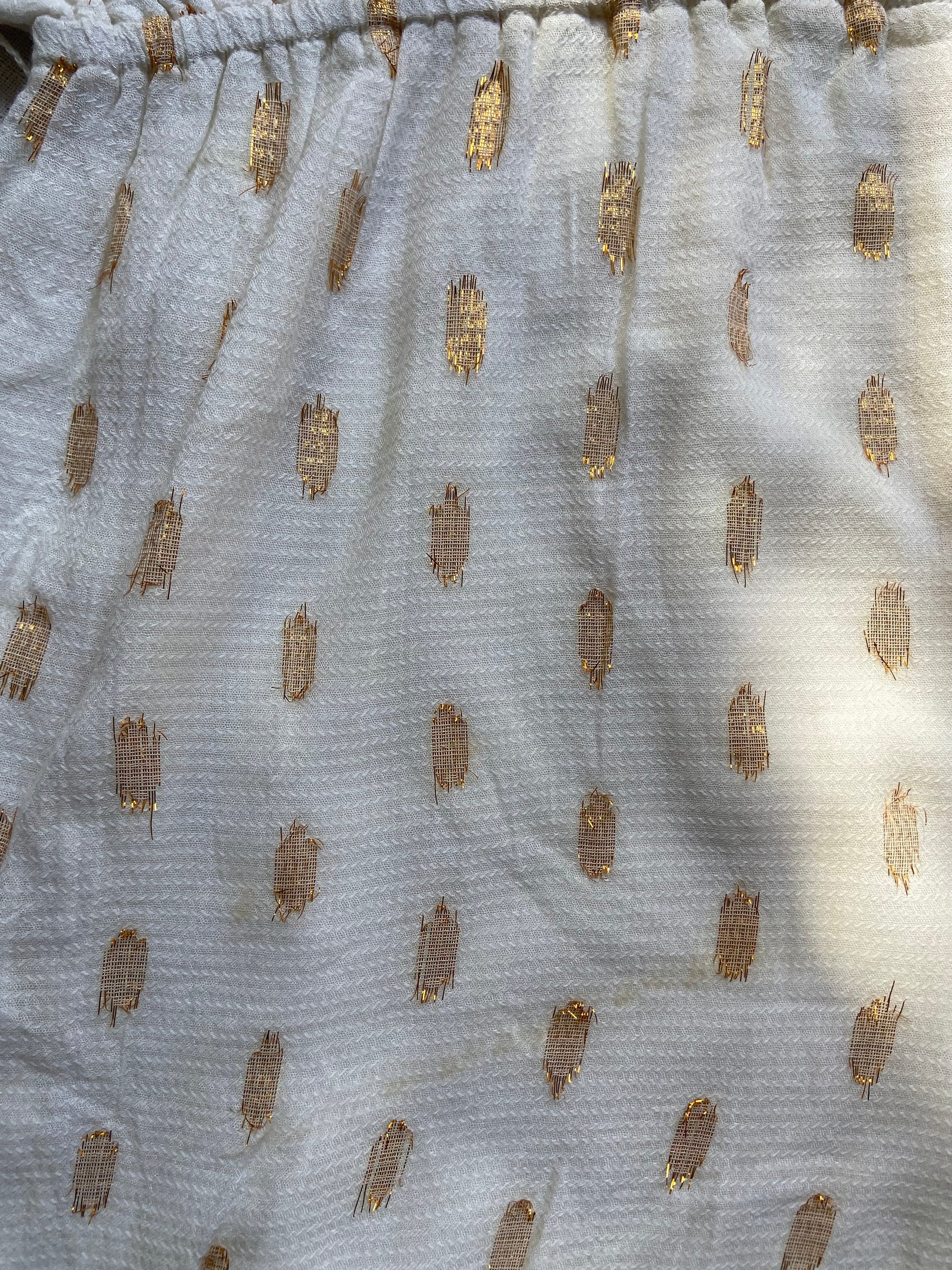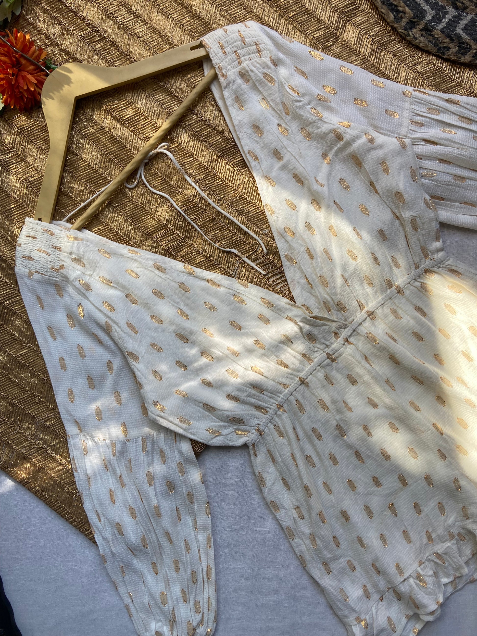 Step out in style with this beautiful white romper adorned with delicate gold polka dots. Featuring a deep V-neckline and long puff sleeves with elastic cuffs, this piece offers a perfect blend of elegance and comfort. The romper cinches at the waist to enhance your silhouette and finishes with a charming ruffled hem for a flirty touch. Ideal for both casual outings and semi-formal events, this romper pairs effortlessly with your favorite accessories and footwear to create a chic, modern look.