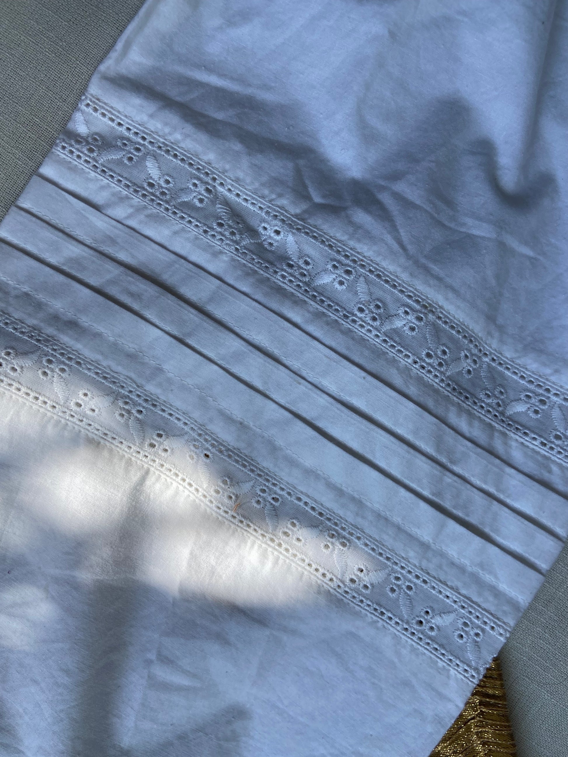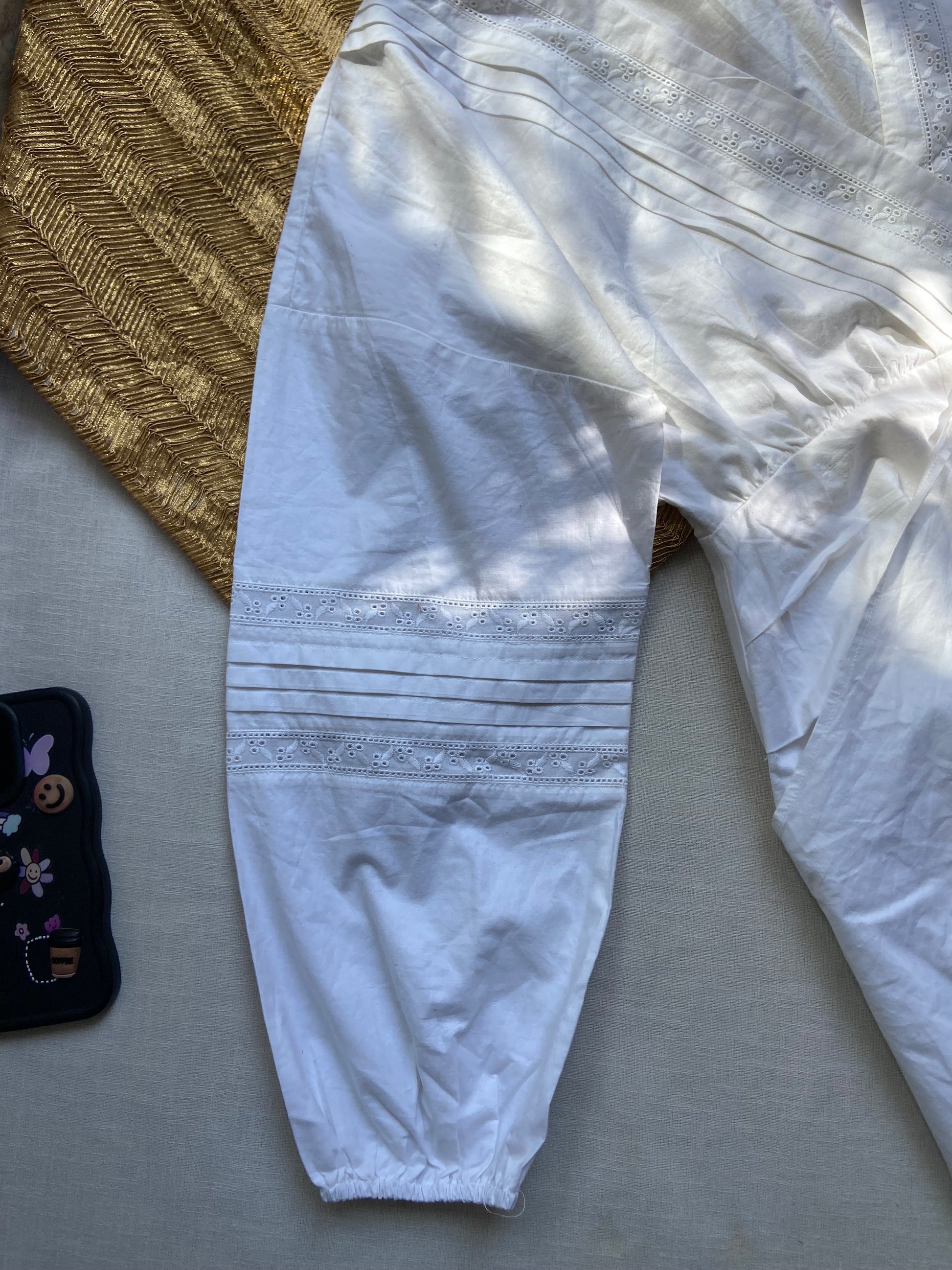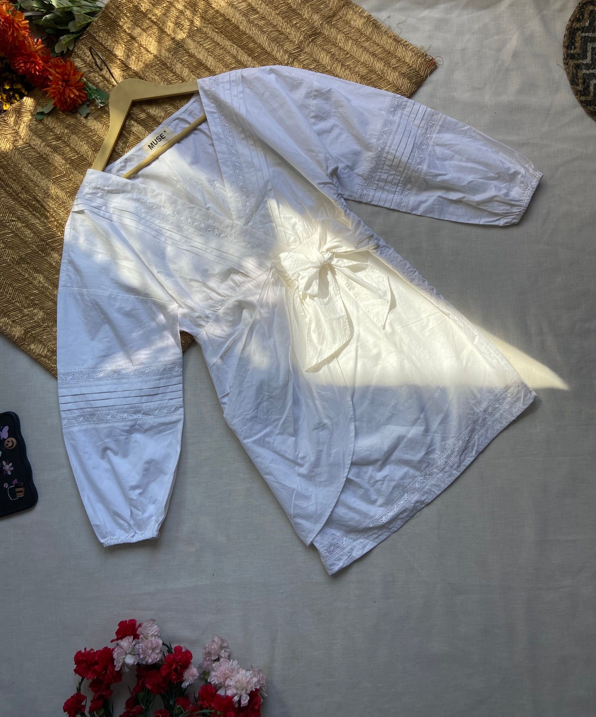 Elegant white cotton wrap dress featuring delicate pintuck and lace details on the sleeves and hem. The dress has a flattering V-neckline and a tie waist for a customizable fit. Perfect for casual or semi-formal occasions.
