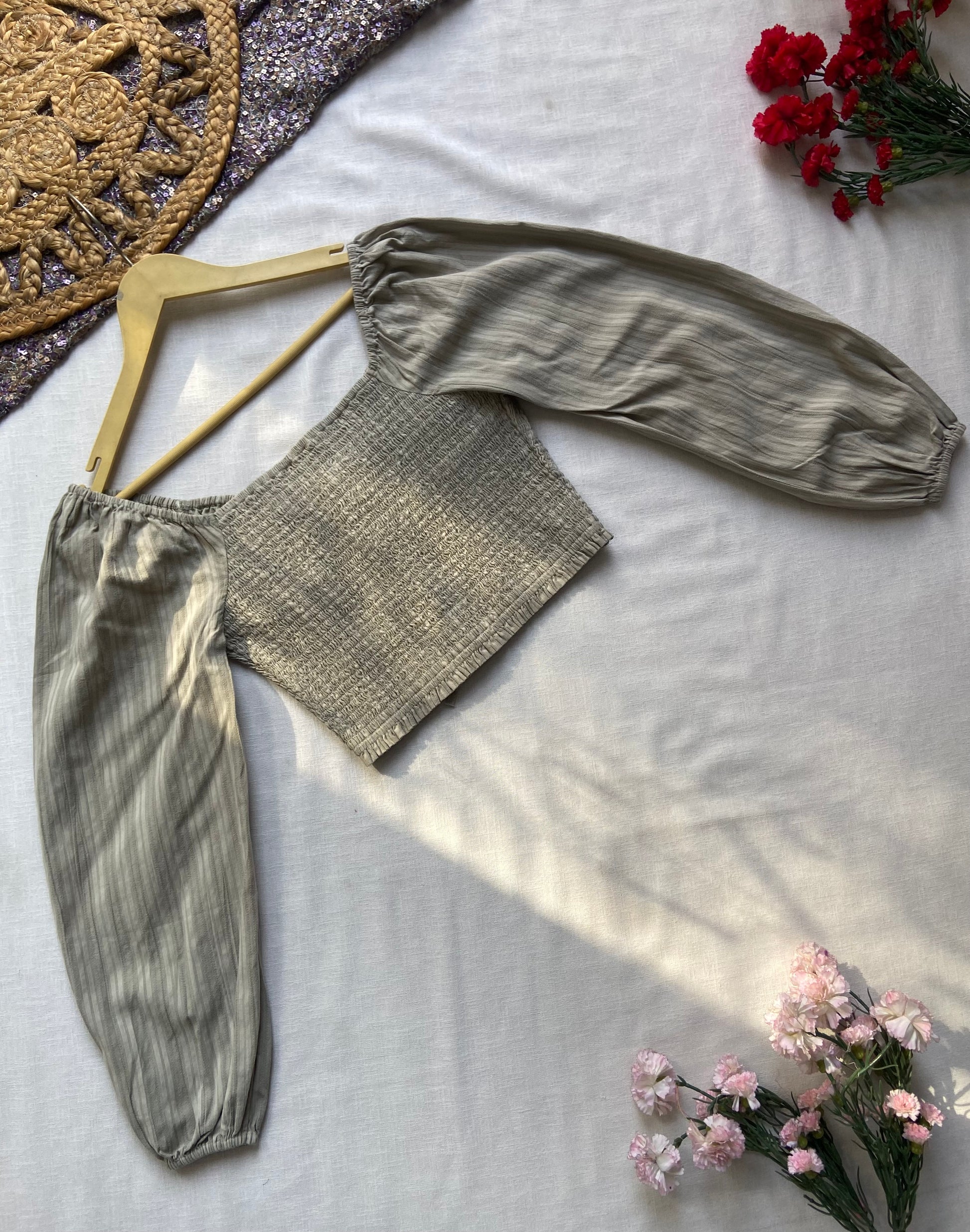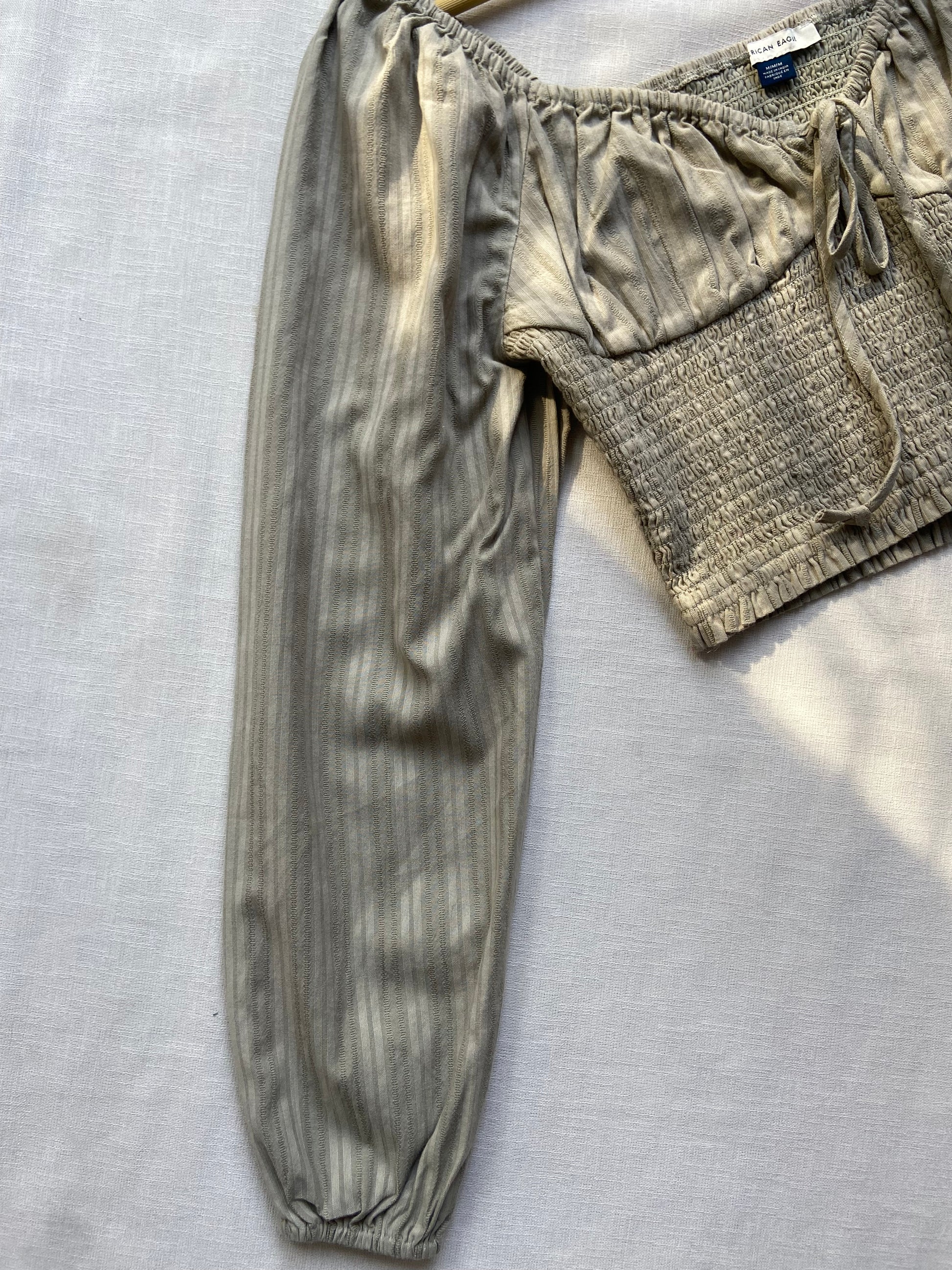 Turn up the charm with the Sage Serenade Smocked Crop Top. Featuring gentle puffed long sleeves, a smocked bodice for a fitted silhouette, and a delicate front tie detail, this crop pairs vintage elegance with modern comfort. The soft sage green with subtle stripes brings a fresh, versatile vibe—perfect for pairing with high-rise trousers or skirts for any season.