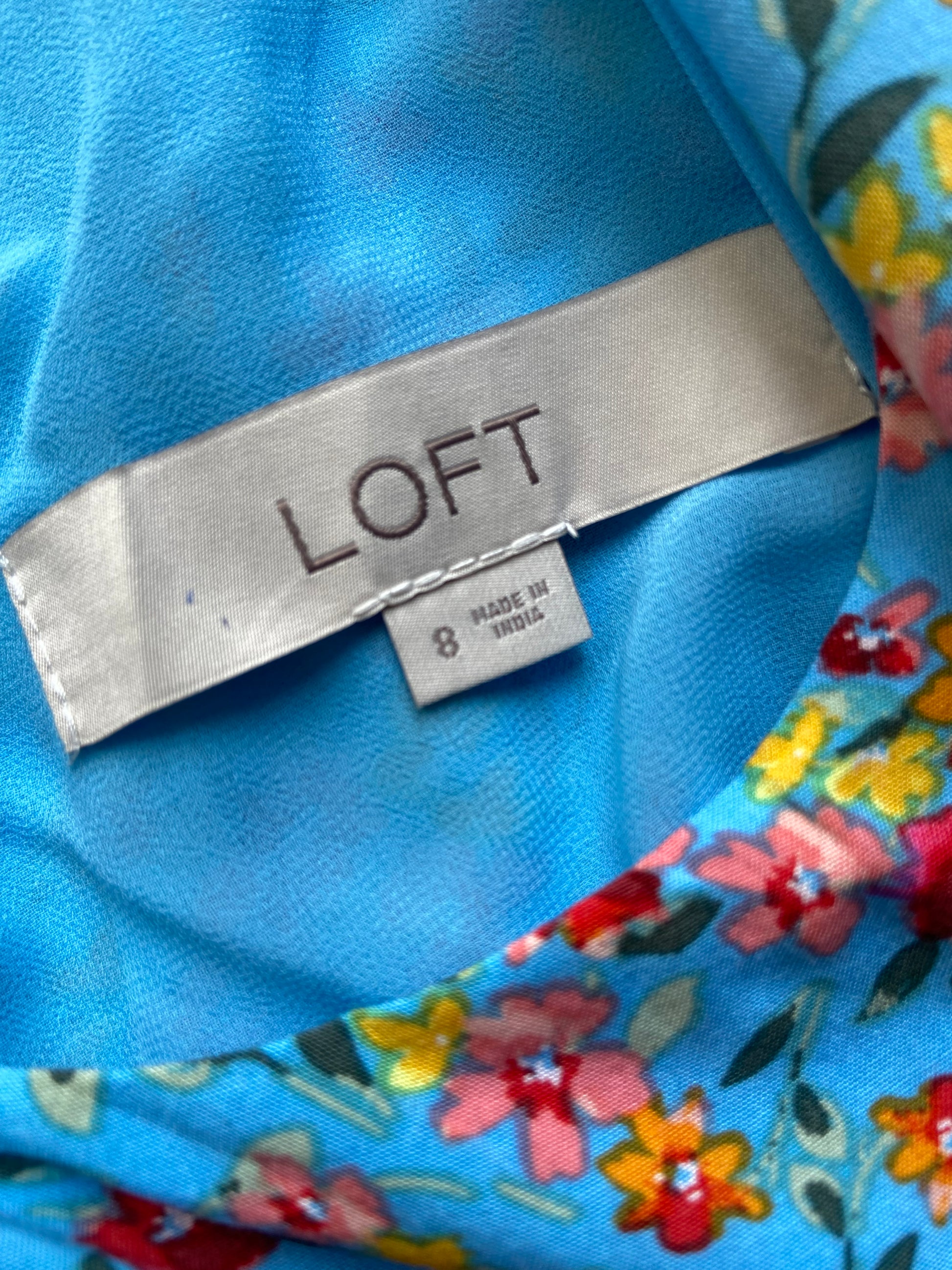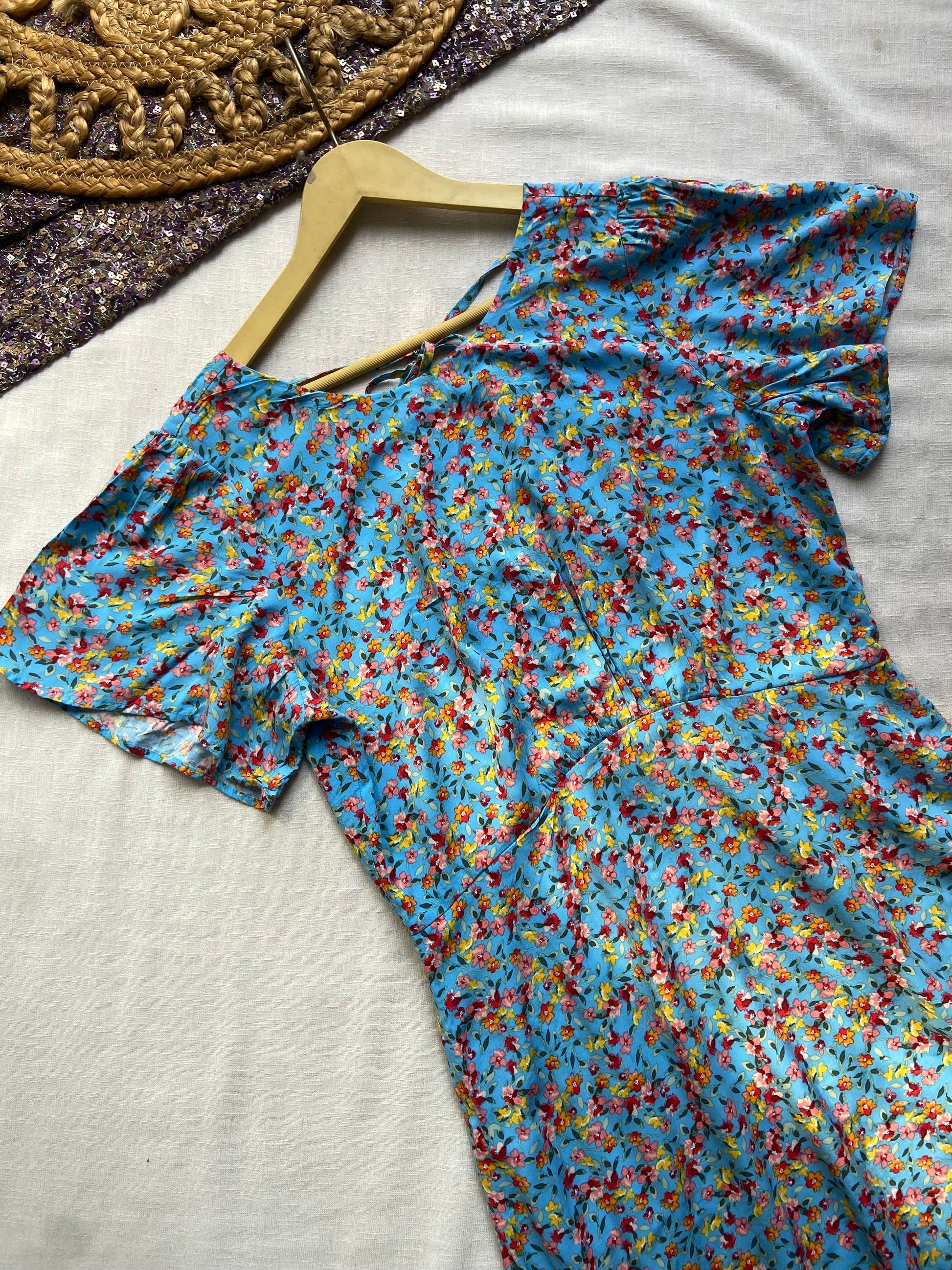 A light and airy blue dress adorned with a vibrant floral print. Features short sleeves, a V-neckline, and a flattering fit-and-flare silhouette perfect for warm weather and casual outings.