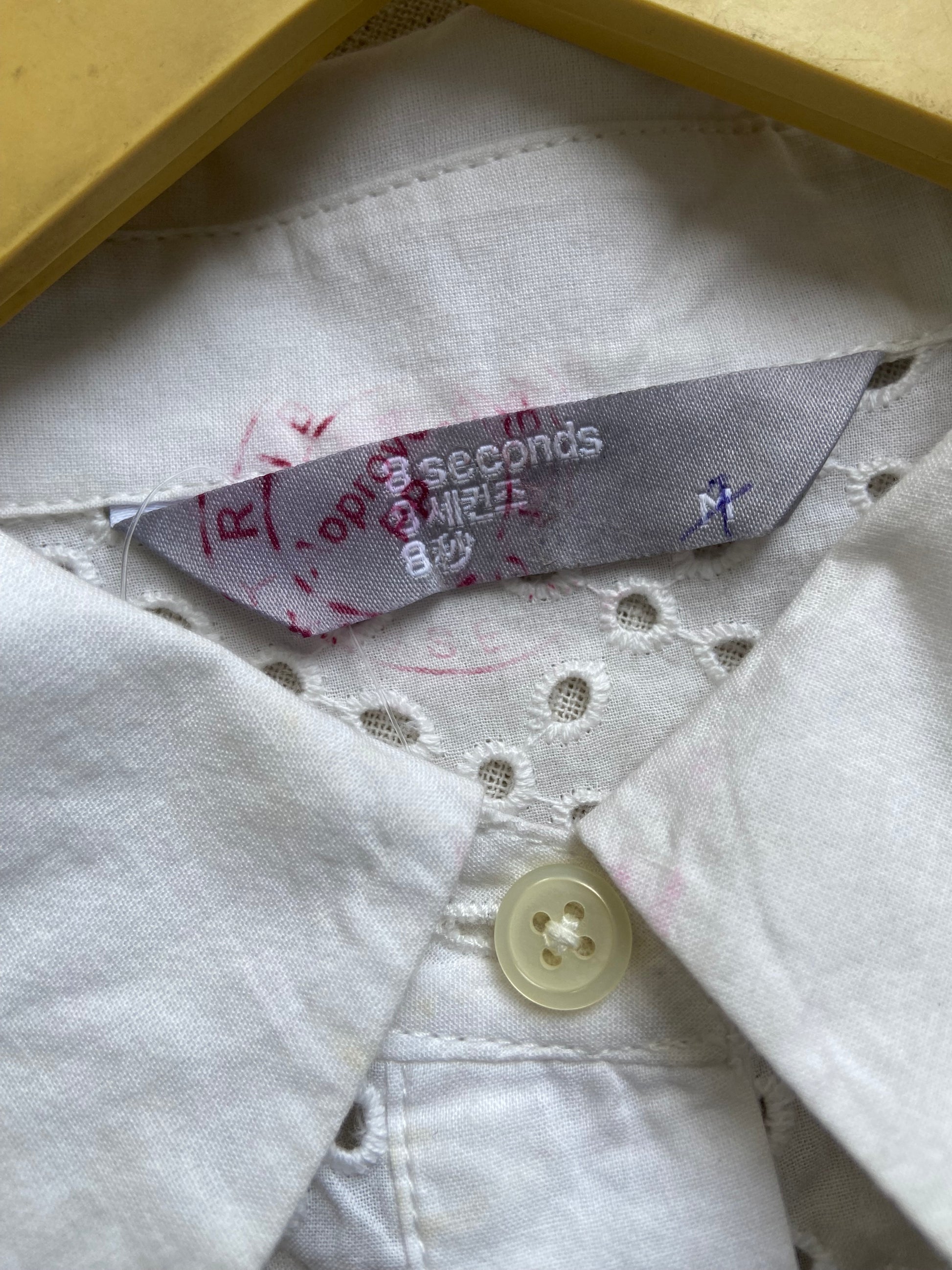 A chic white blouse featuring delicate eyelet lace detailing, button-up front, and voluminous balloon sleeves with cuffed wrists. Perfect for a stylish and airy look.