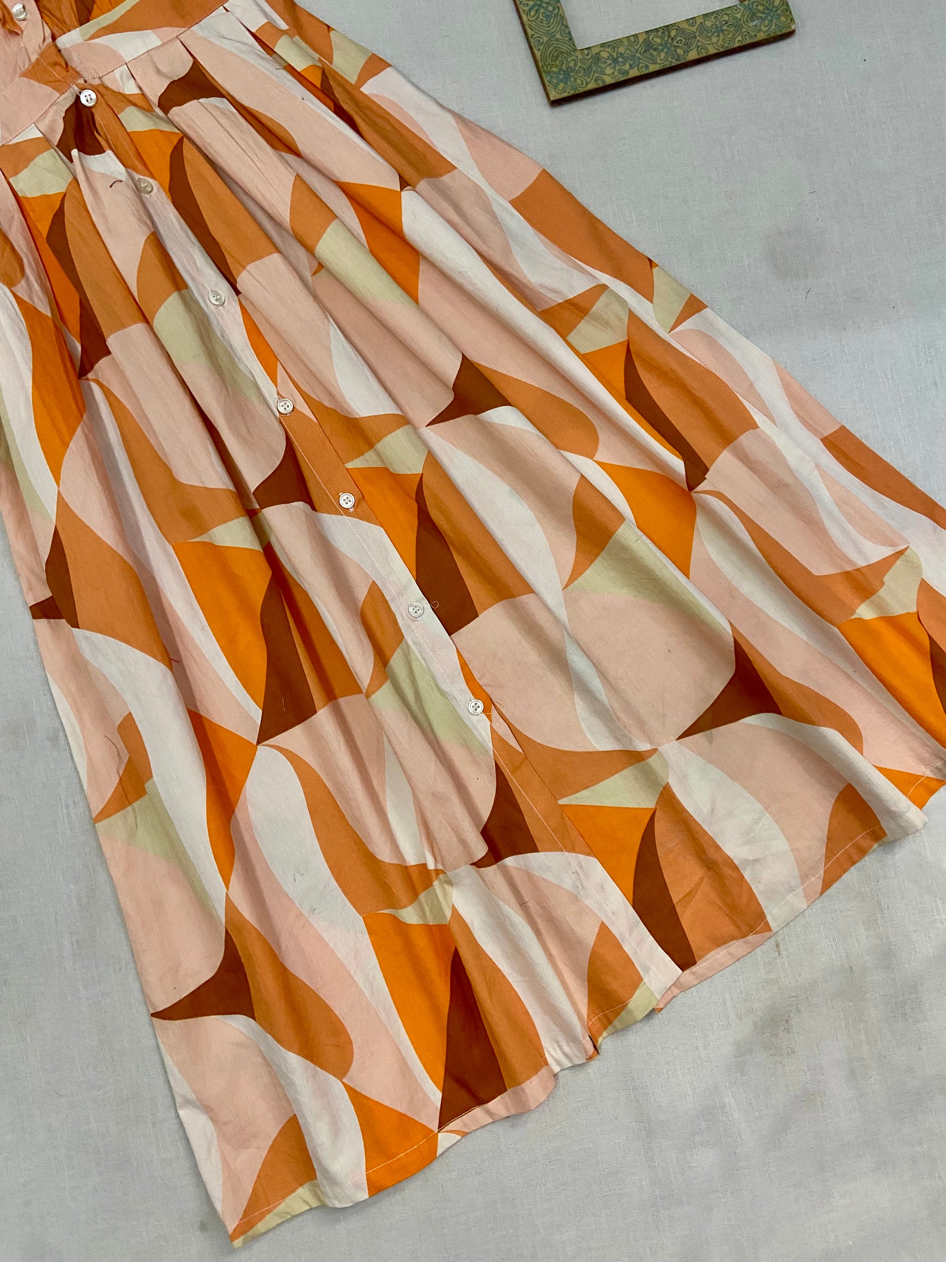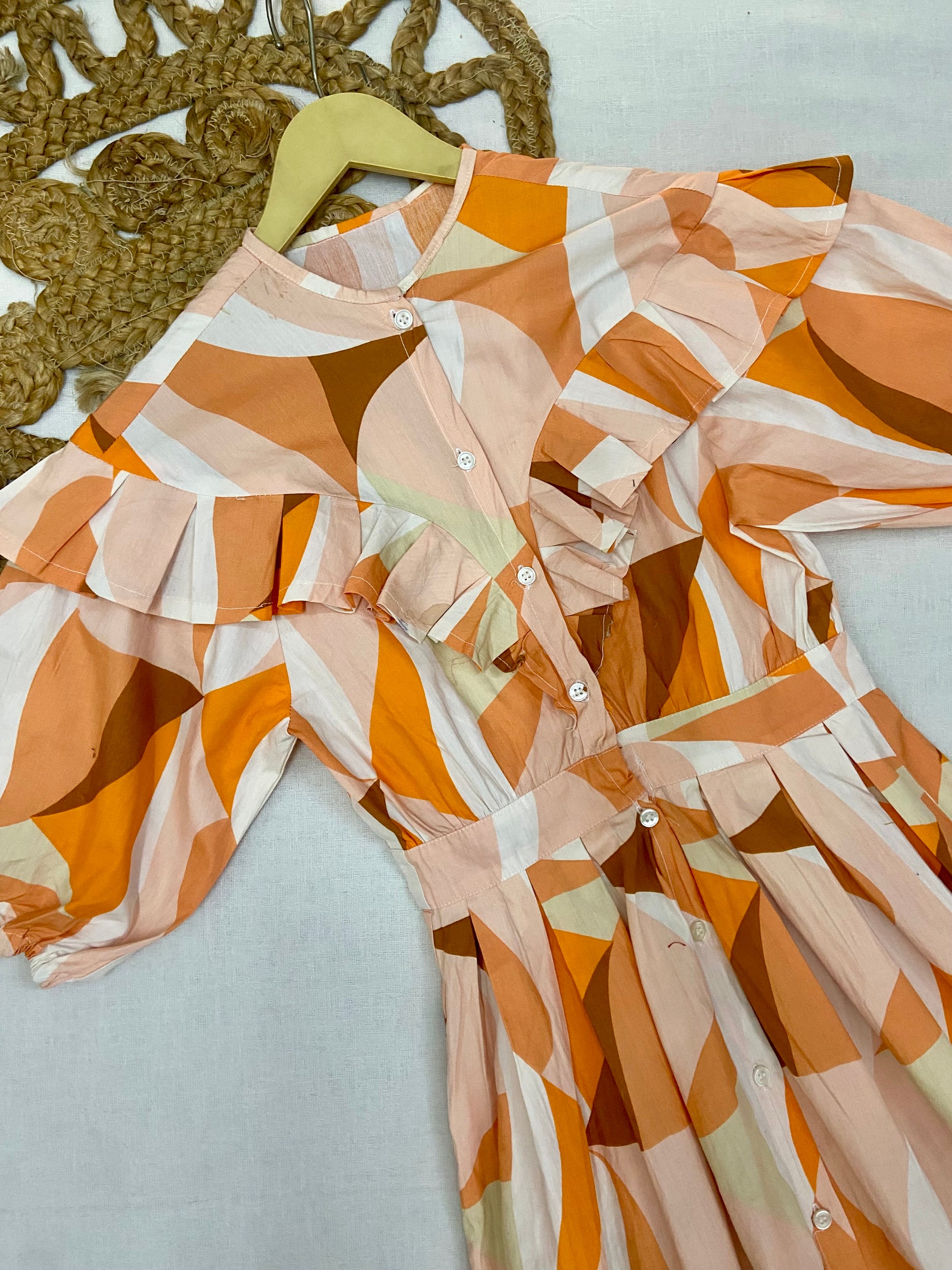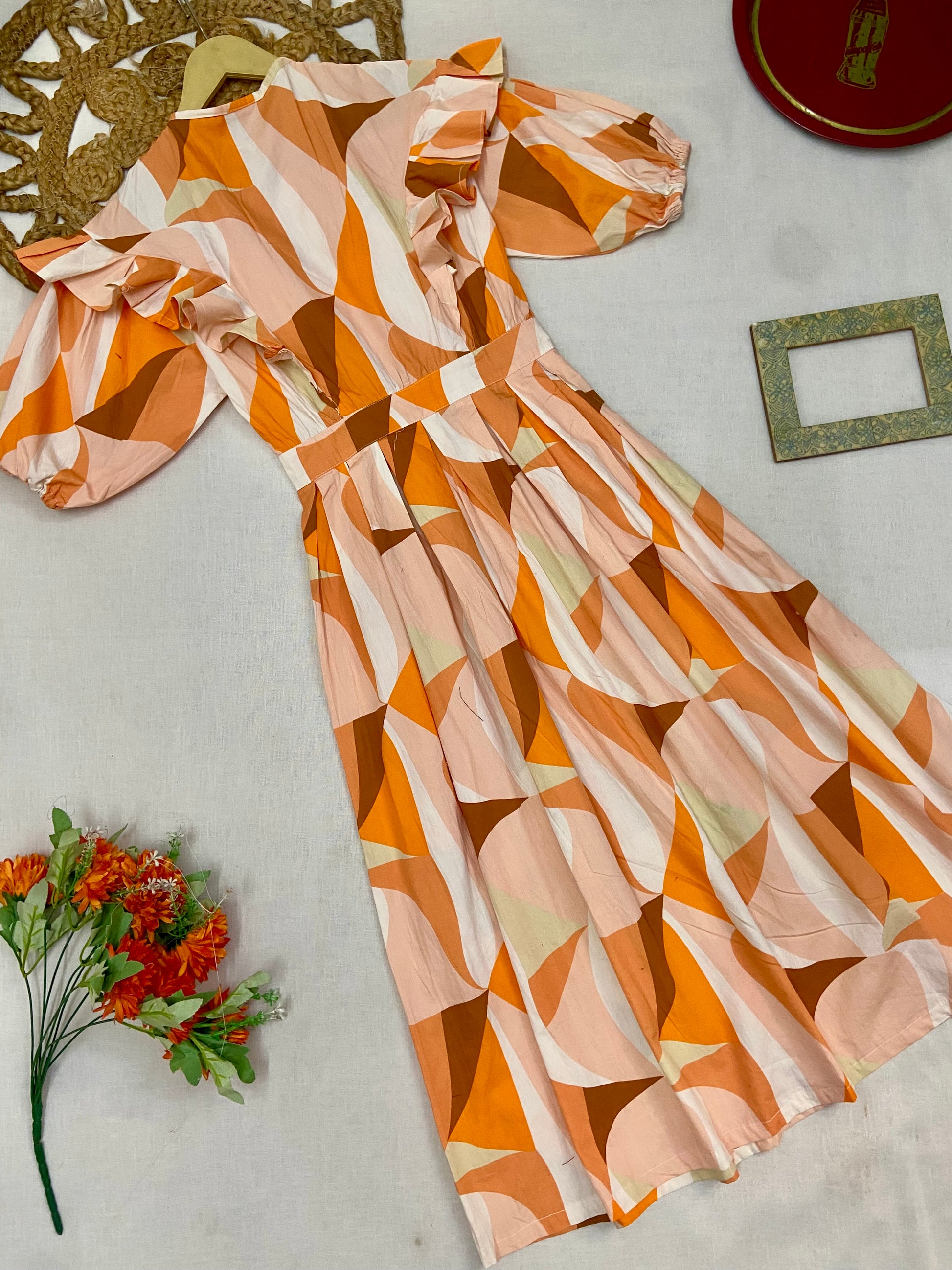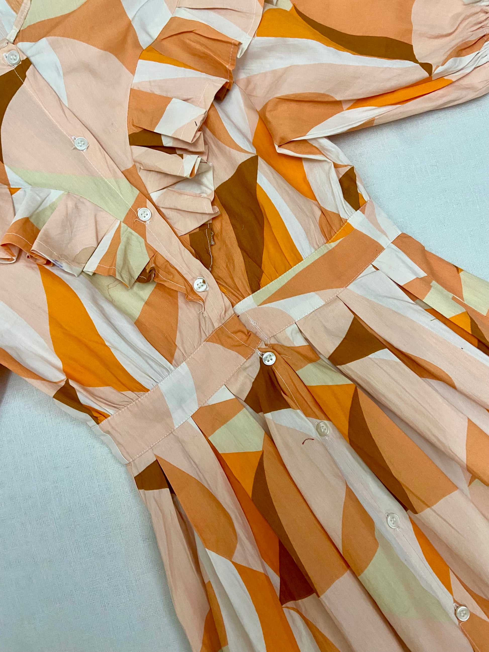 Brighten up your wardrobe with this multicolor geometric print midi dress for women. Featuring playful ruffle detailing on the front, puff sleeves, and a button-down design, this dress blends elegance with a fun, modern touch. The lightweight fabric and flattering fit make it perfect for casual outings, brunch dates, or summer gatherings. Style it with sandals for a relaxed look or heels and accessories for a chic statement. A versatile printed midi dress that adds charm and color to any occasion.