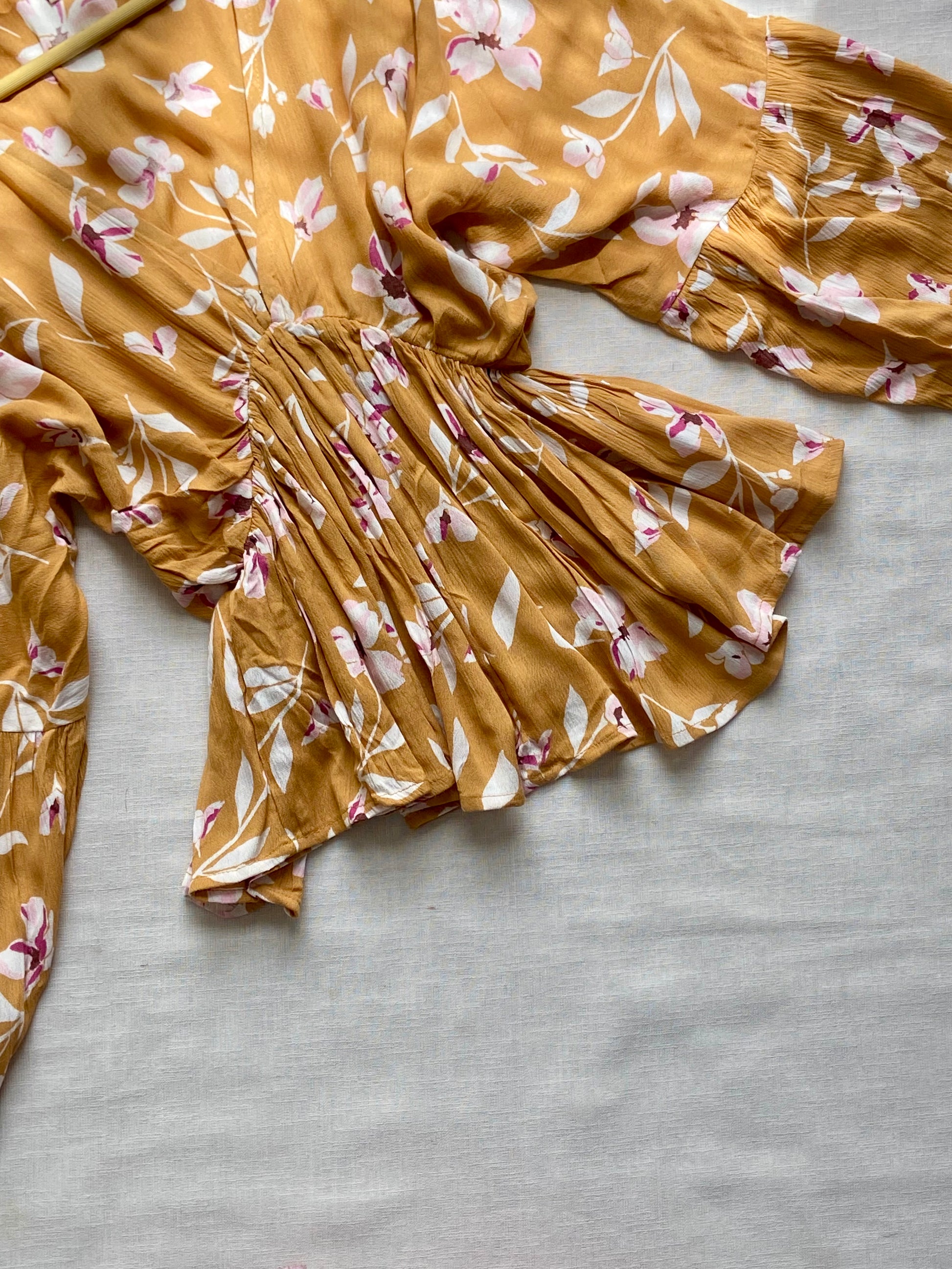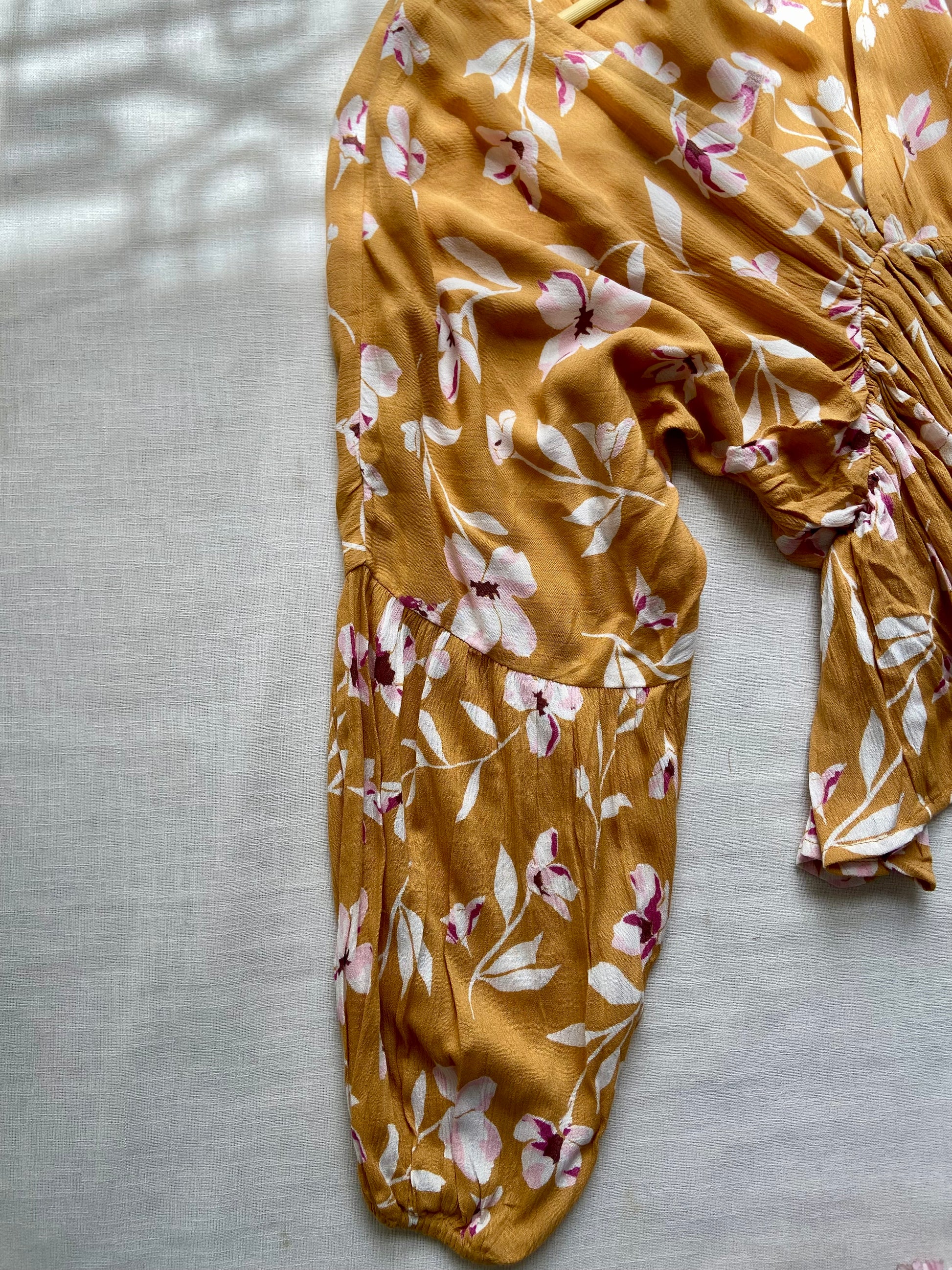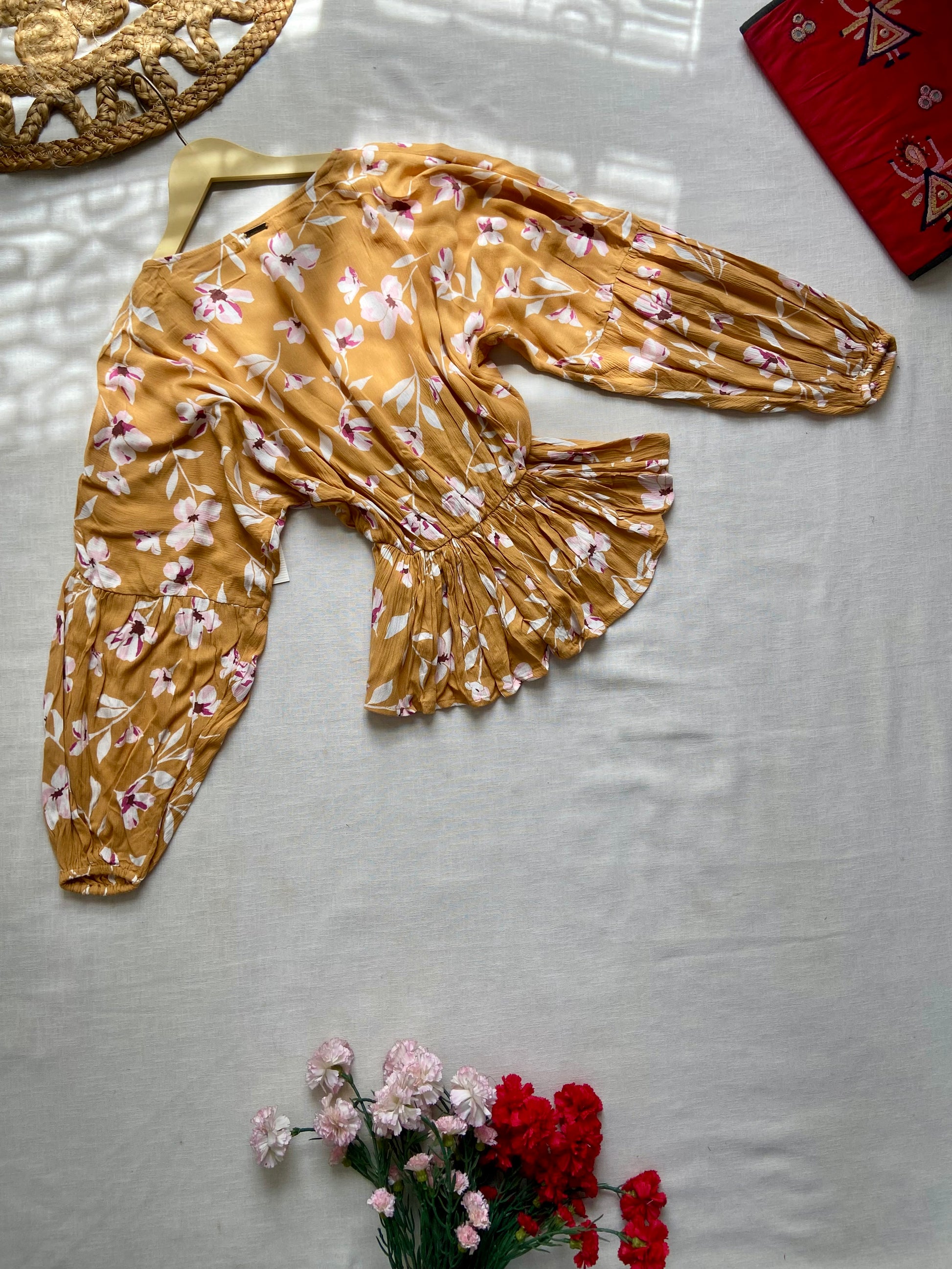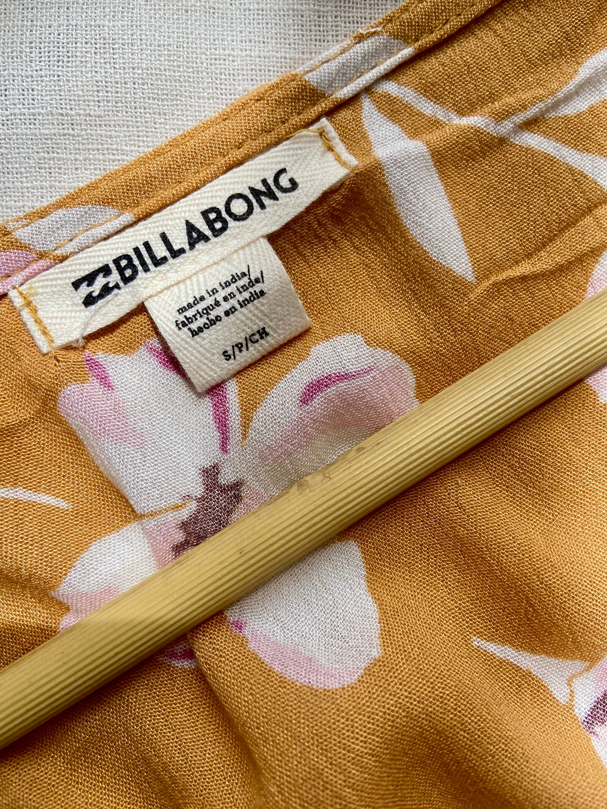 This Yellow Floral Top from Billabong features a flattering V-neck and elegant peplum detailing at the hem, enhancing your silhouette. Crafted from a breathable cotton viscose blend, it offers comfort and softness ideal for warm weather. The full puff sleeves add a stylish, voluminous touch, making it perfect for a beach vacation. Pair it with your favorite shorts or a flowy skirt for a chic, relaxed look. Available in size small, this top combines comfort and style effortlessly for your getaway wardrobe.