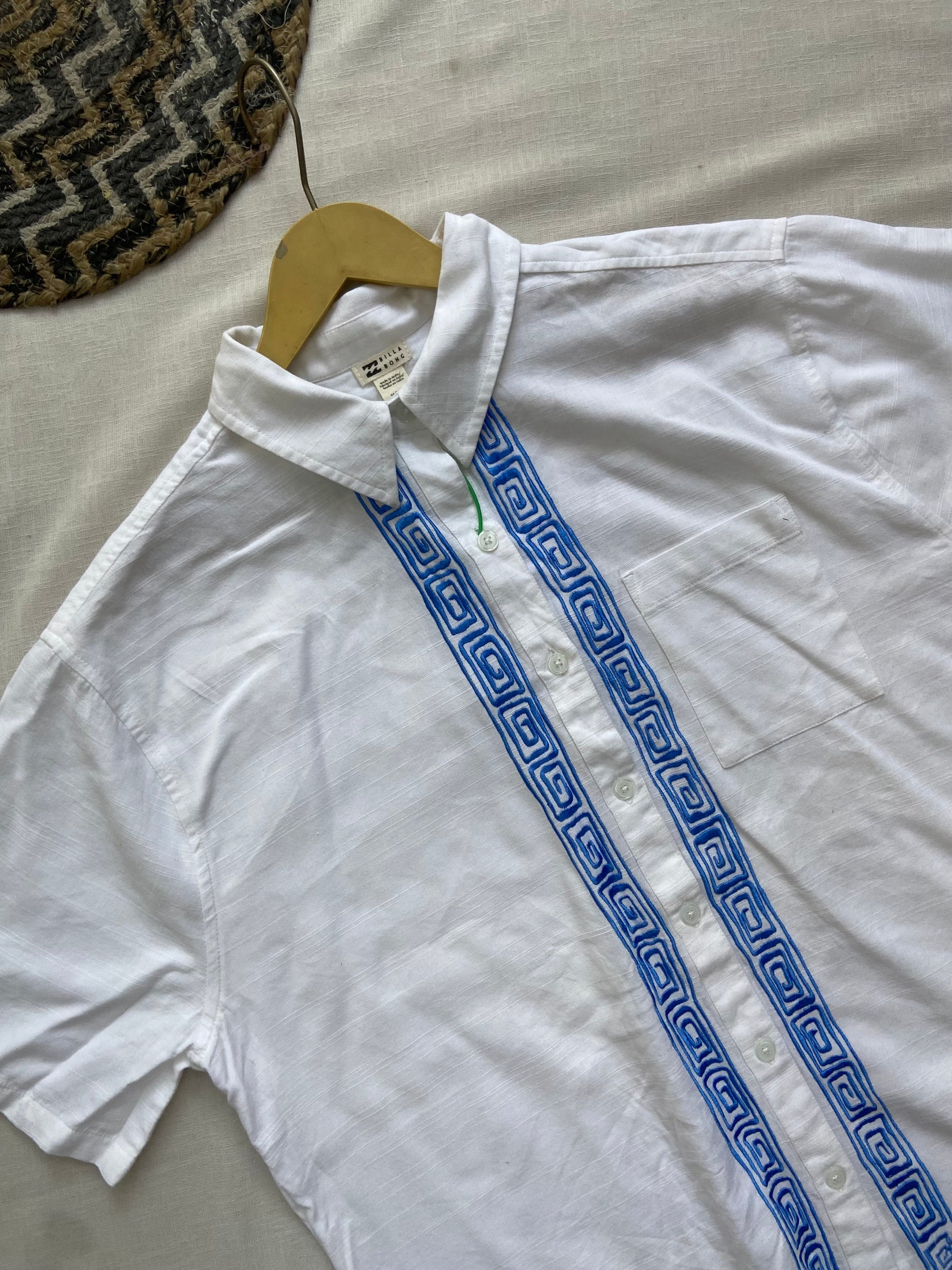 Elevate your casual wardrobe with this stylish men's white cotton shirt featuring intricate blue geometric embroidery along the button placket and hem. Crafted from breathable, lightweight cotton, this short-sleeve shirt offers both comfort and a refined look perfect for warm weather. The classic collar and front pocket add practical details, making it ideal for both casual outings and semi-formal occasions. Easy to pair with jeans or chinos, this shirt brings a subtle yet distinctive touch of elegance to your everyday style.