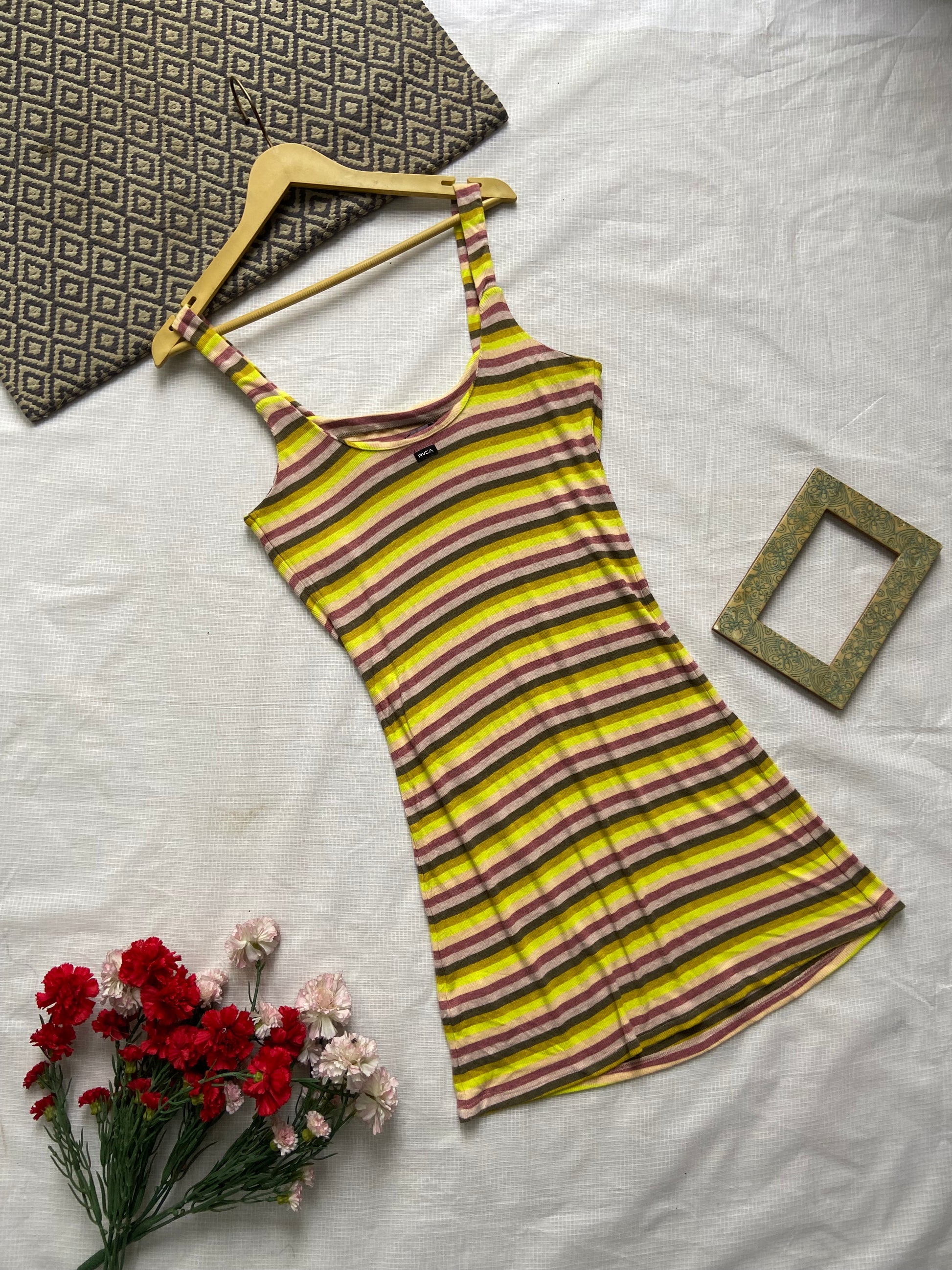 Step into effortless style with this vibrant striped bodycon mini dress, designed for sunny days and weekend getaways. Featuring playful horizontal stripes in shades of yellow, pink, brown, and green, this sleeveless dress hugs your body for a flattering, curve-enhancing fit.