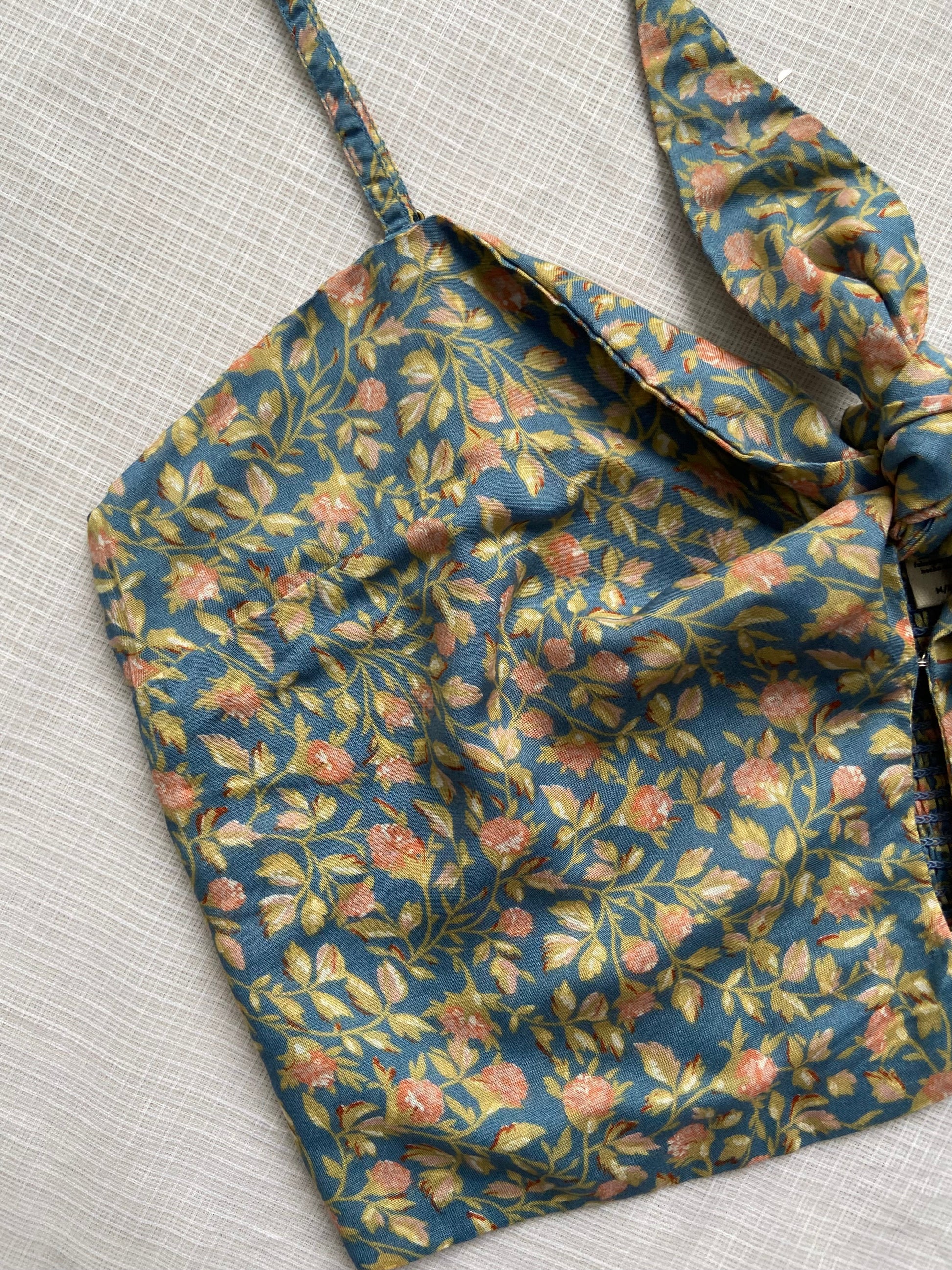 Keywords: floral crop top, tie-front cami, boho summer top, women's spaghetti strap top, backless beach top, printed cotton cami