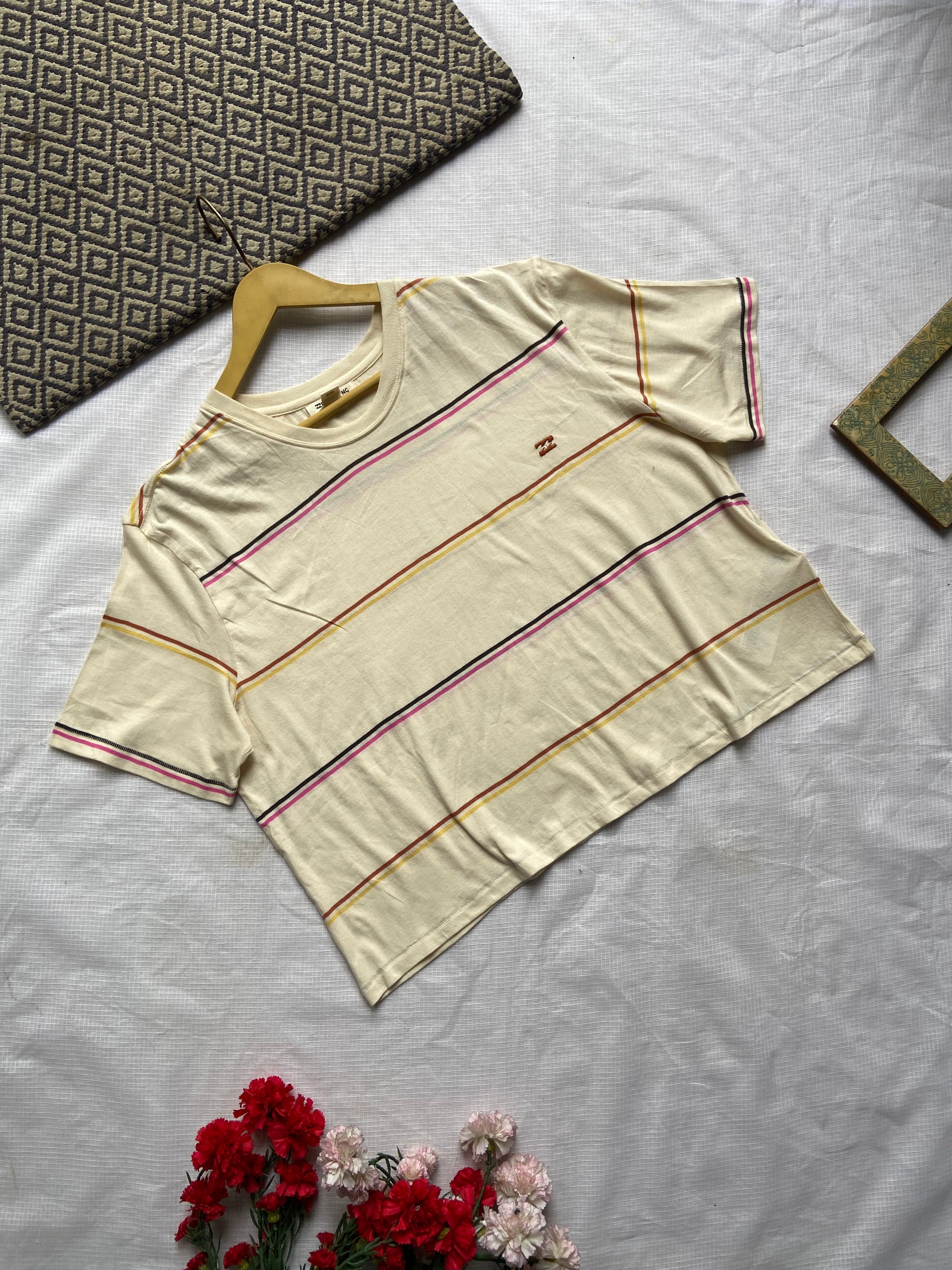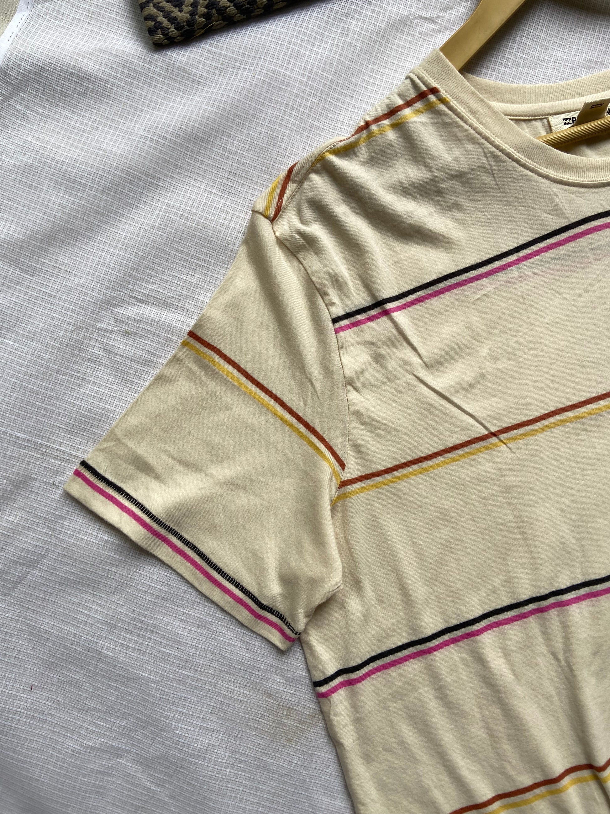 Elevate your casual wardrobe with this Classic Striped Crop T-Shirt for Women. Crafted from soft, breathable fabric, this tee features a timeless striped pattern in warm hues of mustard, pink, and black on a creamy beige background. The relaxed fit and cropped length offer a modern silhouette that pairs perfectly with high-waisted jeans or skirts. Ideal for everyday wear, this versatile t-shirt combines comfort and style effortlessly. Whether you're dressing up or down, this striped crop top is a must-have staple for your seasonal collection.