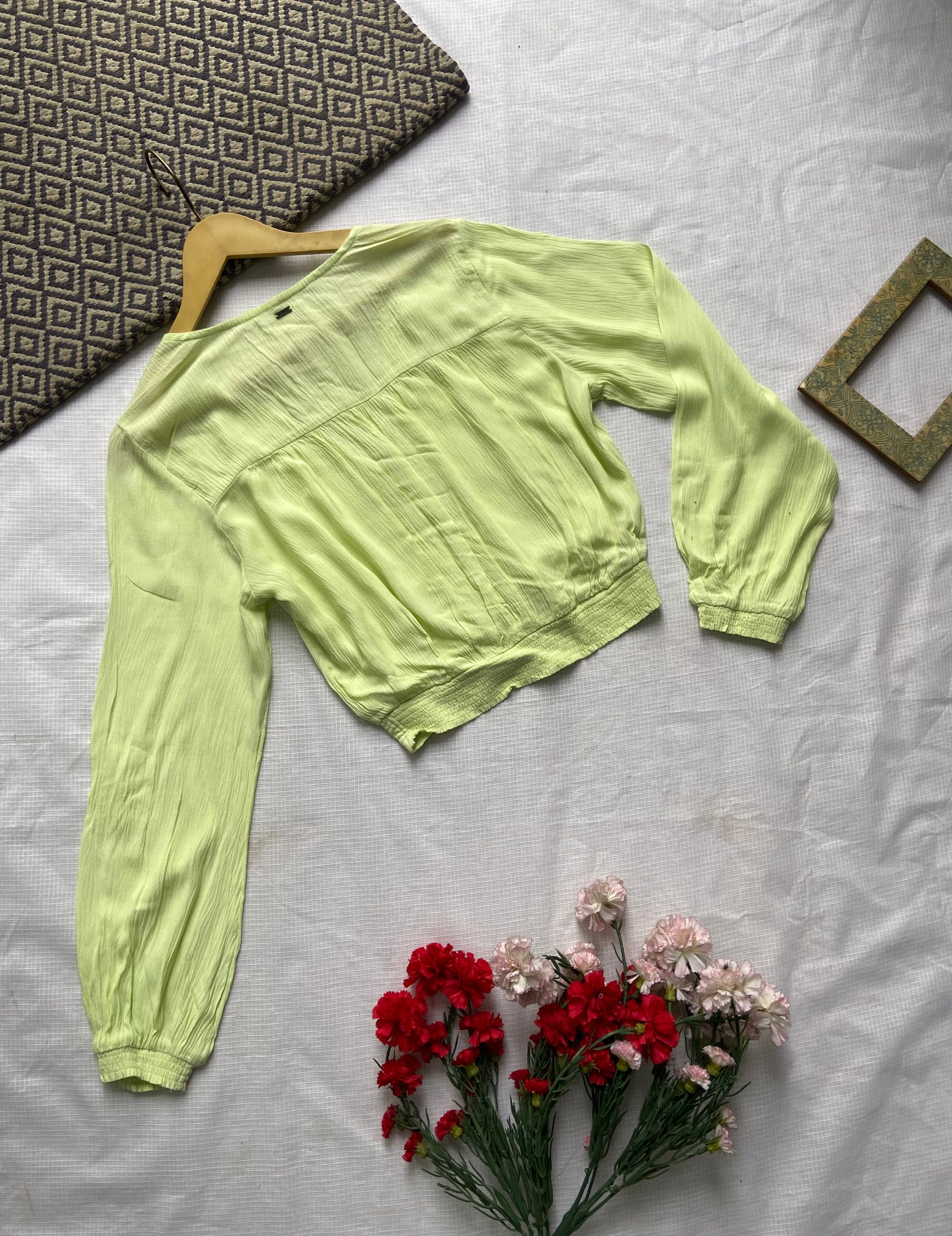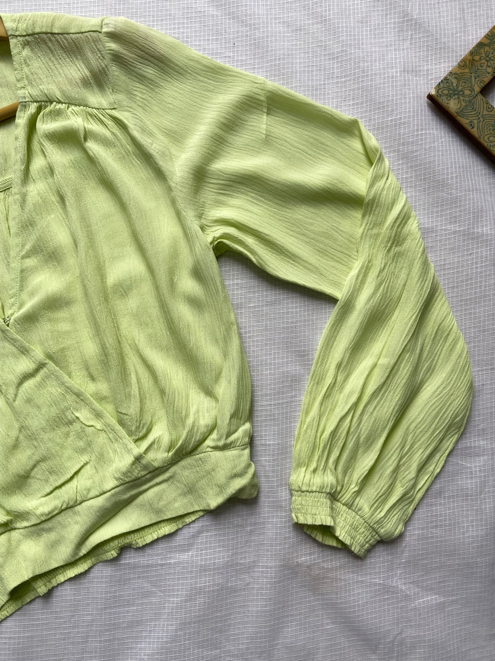 Elevate your casual wardrobe with this stylish Lime Green Wrap Front Long Sleeve Crop Top. Crafted from lightweight, breathable fabric, this top features a flattering wrap design and elasticated cuffs for added comfort and fit. Perfect for pairing with high-waisted jeans or skirts, it effortlessly combines comfort with a trendy silhouette. Ideal for spring and summer outings, this versatile crop top adds a fresh pop of color to your everyday look.