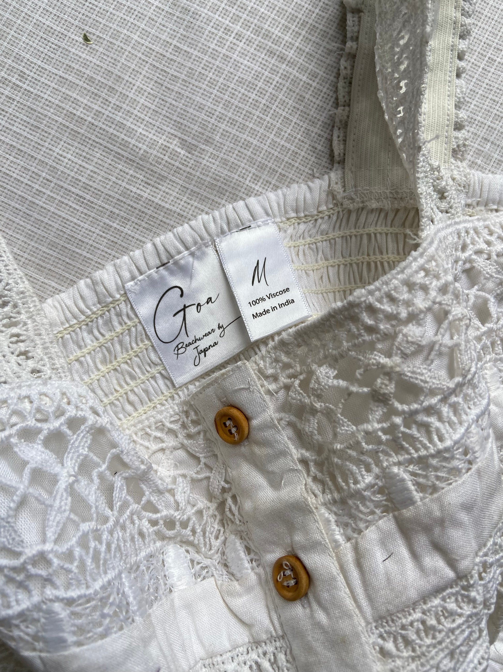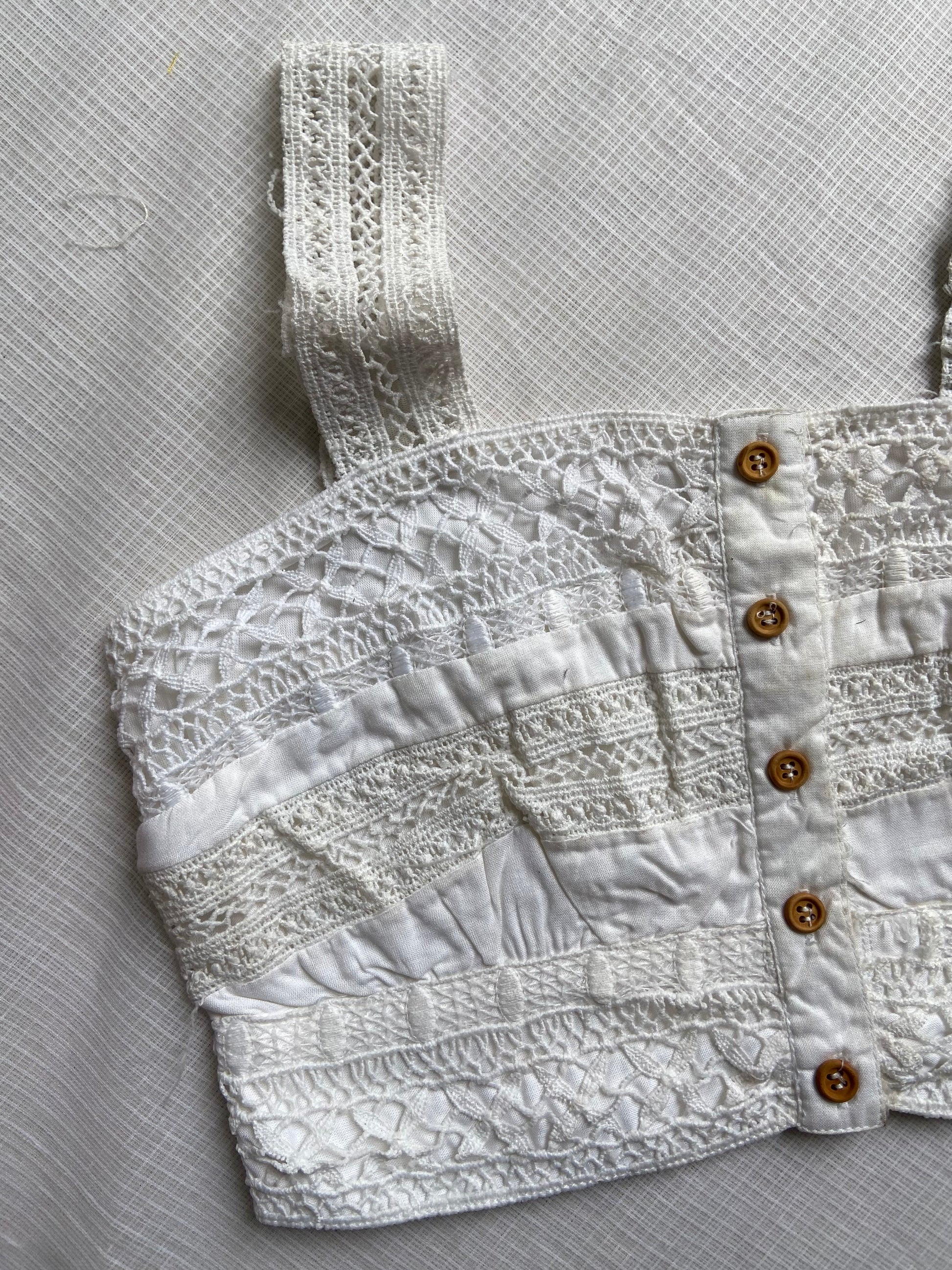 Elevate your style with this unique handcrafted beaded mini bag, featuring intricate floral patterns in soft pastel tones. Perfect for carrying essentials, this bag pairs beautifully with the delicate white lace crop top, designed with elegant button detailing and intricate lacework for a chic, bohemian look. Ideal for casual outings or summer festivals, this set combines artistry and fashion for a standout ensemble.