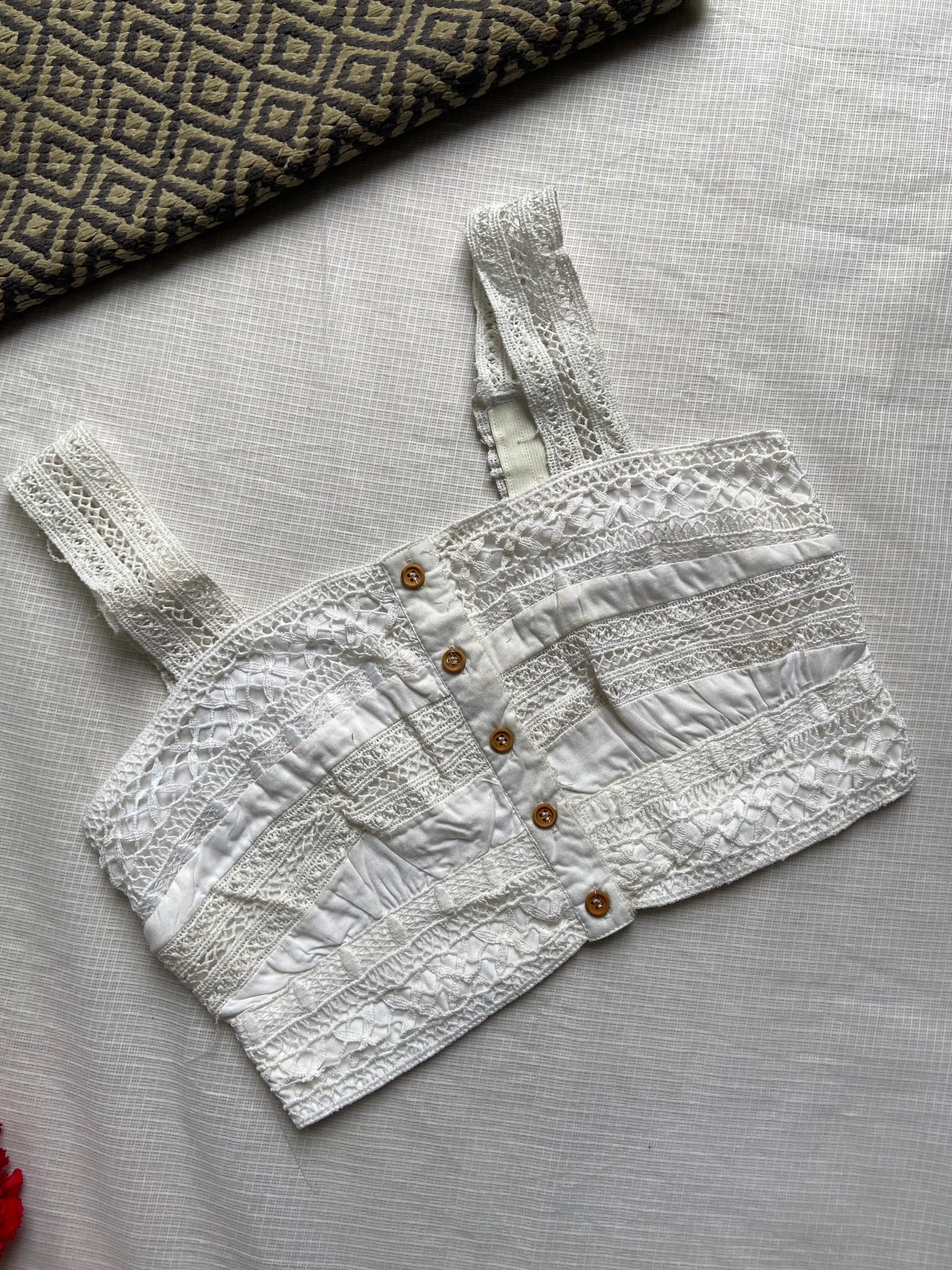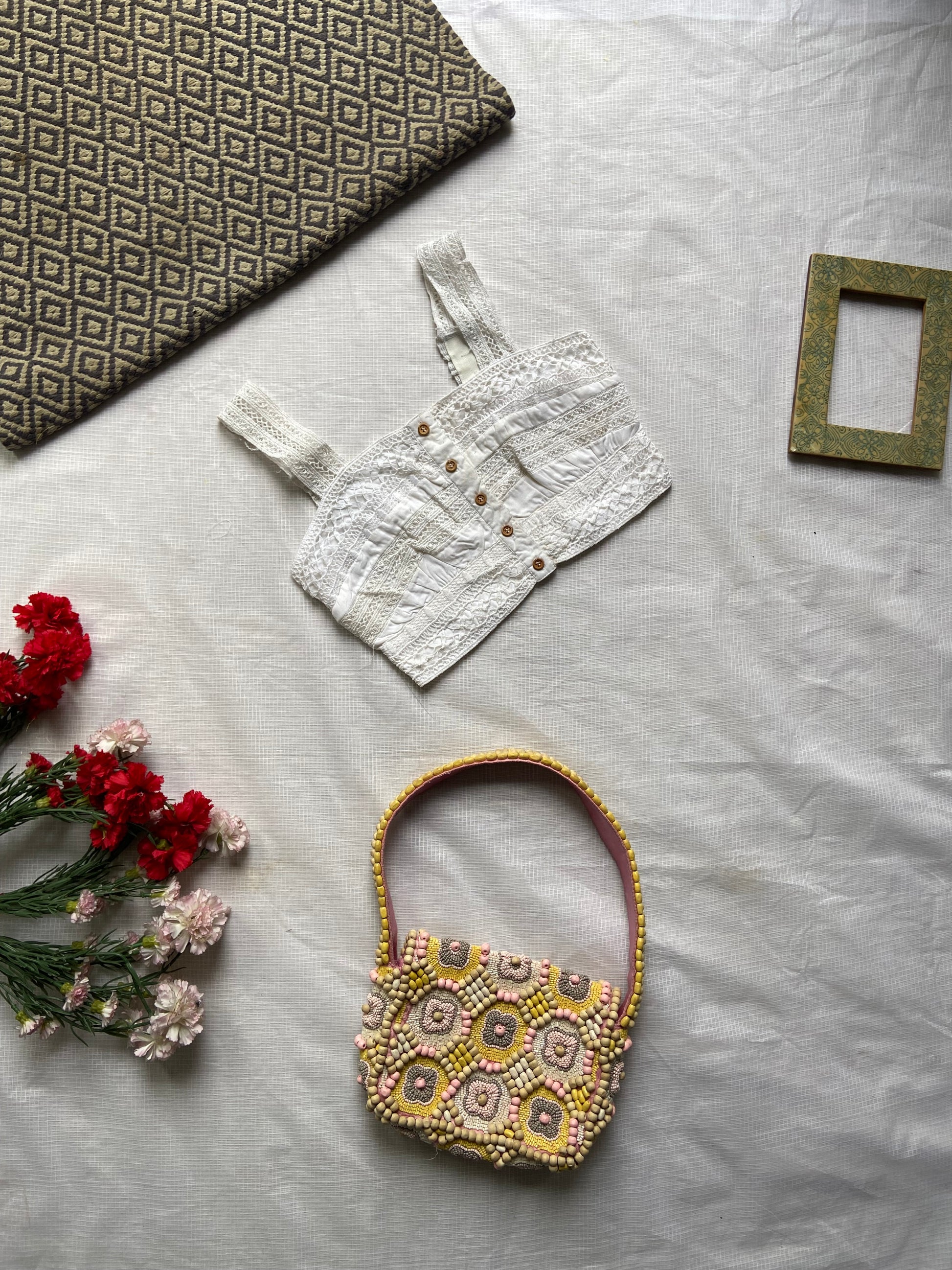 Handcrafted Beaded Floral Mini Bag with White Lace Crop Top
