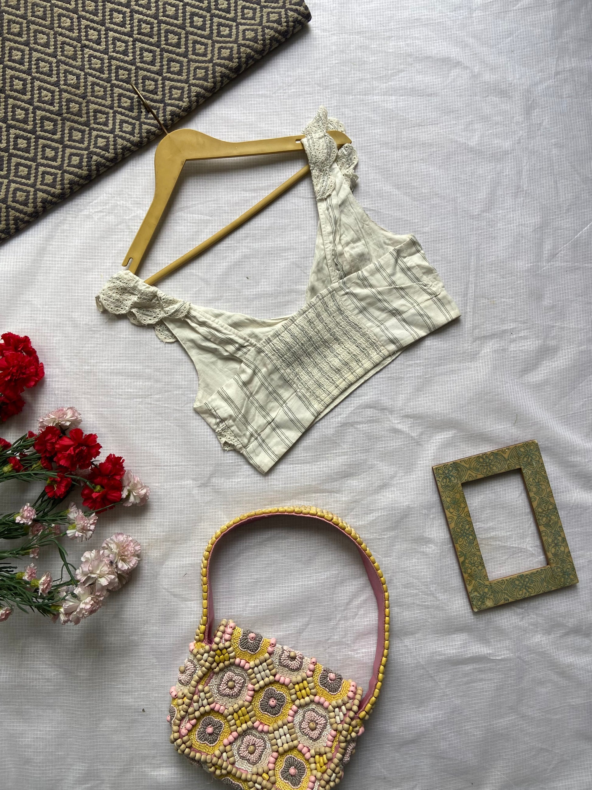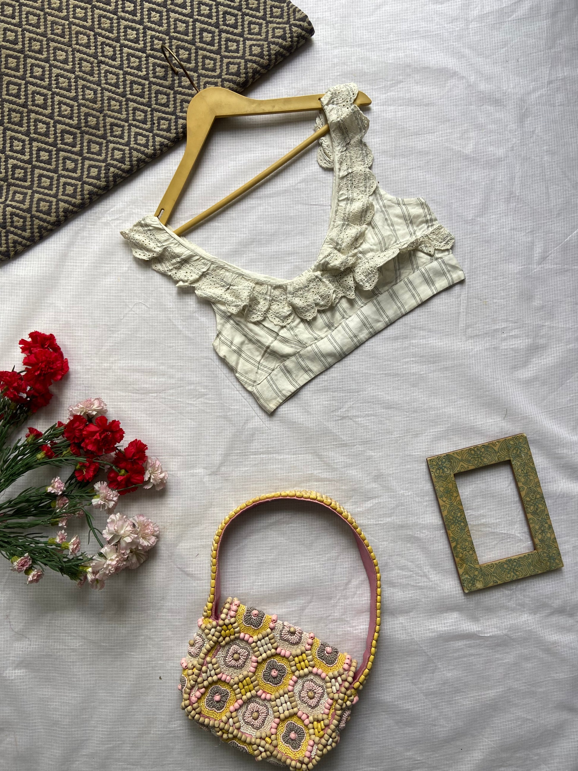 Channel timeless elegance with this vintage-inspired ruffle lace crop top, perfect for adding a touch of femininity to your everyday look. Crafted from soft, striped cotton fabric, this top features delicate broderie anglaise lace detailing along the neckline and straps, creating a romantic and charming silhouette. The cropped fit makes it ideal for pairing with high-waisted bottoms, whether you're styling it for a brunch date, picnic, or casual day out. Lightweight and breathable, it offers both comfort and effortless style.