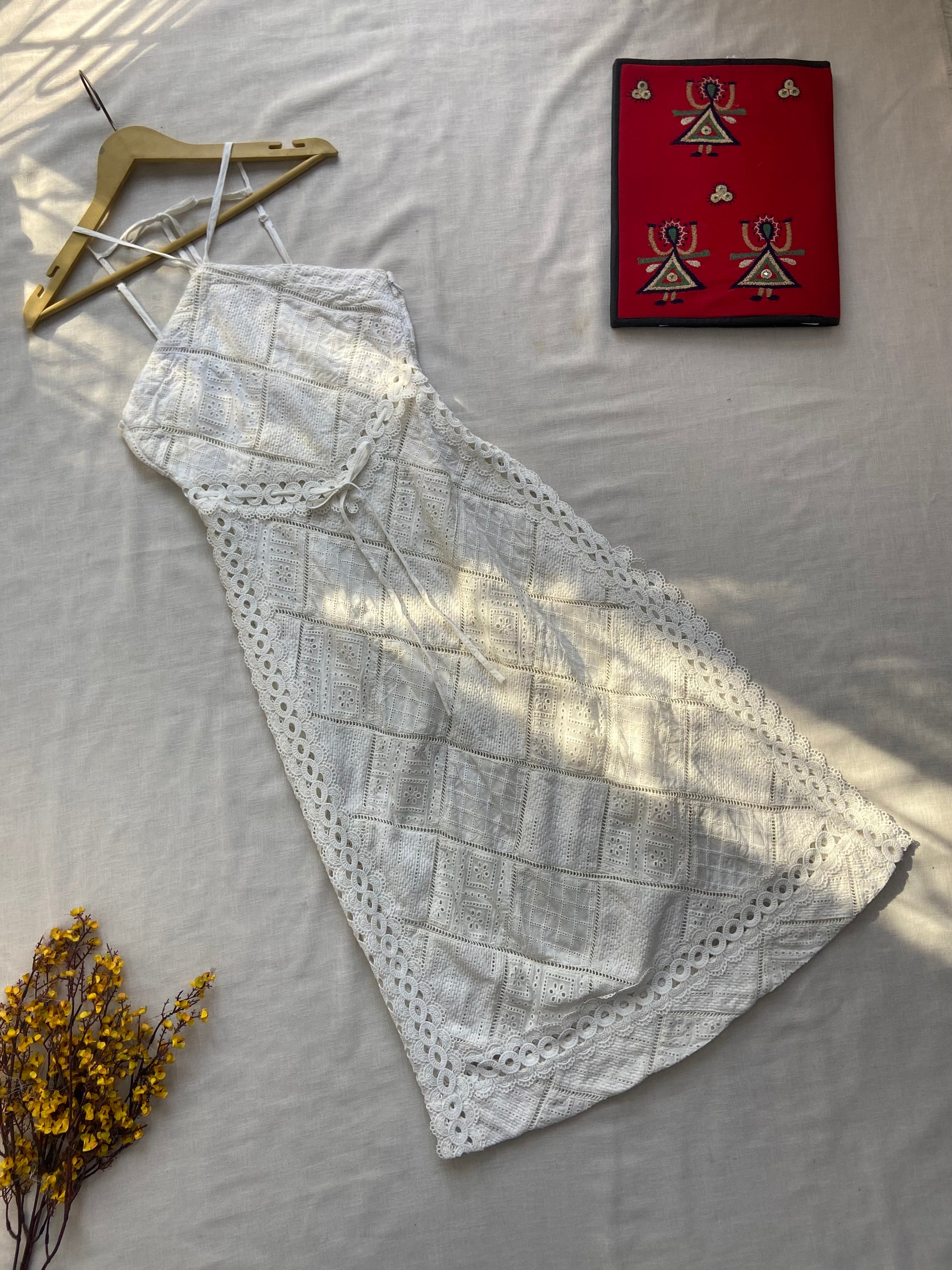 Step out in style with this Elegant White Lace Midi Dress, featuring intricate floral embroidery and delicate scalloped edges. Crafted from breathable, lightweight fabric, this dress offers both comfort and sophistication. Perfect for summer outings, casual events, or special occasions, its adjustable straps and flattering silhouette ensure a perfect fit. Elevate your wardrobe with this timeless, versatile piece that pairs effortlessly with your favorite accessories.