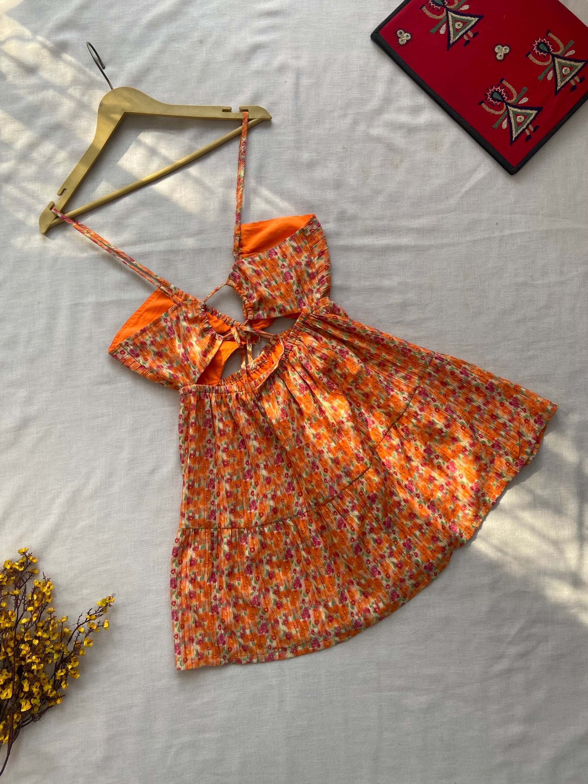 Glow with playful charm in the Apricot Garden Bow Mini Dress. Featuring delicate shoulder straps and a front bow accent, this mini dress sparkles with a vibrant allover print of apricot orange, yellow, and coral flowers atop a soft white base. Its flattering fitted bodice and flared skirt offer breezy movement, making it a fantastic choice for daytime outings, picnics, or summer getaways.