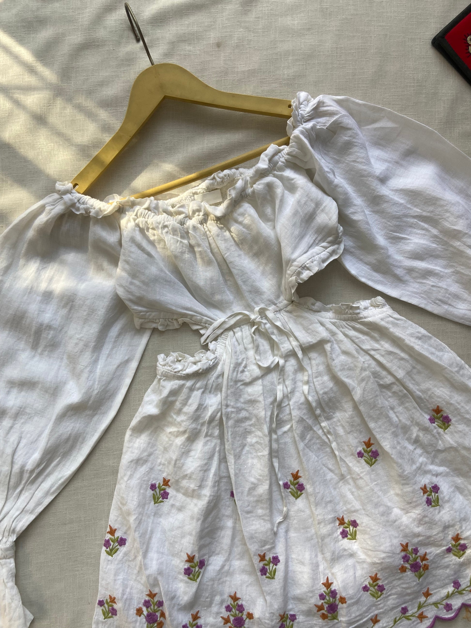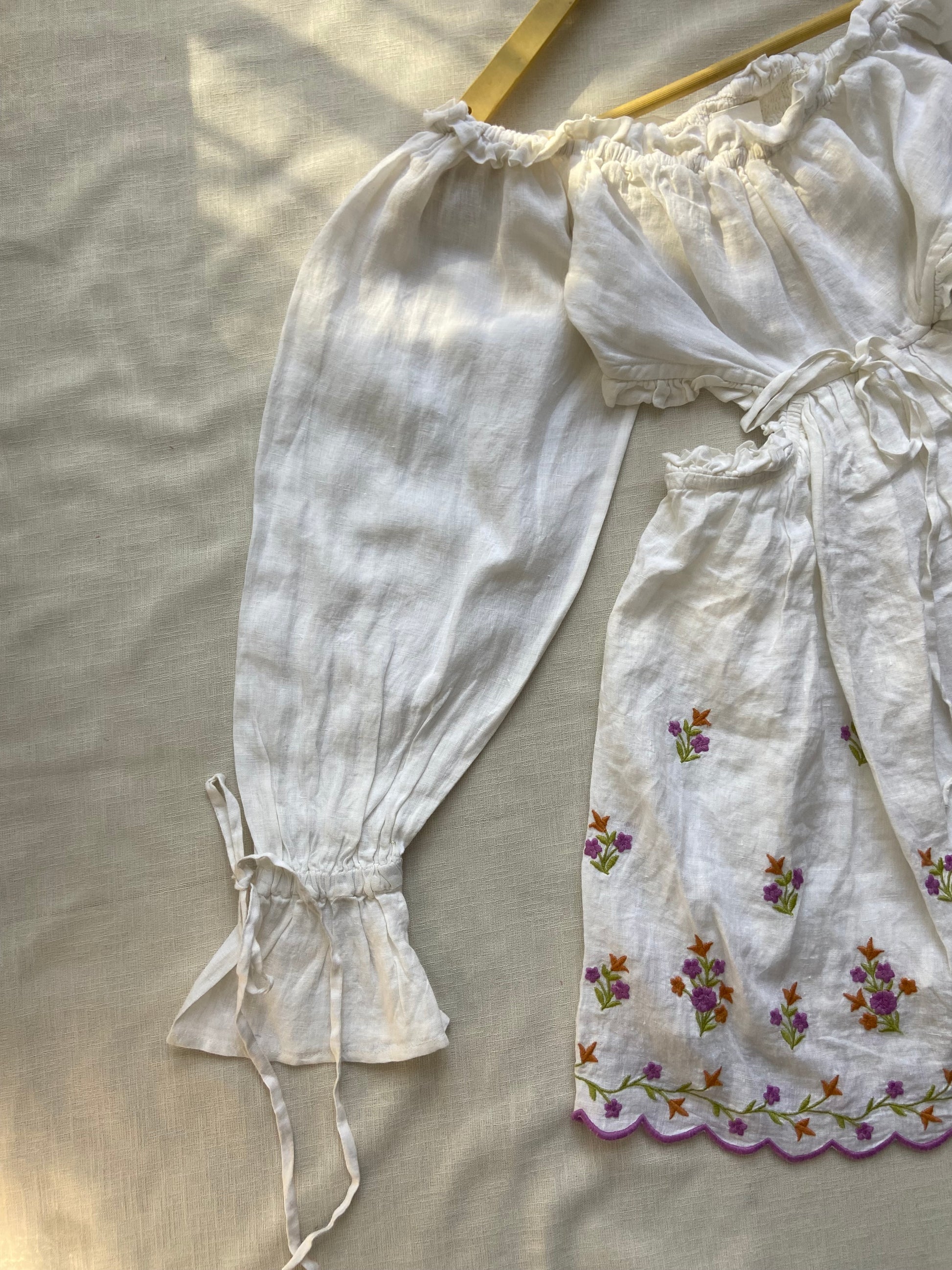 Elevate your wardrobe with this elegant white peasant top featuring delicate floral embroidery and voluminous puff sleeves. Crafted from lightweight, breathable fabric, this top offers a comfortable and flattering fit with its cinched waist and ruffled cuffs. Perfect for casual outings or festive occasions, its intricate detailing and timeless design bring a touch of boho-chic sophistication to any outfit. Pair it with jeans or skirts for an effortlessly stylish look.