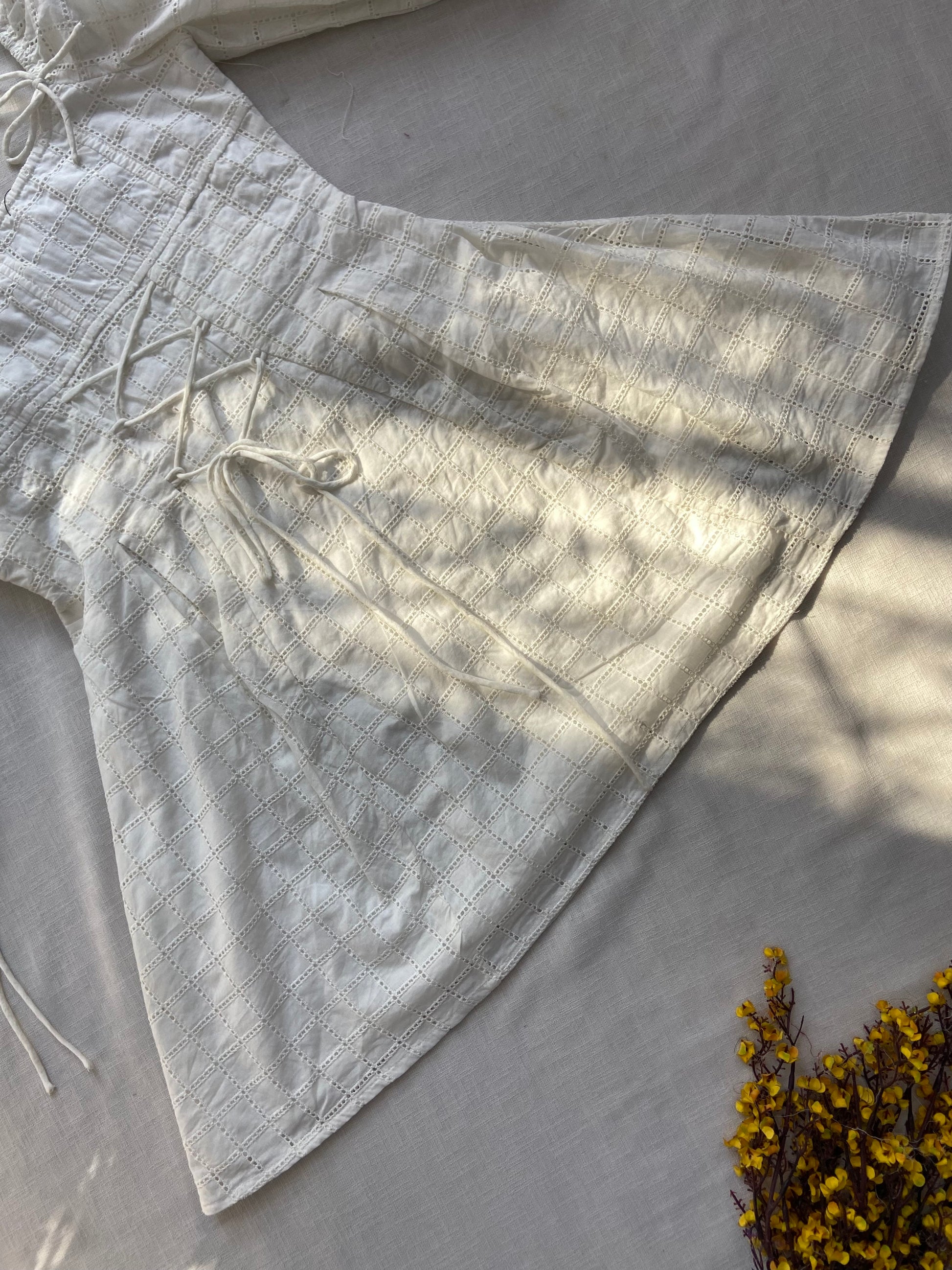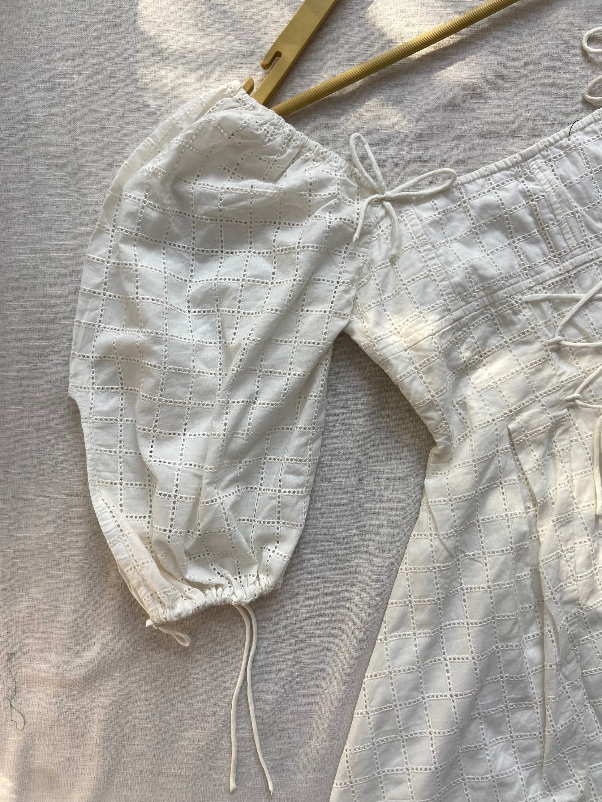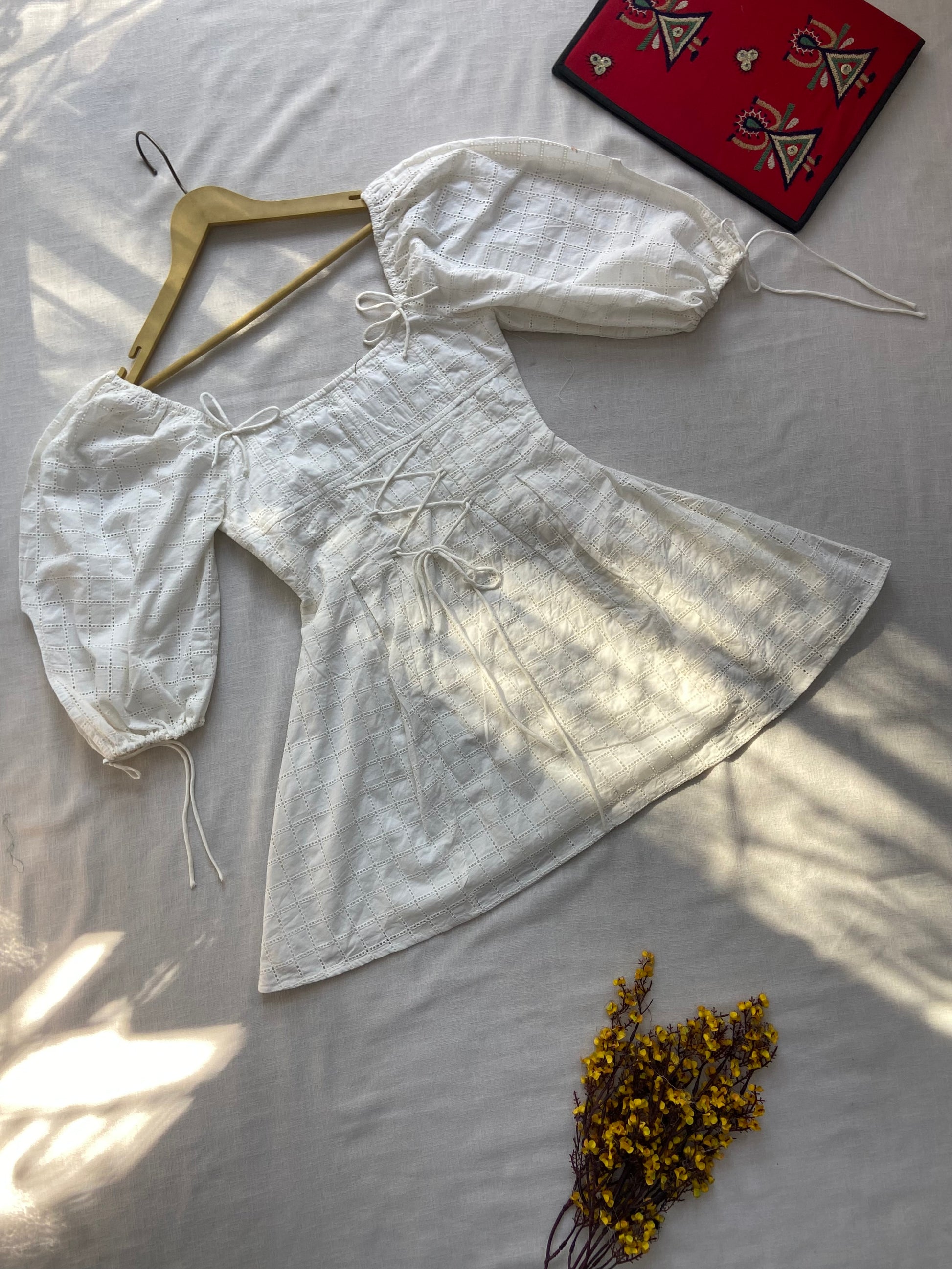 Step into effortless style with this Elegant White Puff Sleeve Eyelet Dress. Crafted from breathable, lightweight fabric featuring delicate eyelet detailing, this dress offers a perfect blend of comfort and sophistication. The puff sleeves and fitted waist create a flattering silhouette, ideal for casual outings or special occasions. Adjustable ties at the neckline and sleeves add a customizable touch, ensuring a perfect fit. Elevate your wardrobe with this timeless, versatile piece that embodies charm and elegance.