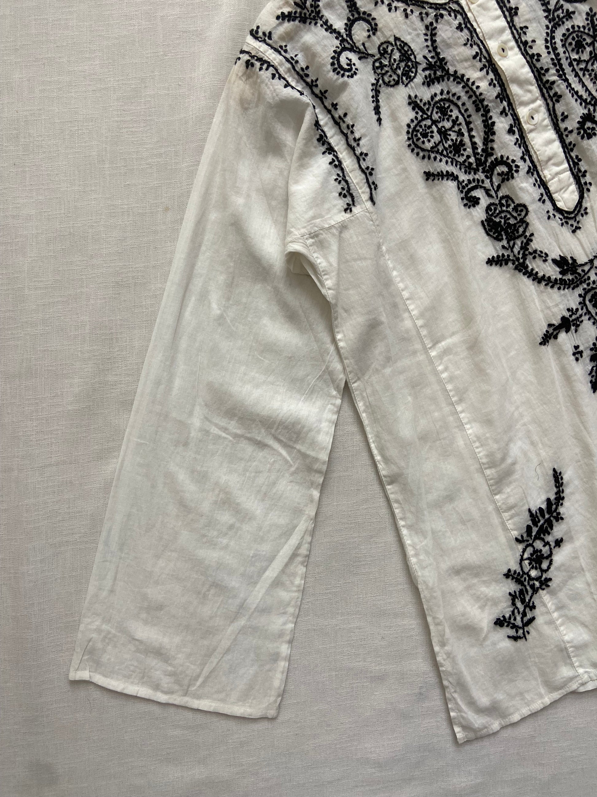 Embrace a classic fusion look with the Midnight Leaf Embroidered Tunic Top. This piece highlights delicate black foliage-inspired embroidery along the neckline, yoke, and sleeves, set against a pure white base for striking visual contrast. The hip-length silhouette with straight three-quarter sleeves and gentle flare makes it perfect for everyday wear—pair effortlessly with jeans, trousers, or ethnic bottoms.