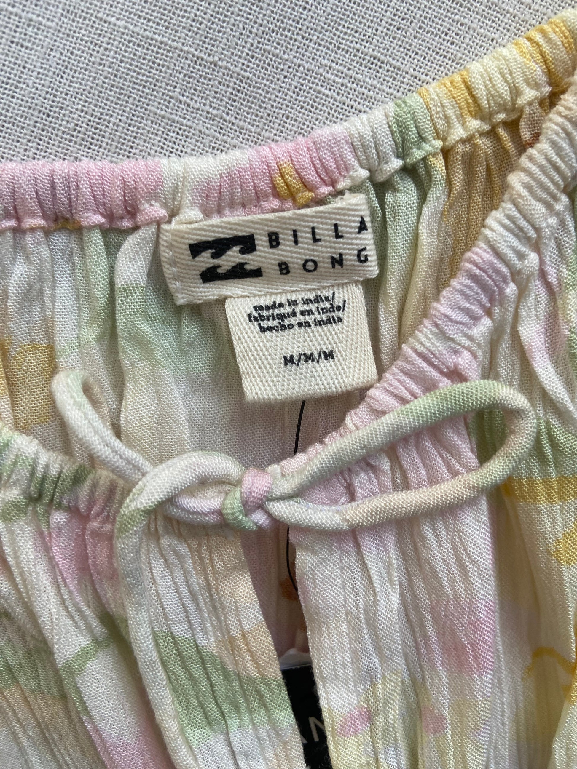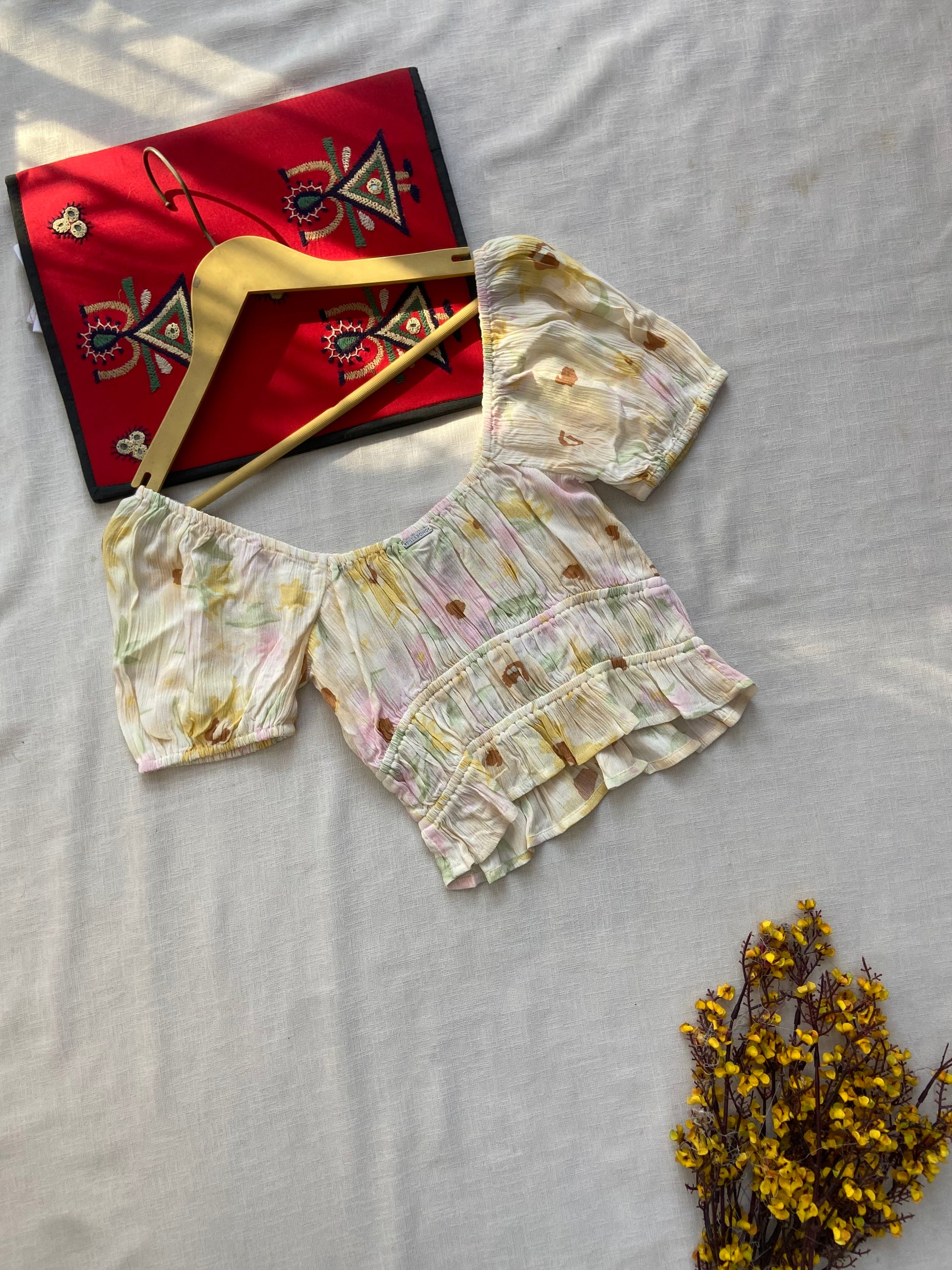 A delicate, lightweight crop top featuring soft pastel floral prints, puff sleeves, and a ruffled hem. Perfect for a casual summer look.