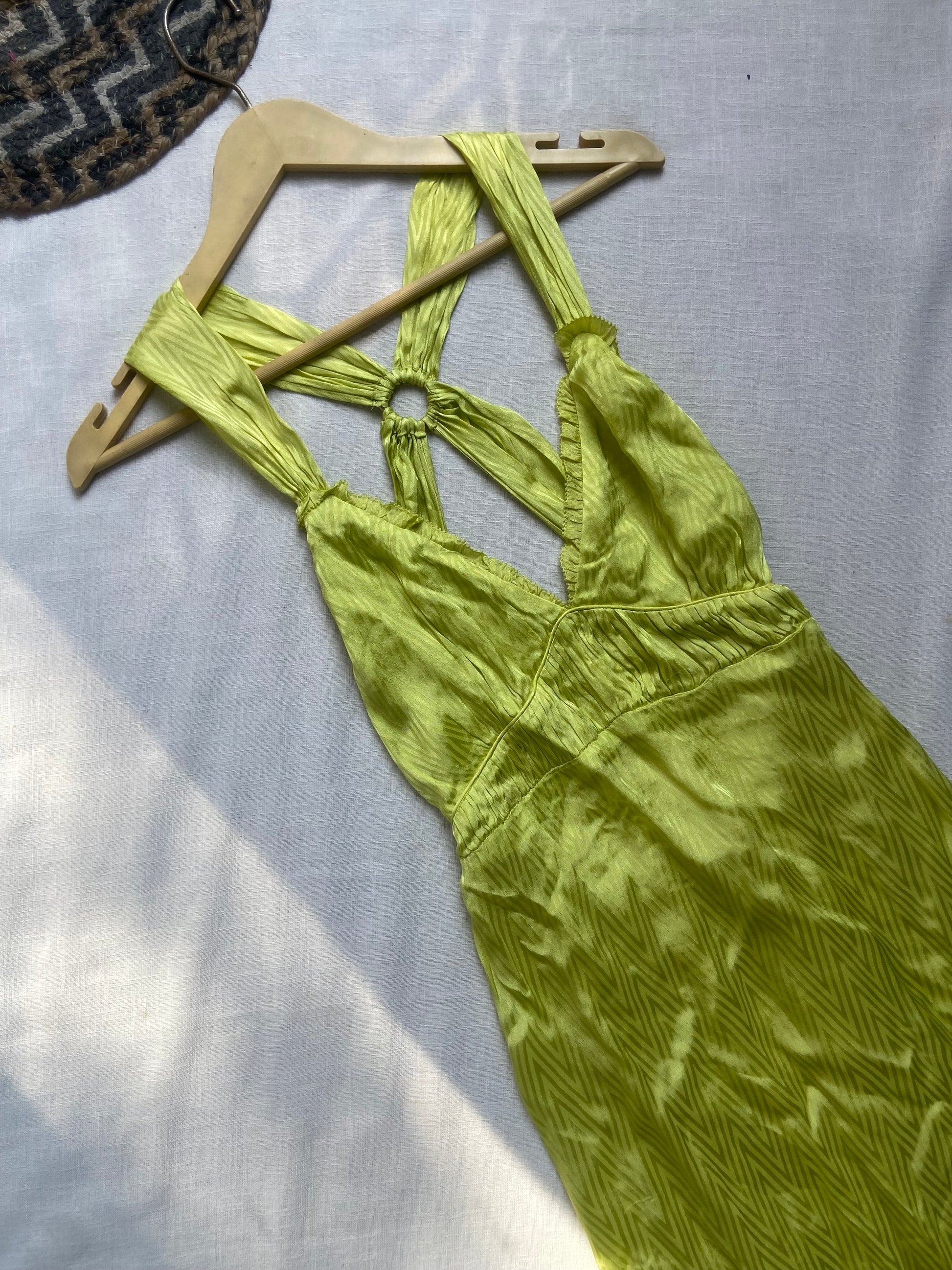 Turn heads in this vibrant lime green satin maxi dress, featuring a deep V-neckline, gathered bust, and a stylish criss-cross back with a ring detail. The flowy silhouette and subtle sheen make it perfect for beach vacations, summer parties, or evening outings. Light, breathable, and effortlessly glamorous.