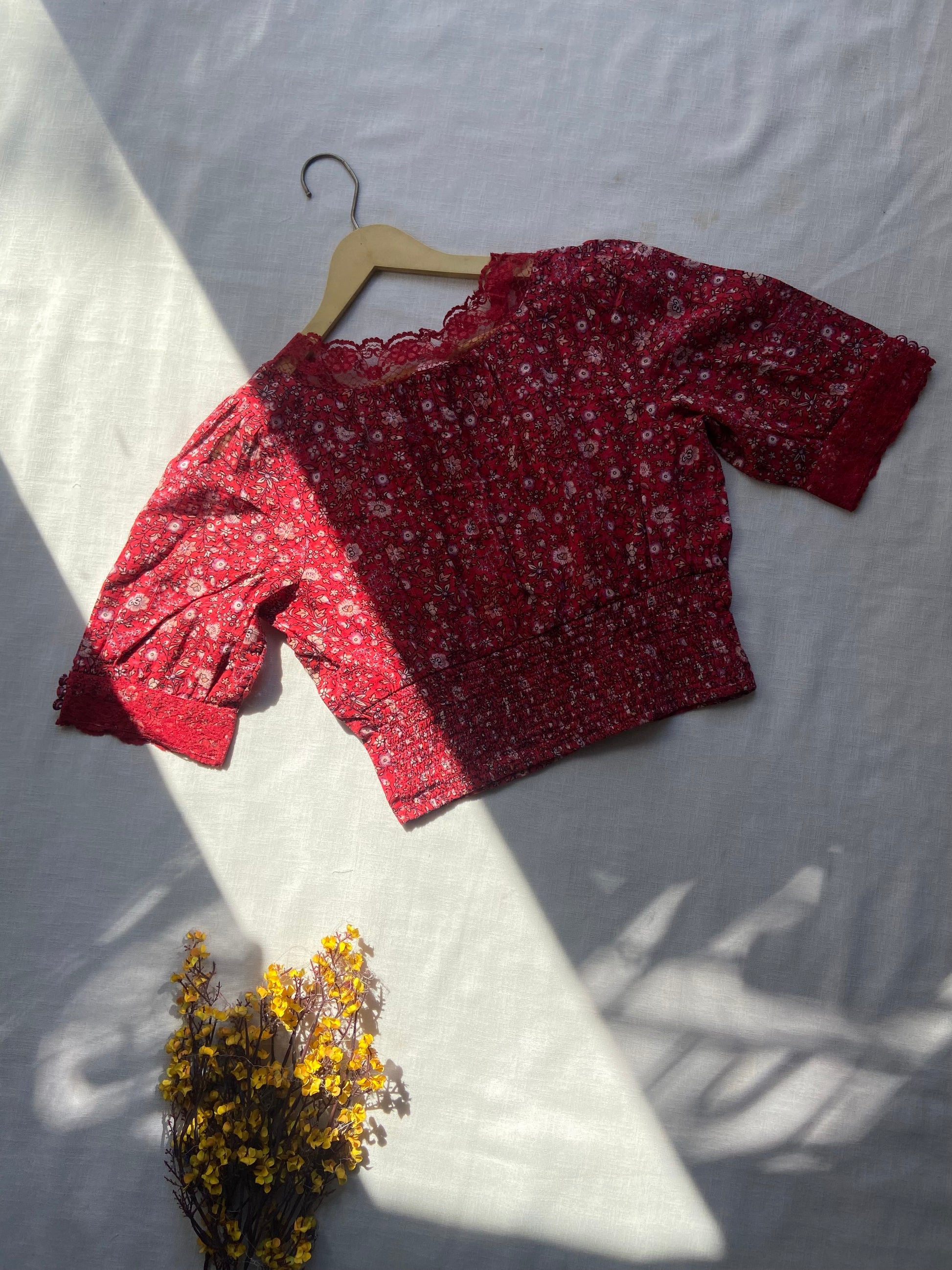 This red floral top features a romantic V-neckline with delicate lace trim and soft puff sleeves for a vintage-inspired look. The lightweight fabric and cropped fit make it perfect for casual outings, date nights, or festive occasions. Pair it with high-waisted jeans or skirts for effortless charm.