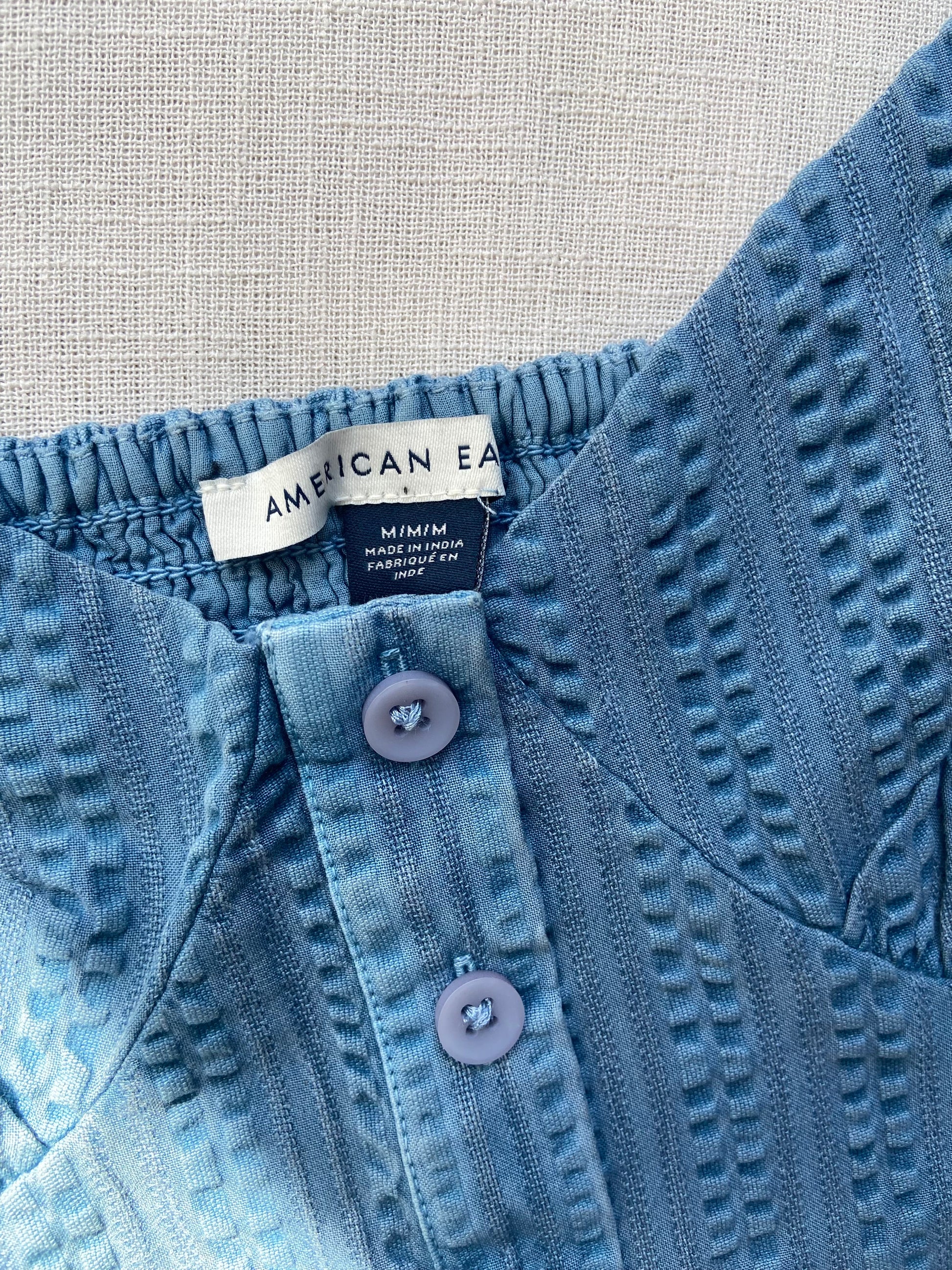 Blue Puff Sleeve Eyelet Button-Up Crop Top