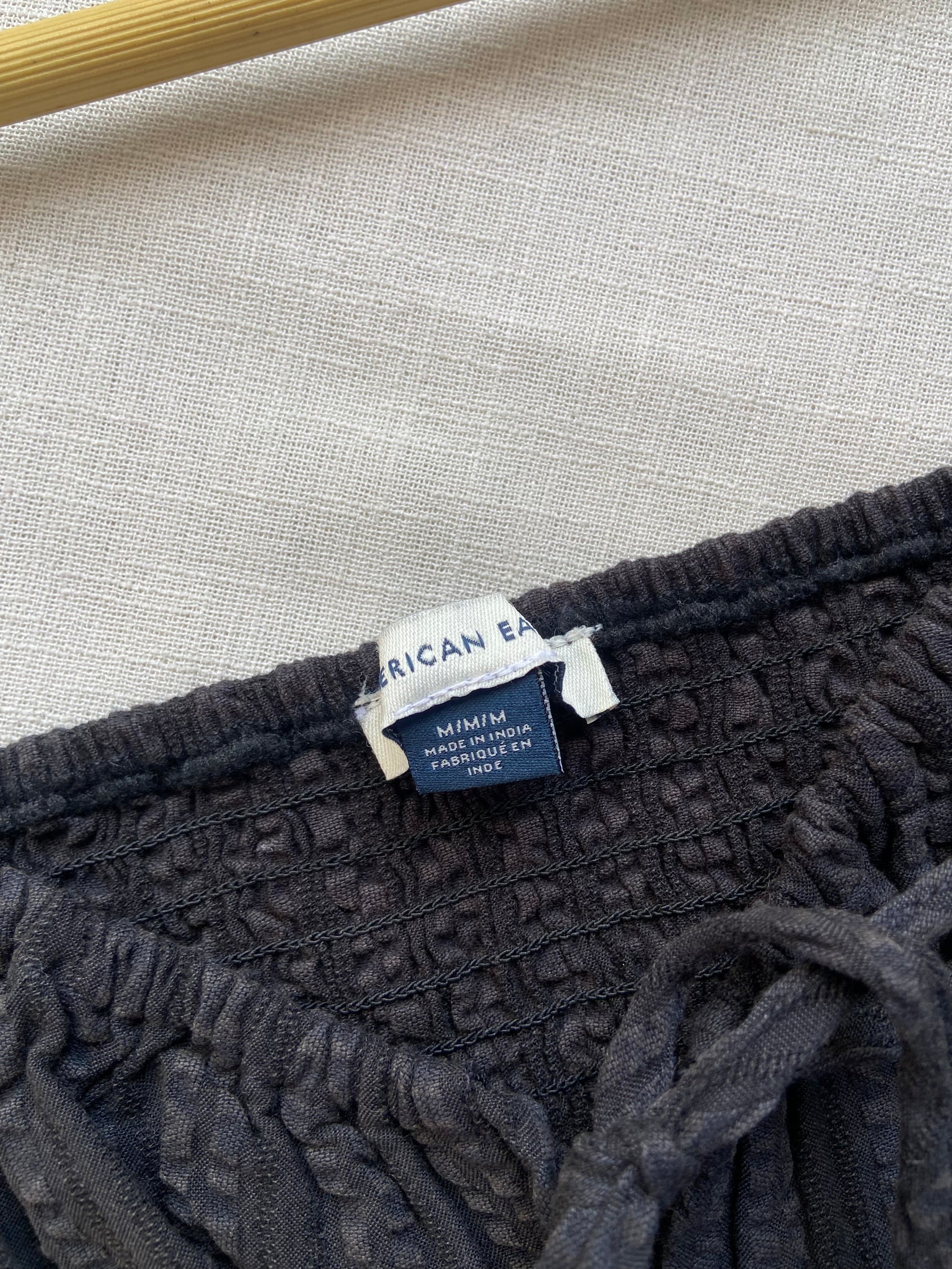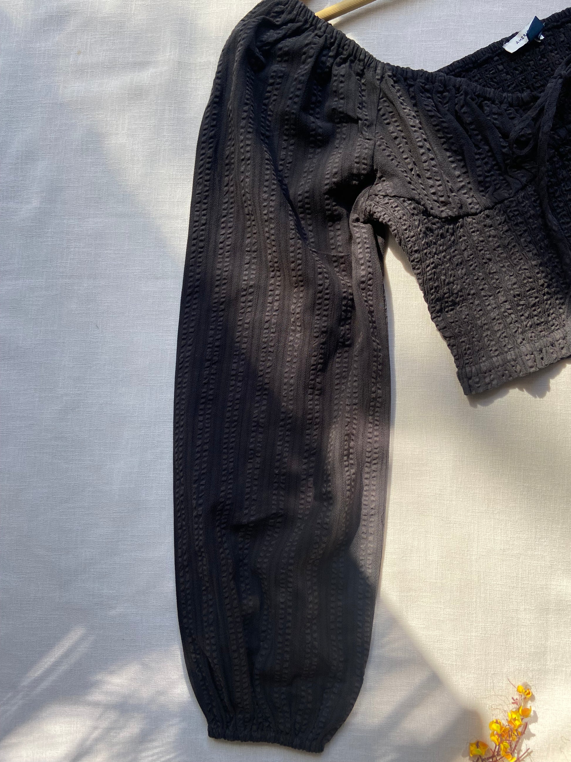 Stylish black crop top featuring an off-shoulder neckline and long puff sleeves. Made from textured fabric with a fitted smocked bodice for a flattering silhouette. Perfect for casual outings or evening wear.