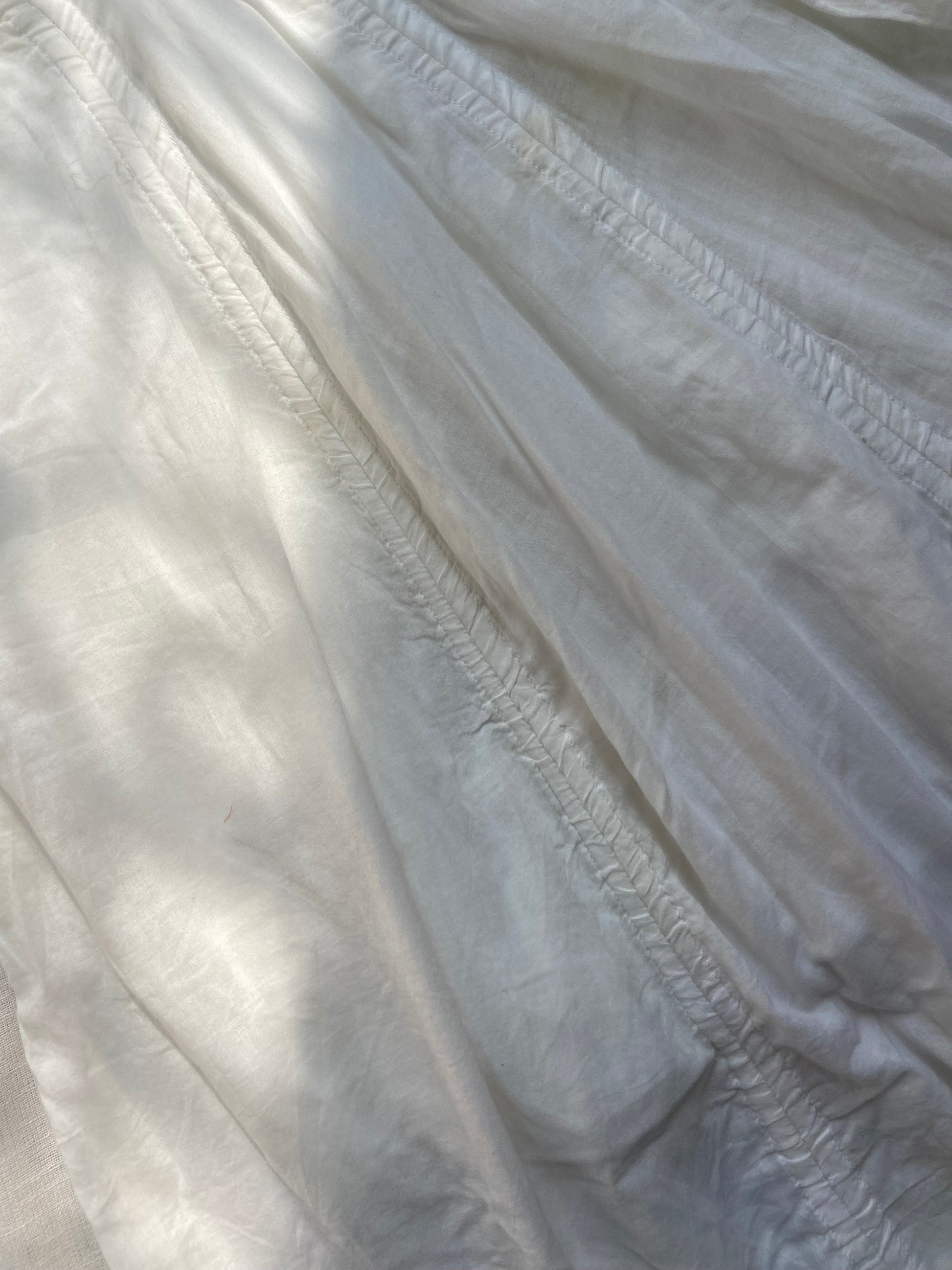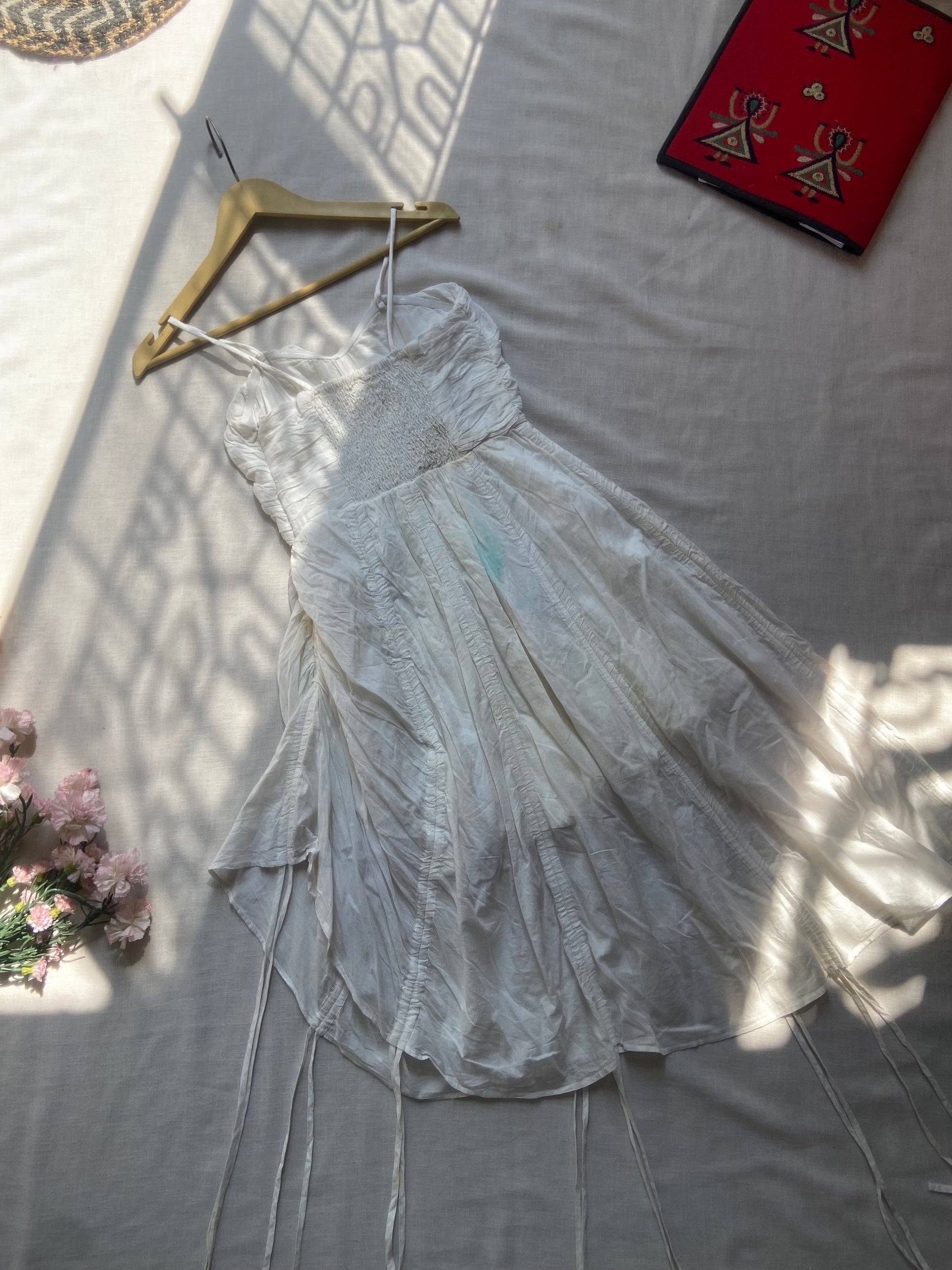 A light and airy white summer dress featuring delicate spaghetti straps and a ruched bodice. Perfect for casual outings or beach days, this dress combines comfort with effortless style.